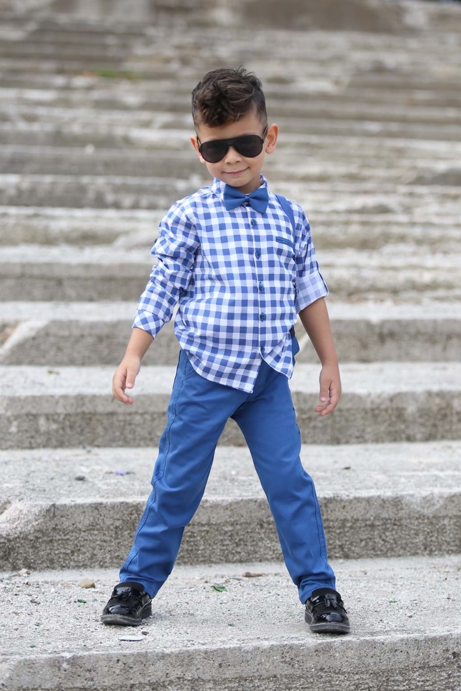 Ekose Desen Gabardin Pantolon Askılı Çocuk Takım MNK0436