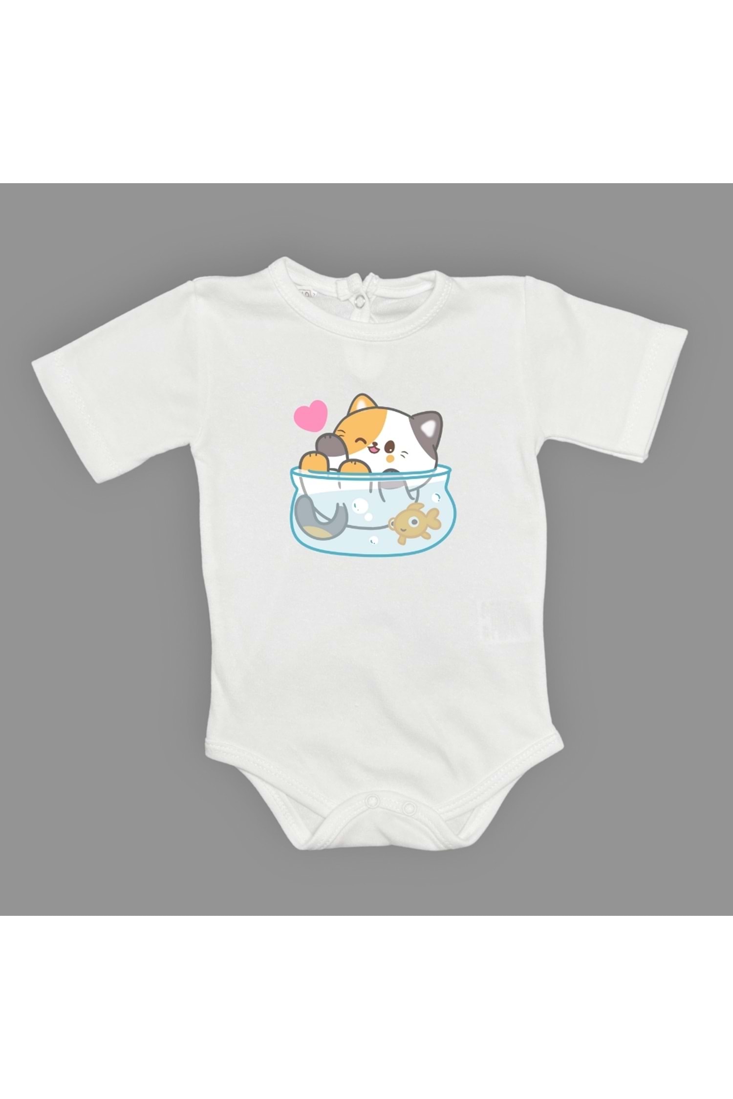 Akvaryum Kedi Baskılı Bebek Çıtçıtlı Body Uzun Kısa Kolsuz