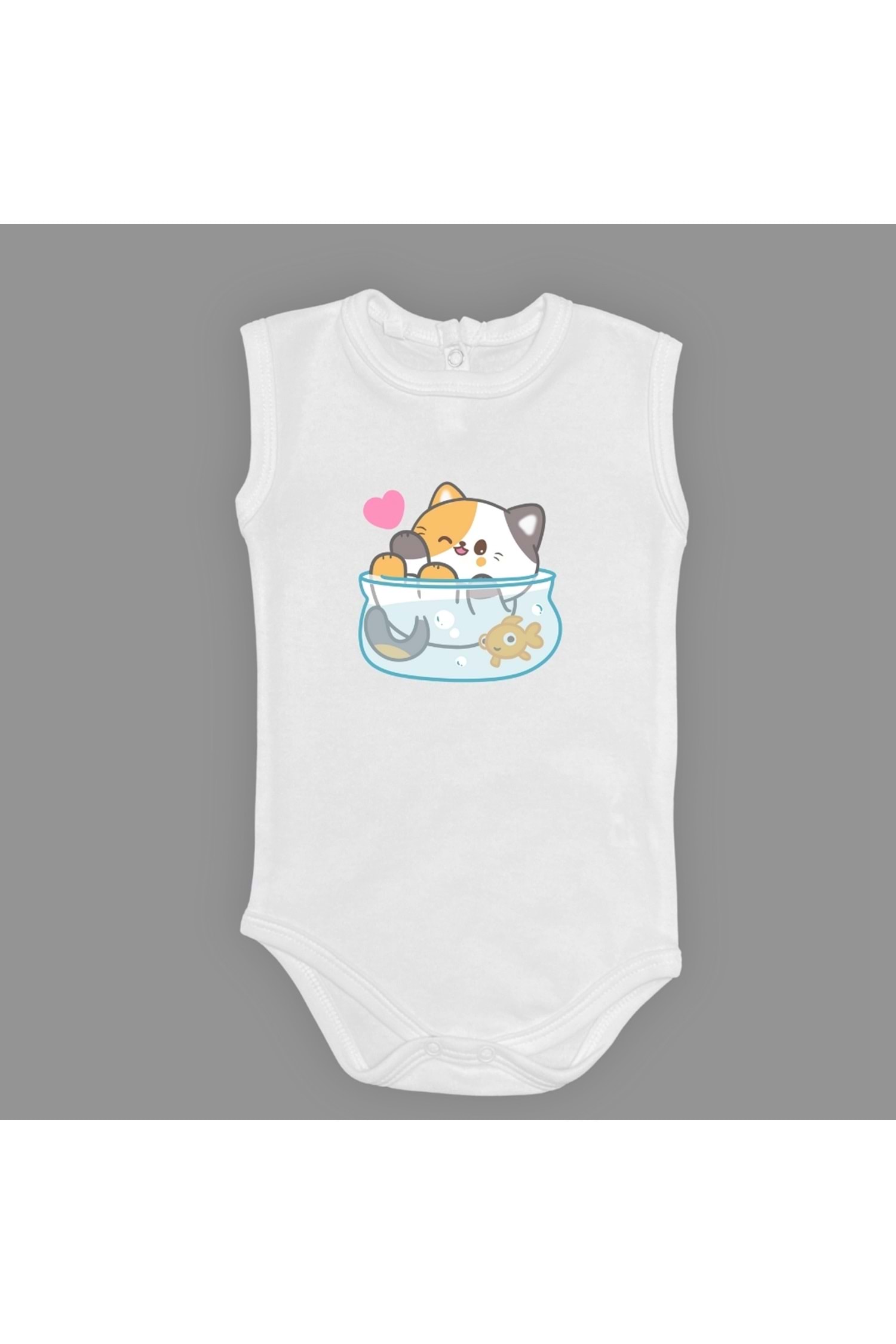 Akvaryum Kedi Baskılı Bebek Çıtçıtlı Body Uzun Kısa Kolsuz