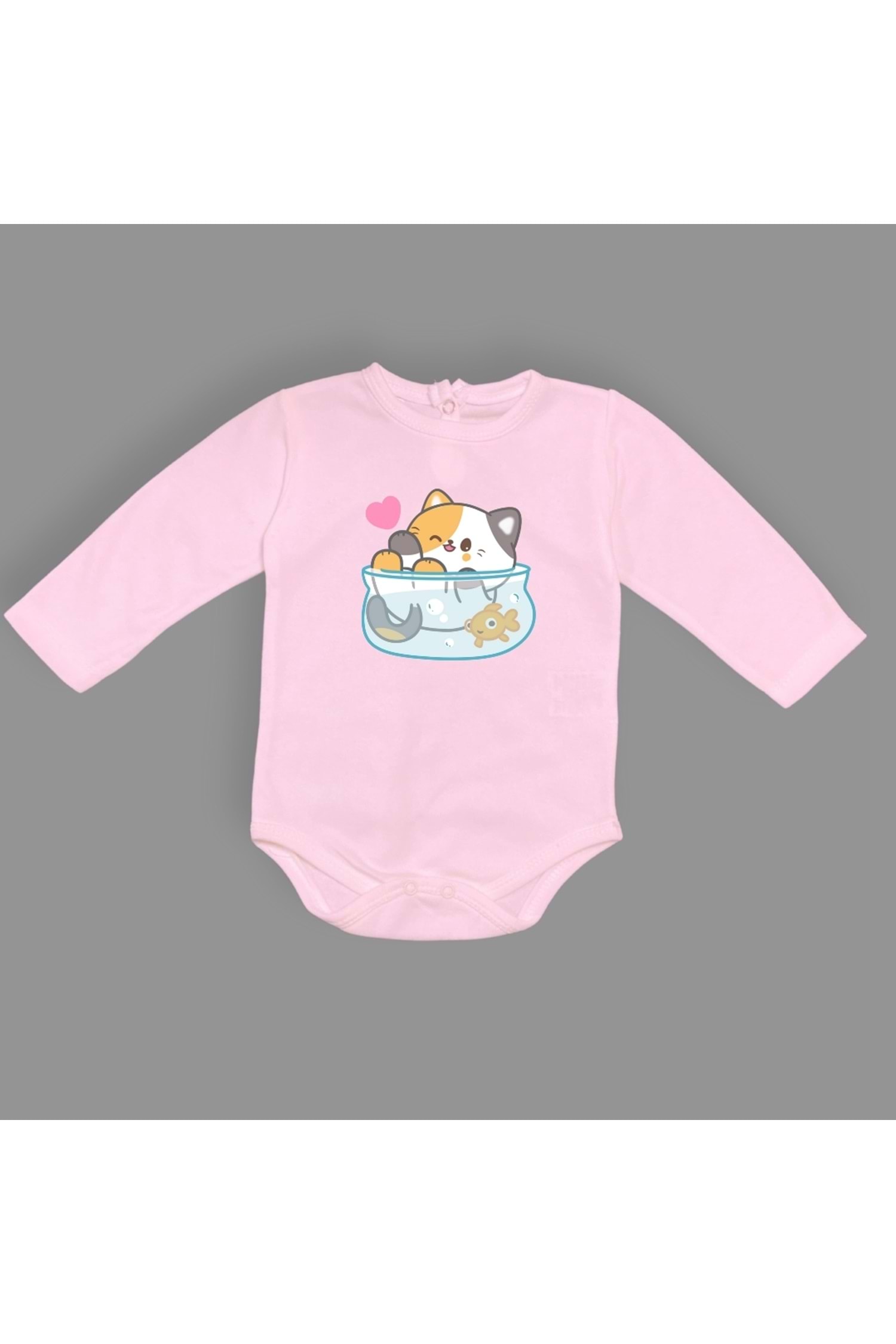 Akvaryum Kedi Baskılı Bebek Çıtçıtlı Body Uzun Kısa Kolsuz