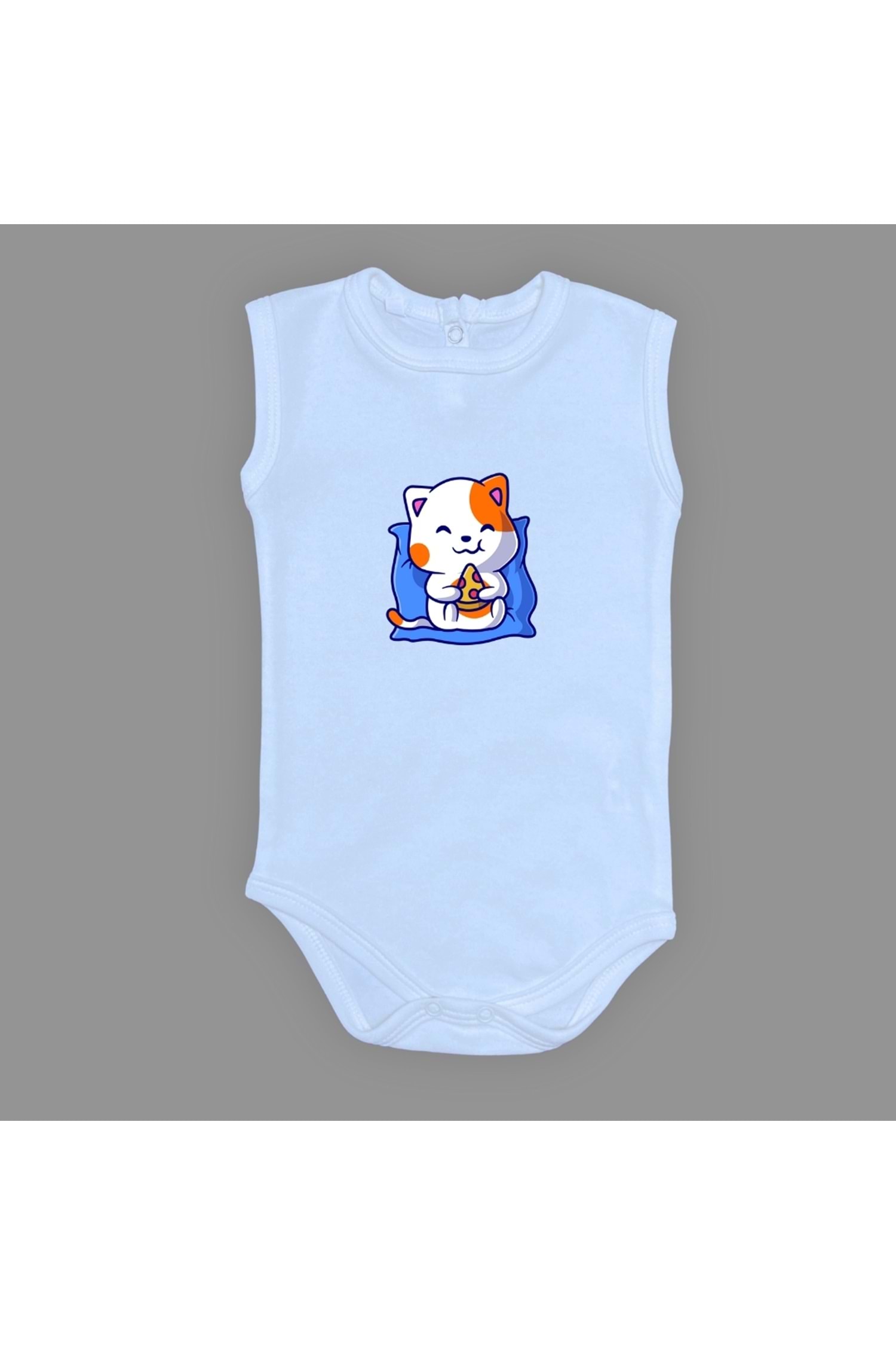 Baskılı Pizza Yiyen kedi Bebek Çıtçıtlı Body - MNK0662-AÇIK MAVİ-6 AY