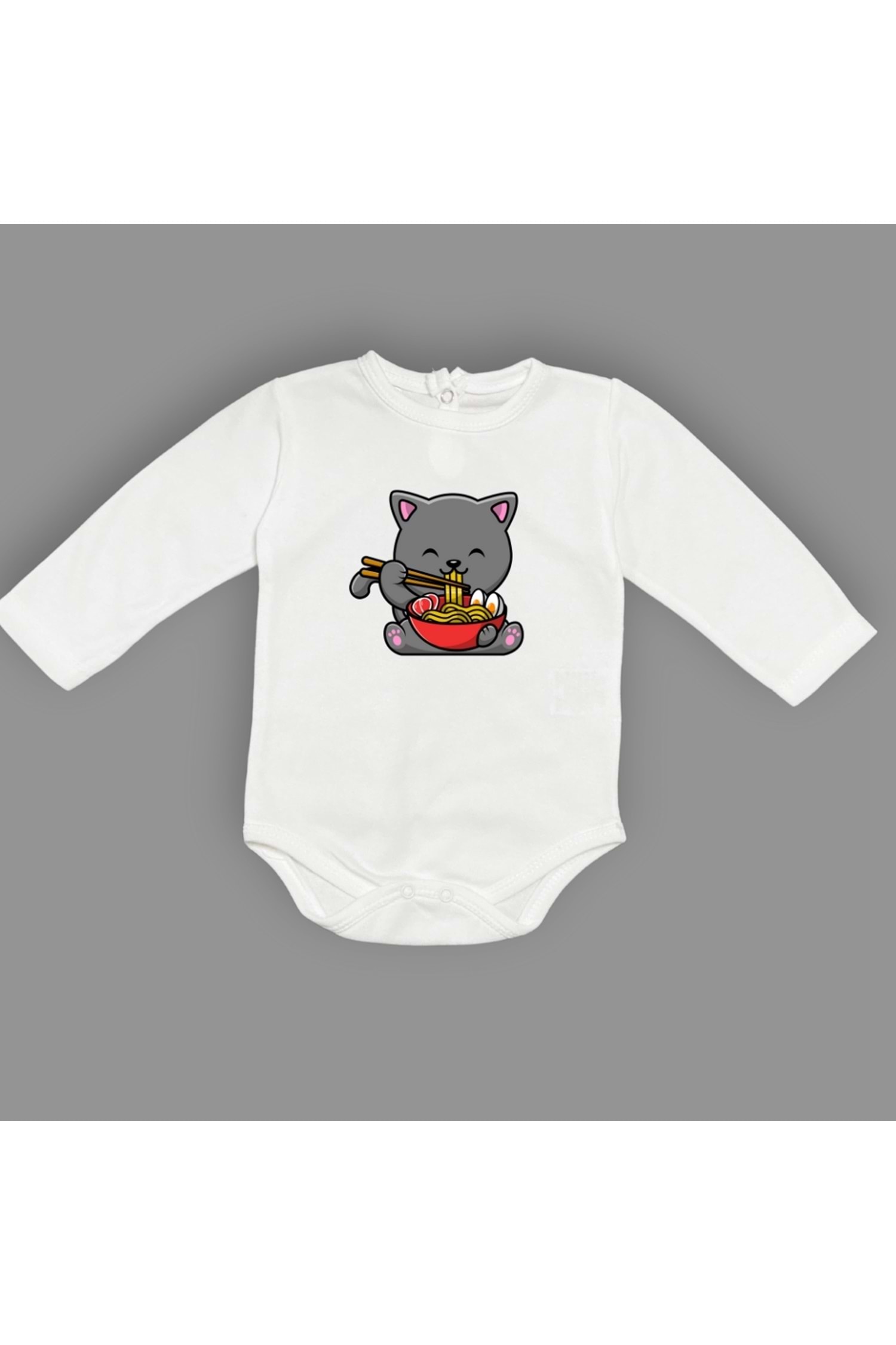 Yemek Yiyen Kedi Baskılı Bebek Çıtçıtlı Body Uzun Kısa Kolsuz