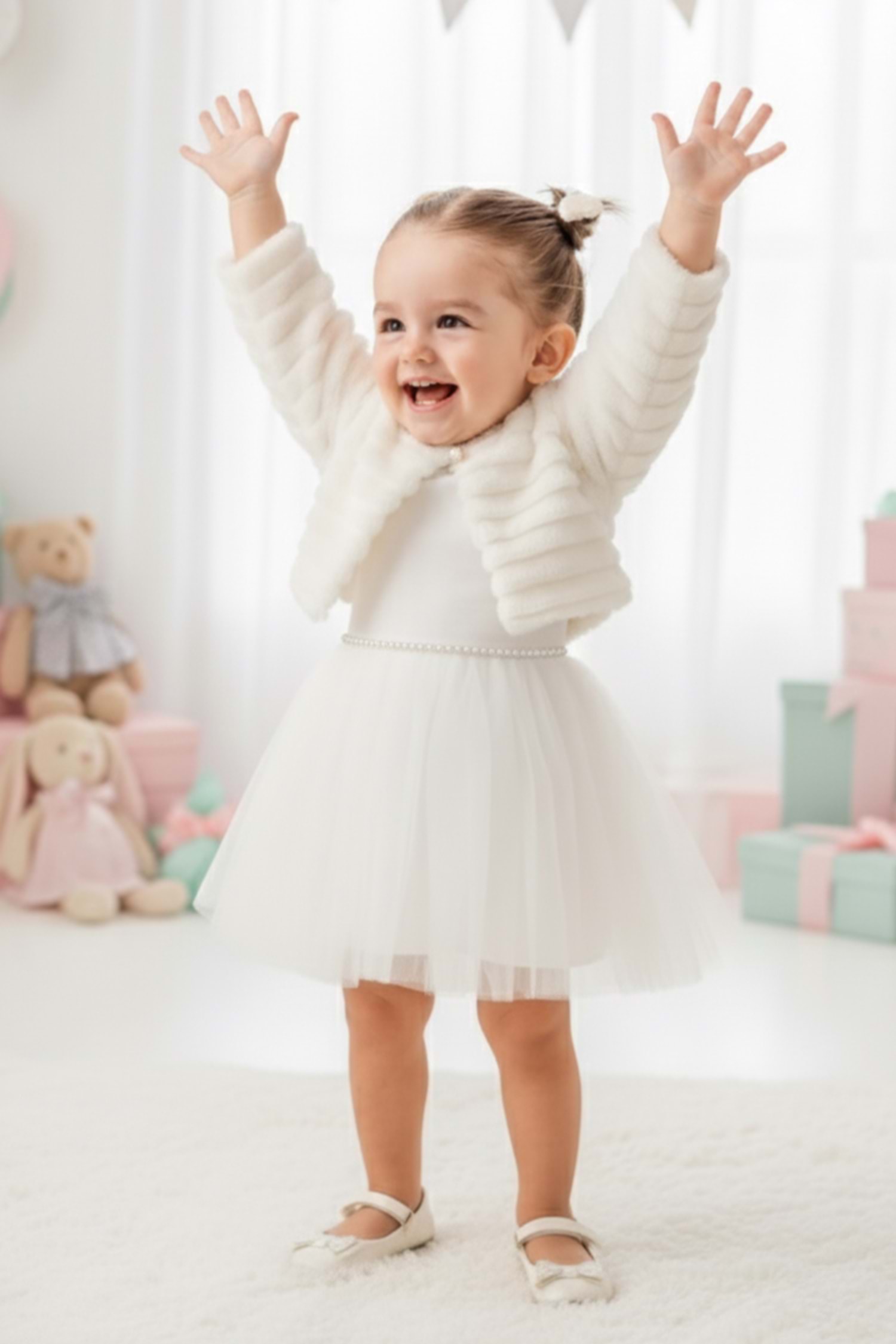 Şıklığı ve zarafeti bir arada sunan triko bolerolu kız bebek elbise modeli, minik prenseslerin özel günlerde parlaması için tasarlandı. Ekru renk elbisesi ve renkli tütü etek ile zarif bir bütünlük oluşturan bu model, hem klasik hem modern bir görünüm sunar.