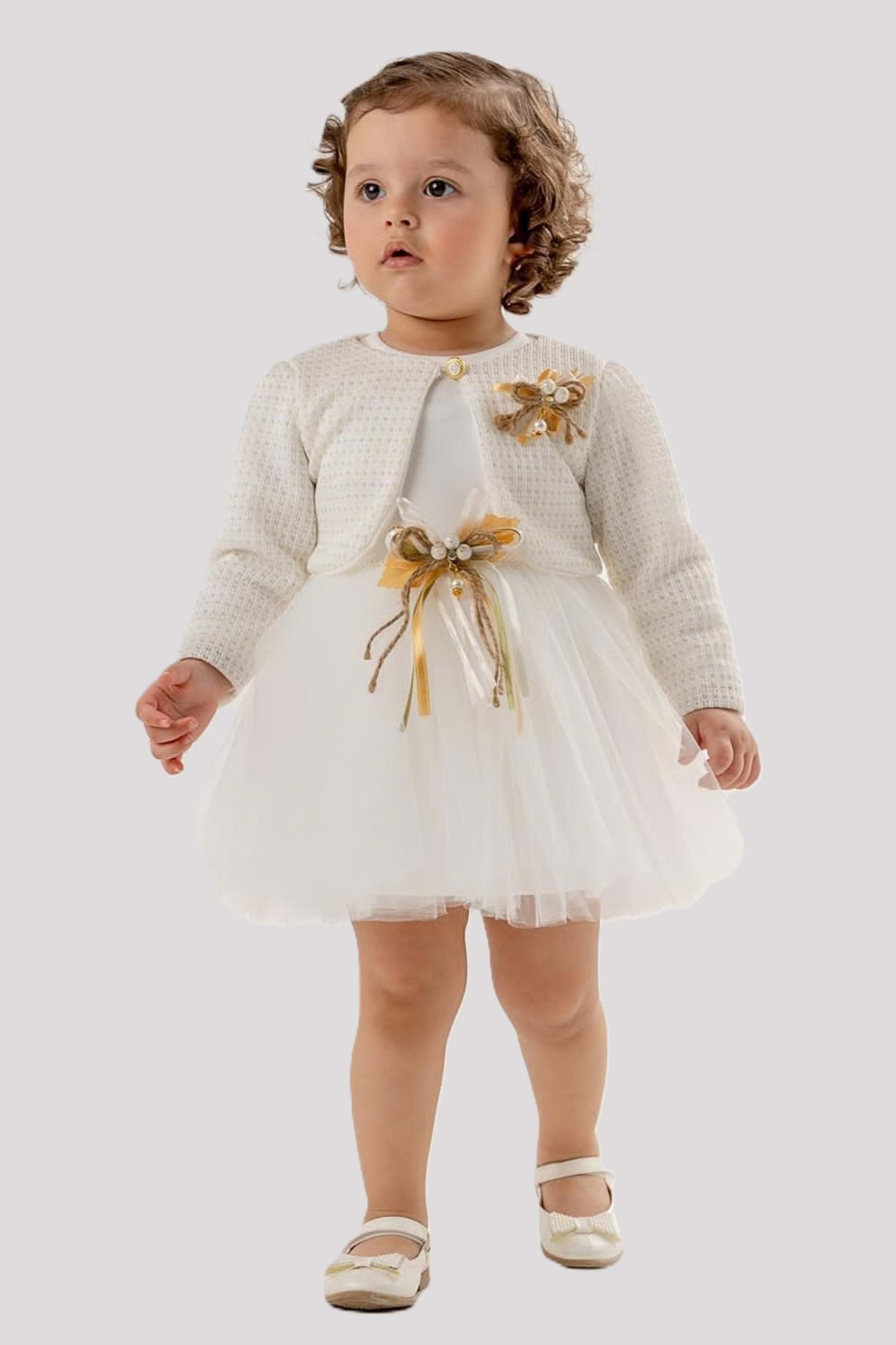 Şıklığı ve zarafeti bir arada sunan triko bolerolu kız bebek elbise modeli, minik prenseslerin özel günlerde parlaması için tasarlandı. Ekru renk elbisesi ve pudra tonlarında triko bolerosu ile zarif bir bütünlük oluşturan bu model, hem klasik hem modern bir görünüm sunar.