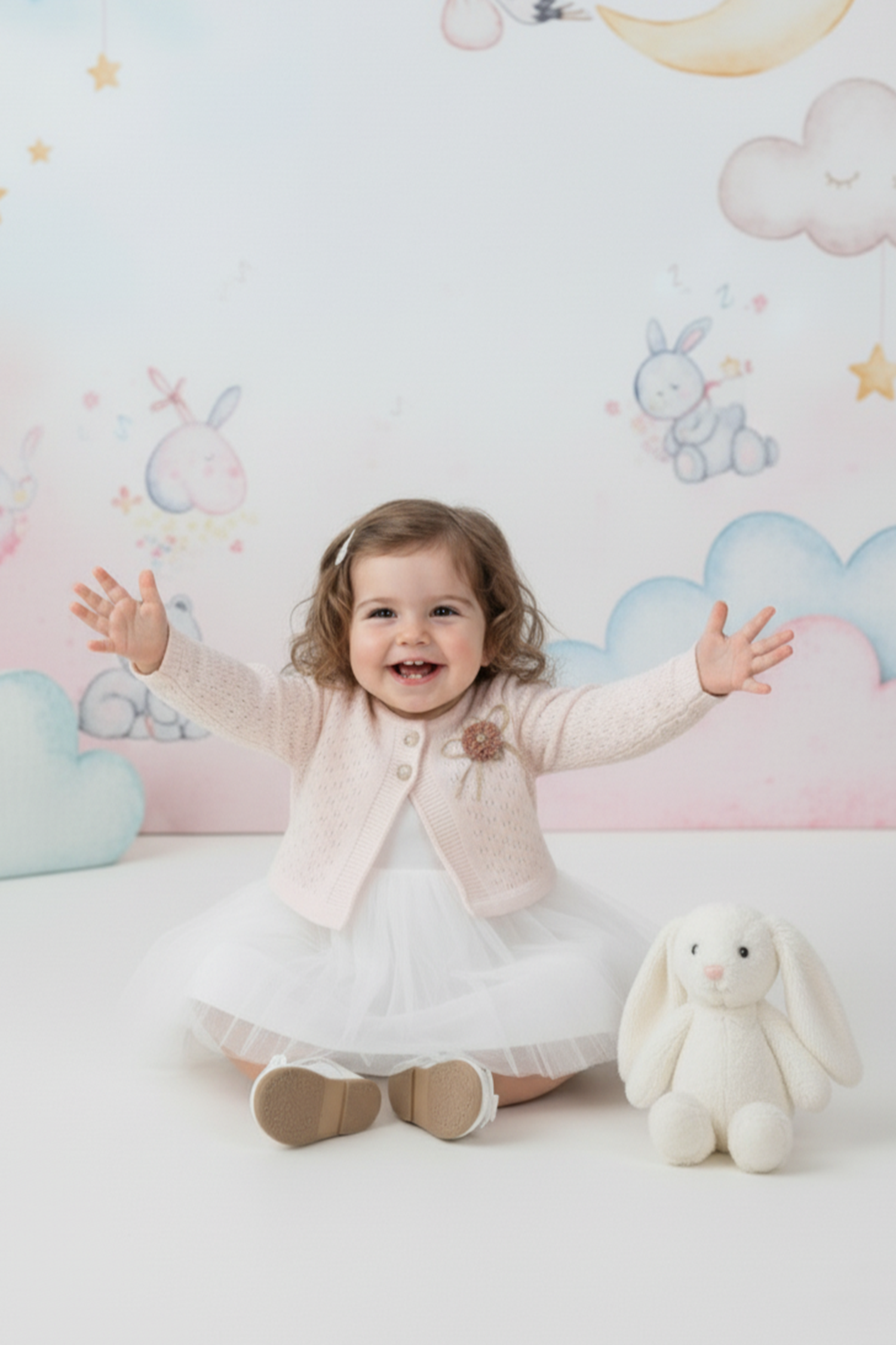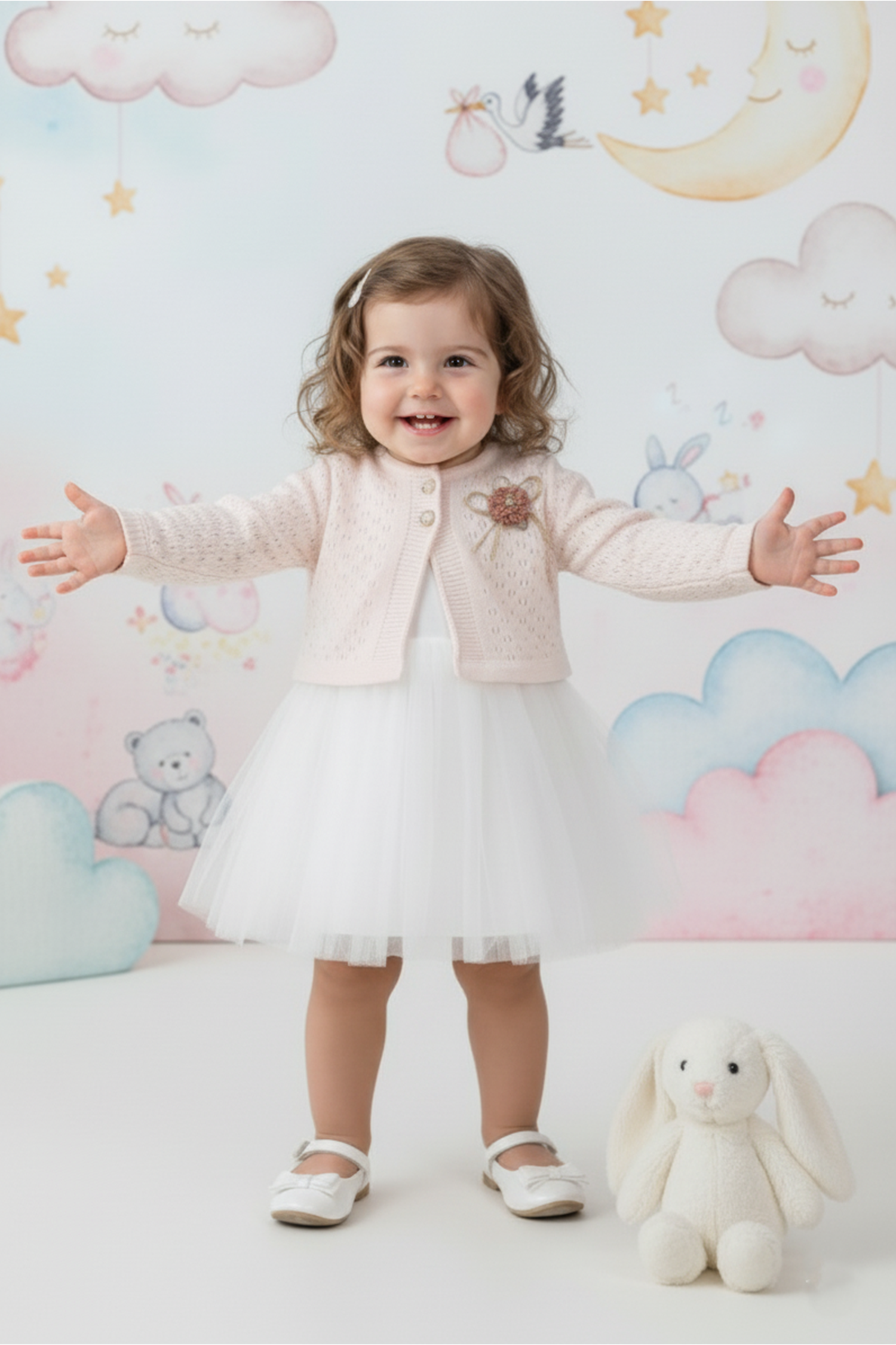 Şıklığı ve zarafeti bir arada sunan triko bolerolu kız bebek elbise modeli, minik prenseslerin özel günlerde parlaması için tasarlandı. Ekru renk elbisesi ve pudra tonlarında triko bolerosu ile zarif bir bütünlük oluşturan bu model, hem klasik hem modern bir görünüm sunar.