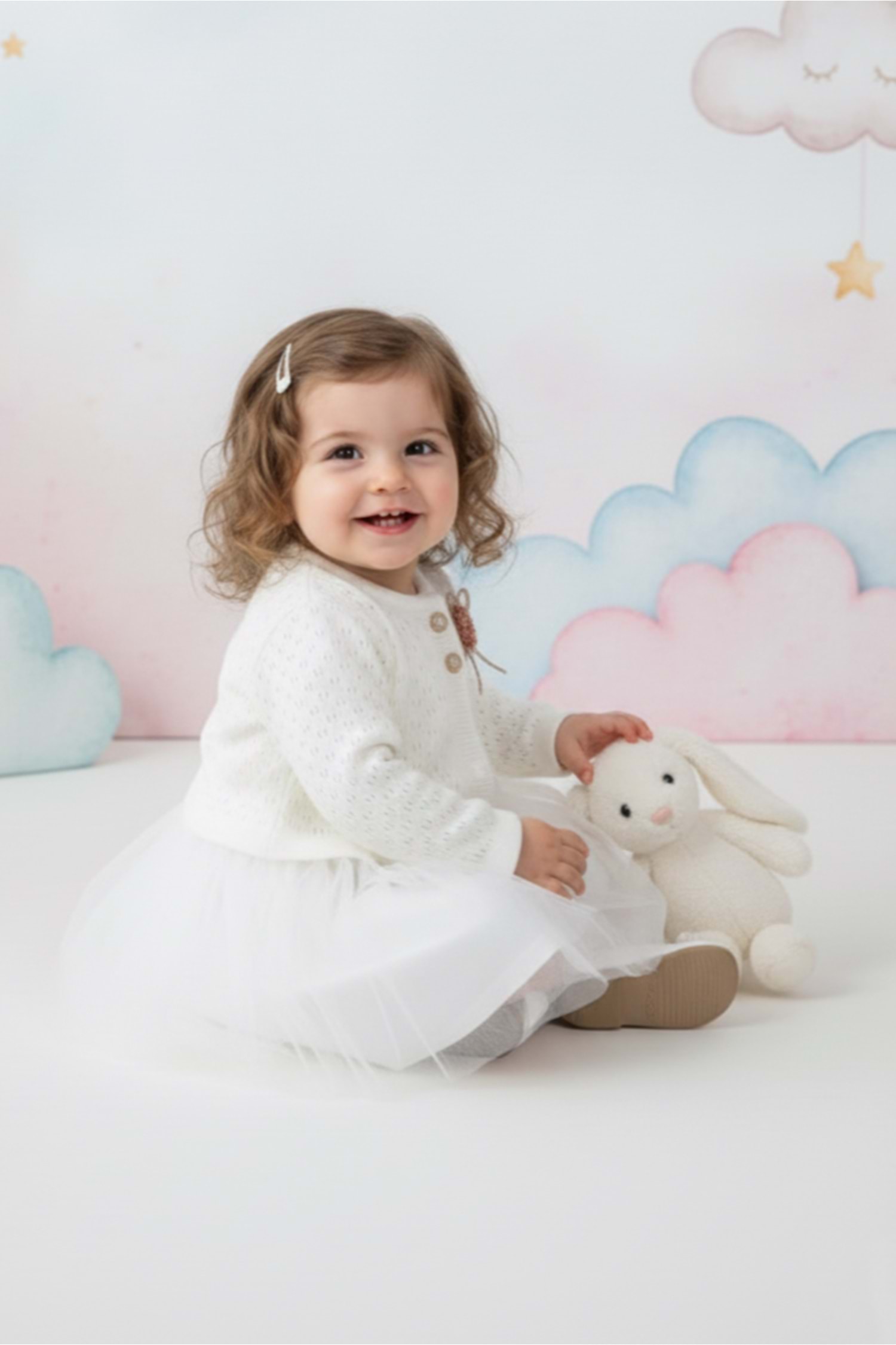 Şıklığı ve zarafeti bir arada sunan triko bolerolu kız bebek elbise modeli, minik prenseslerin özel günlerde parlaması için tasarlandı. Ekru renk elbisesi ve pudra tonlarında triko bolerosu ile zarif bir bütünlük oluşturan bu model, hem klasik hem modern bir görünüm sunar.