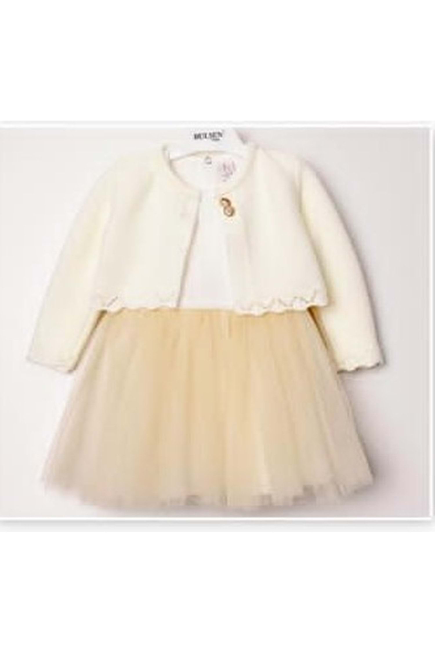 Şıklığı ve zarafeti bir arada sunan triko bolerolu kız bebek elbise modeli, minik prenseslerin özel günlerde parlaması için tasarlandı. Ekru renk elbisesi ve simli bolerosu ve renkli tütüsü ile zarif bir bütünlük oluşturan bu model, hem klasik hem modern bir görünüm sunar.