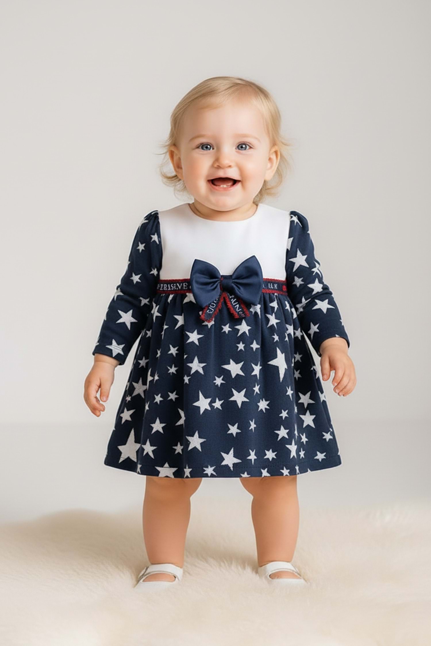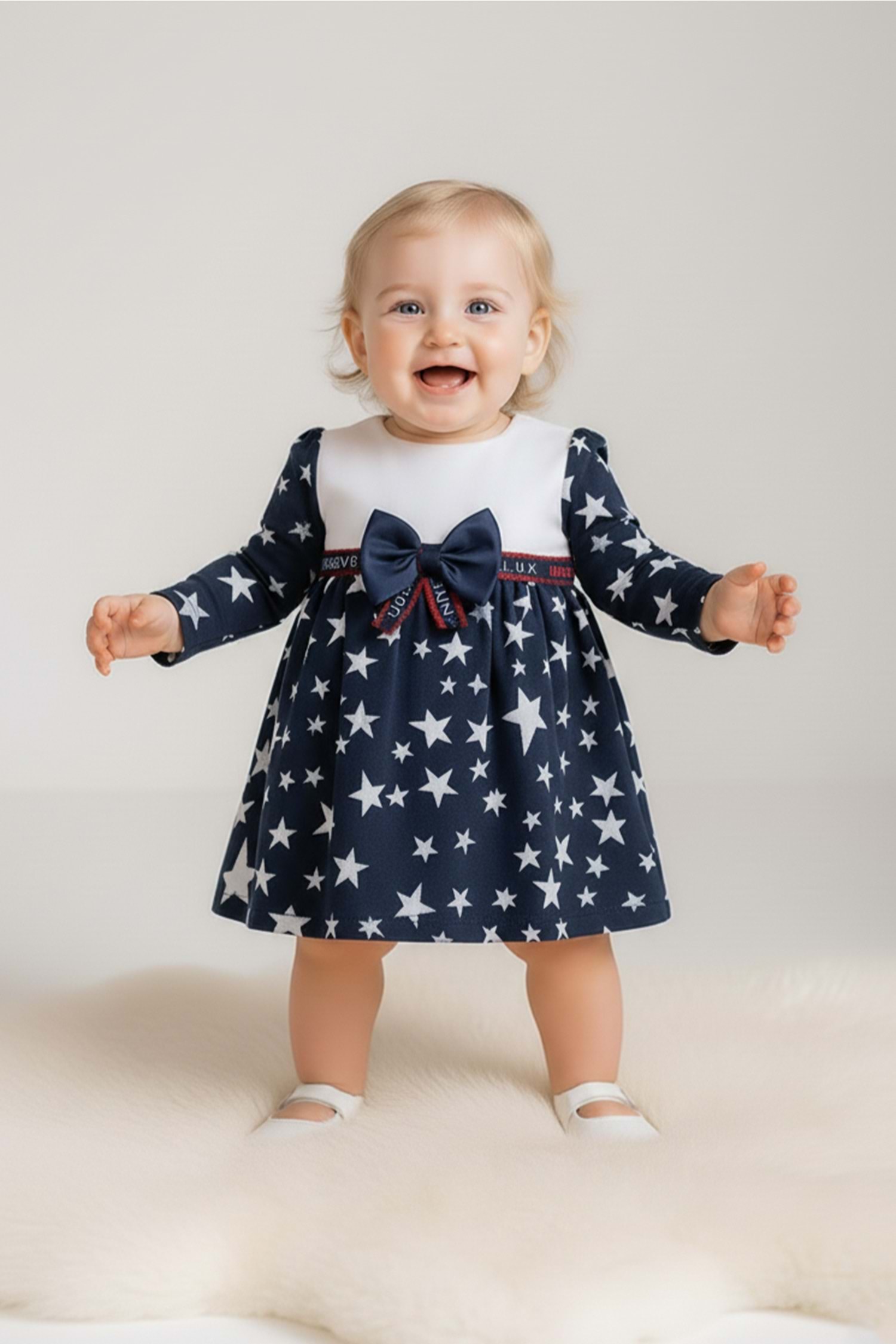 Lacivert Yıldız Desenli Kız Bebek Elbisesi – Kalın Pamuklu Kumaş, Astar ve Fiyonk Detaylı