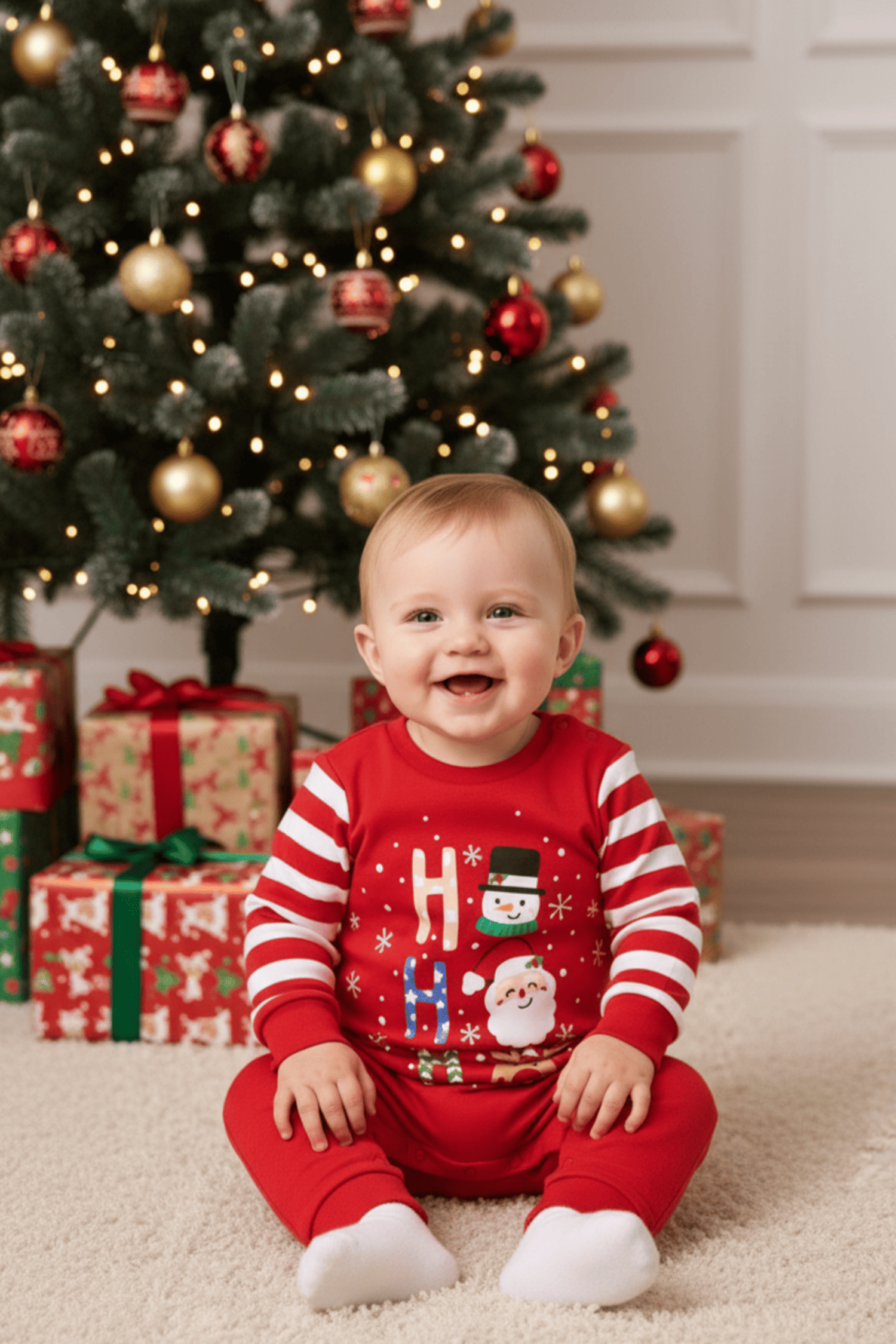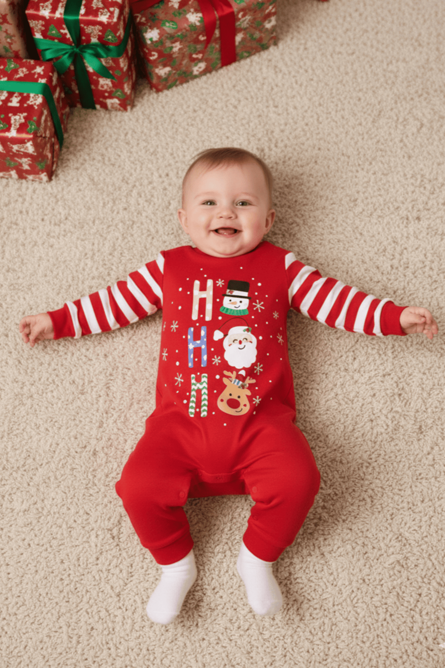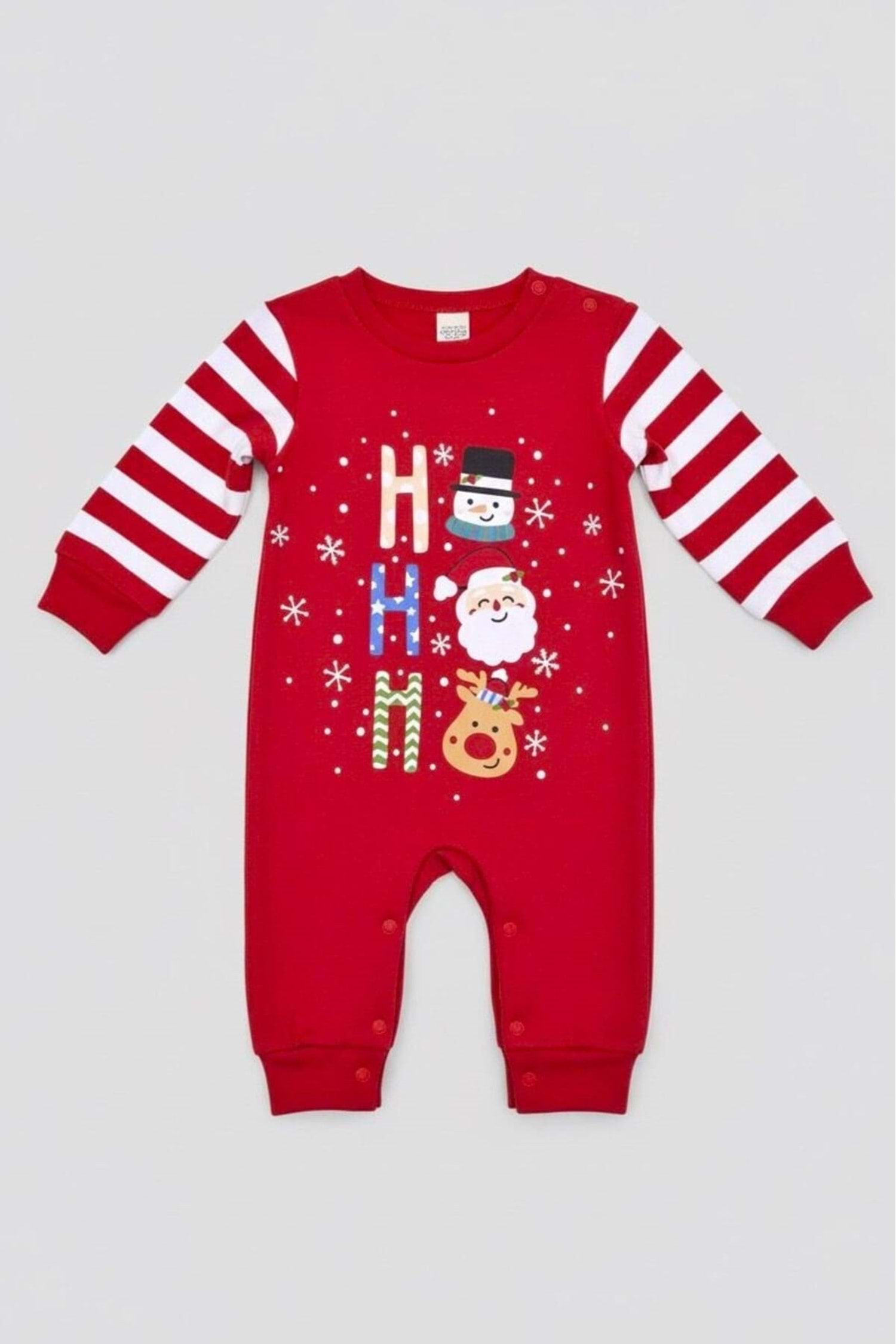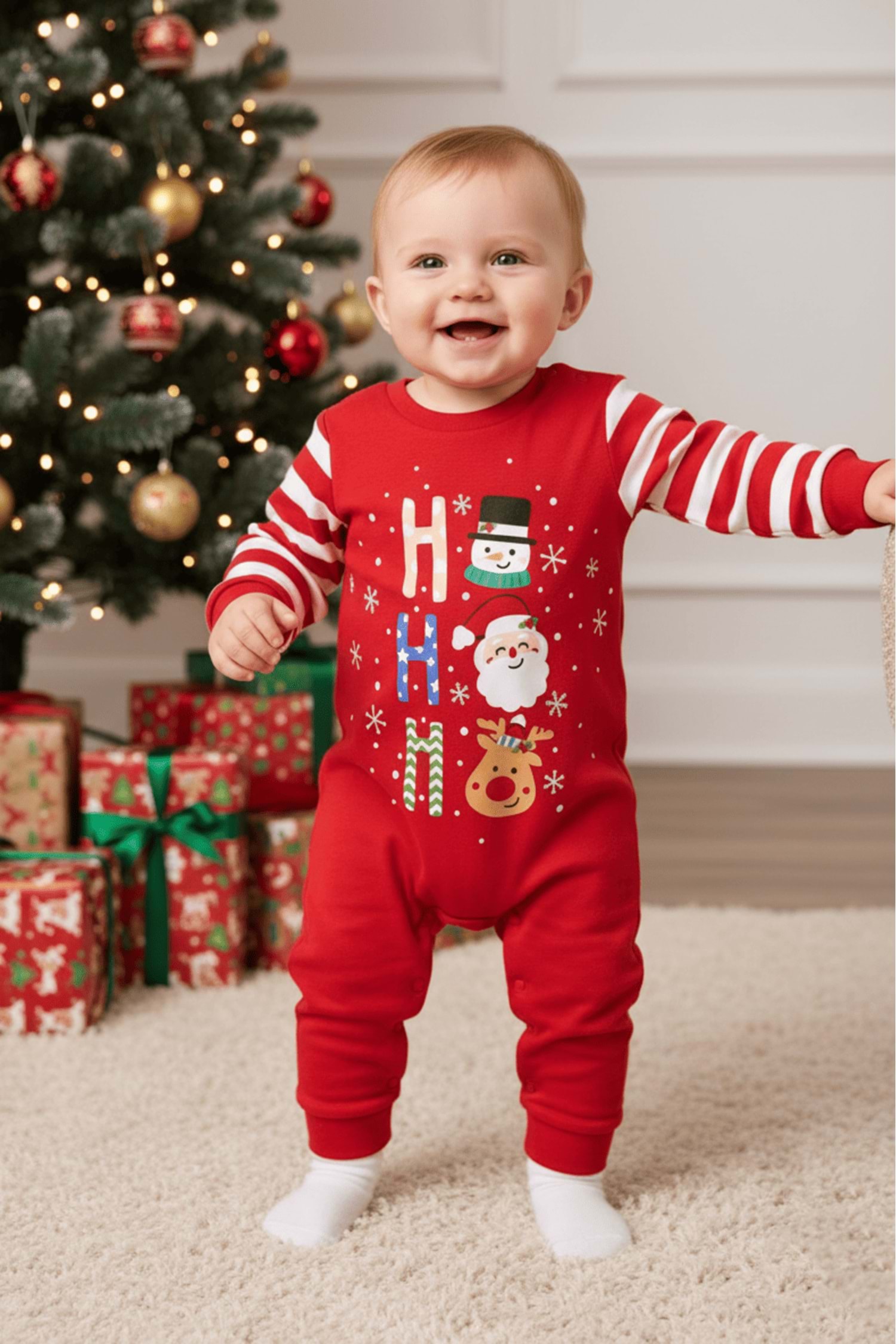 Bebeğinizin yeni yıl neşesine %100 pamuk yumuşaklığıyla ortak olun! Yılbaşı ruhunu yansıtan canlı kırmızı rengi, kollarındaki şirin çizgili detayları ve üzerindeki eğlenceli "Ho Ho Ho" karakterleriyle bu tulum, hem konforlu bir uyku hem de harika yılbaşı fotoğrafları için tasarlandı.