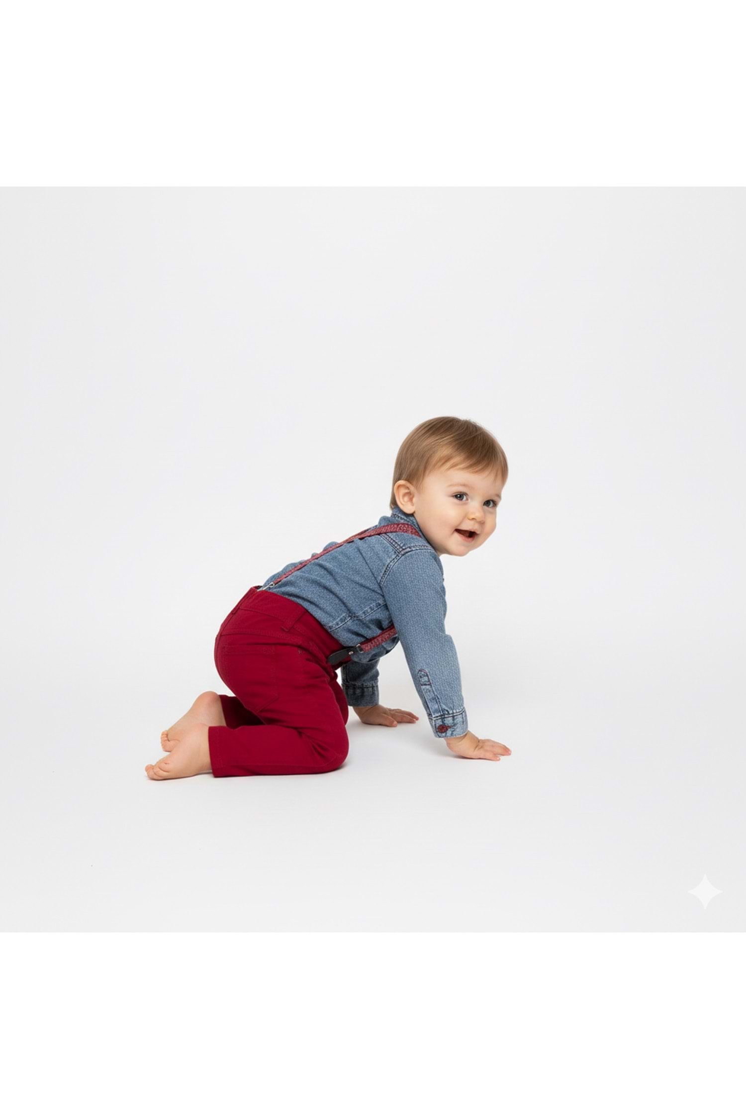 Miniklerin hem şık hem rahat olmasını sağlayan iki parçalı askılı takım. Üstte klasik denim görünümlü pamuklu gömlek; altta yumuşak dokulu gabardin pantolon ve ayarlanabilir askı. Özel günler (doğum günü, mevlüt, fotoğraf çekimi) ve günlük kullanım için idealdir.
