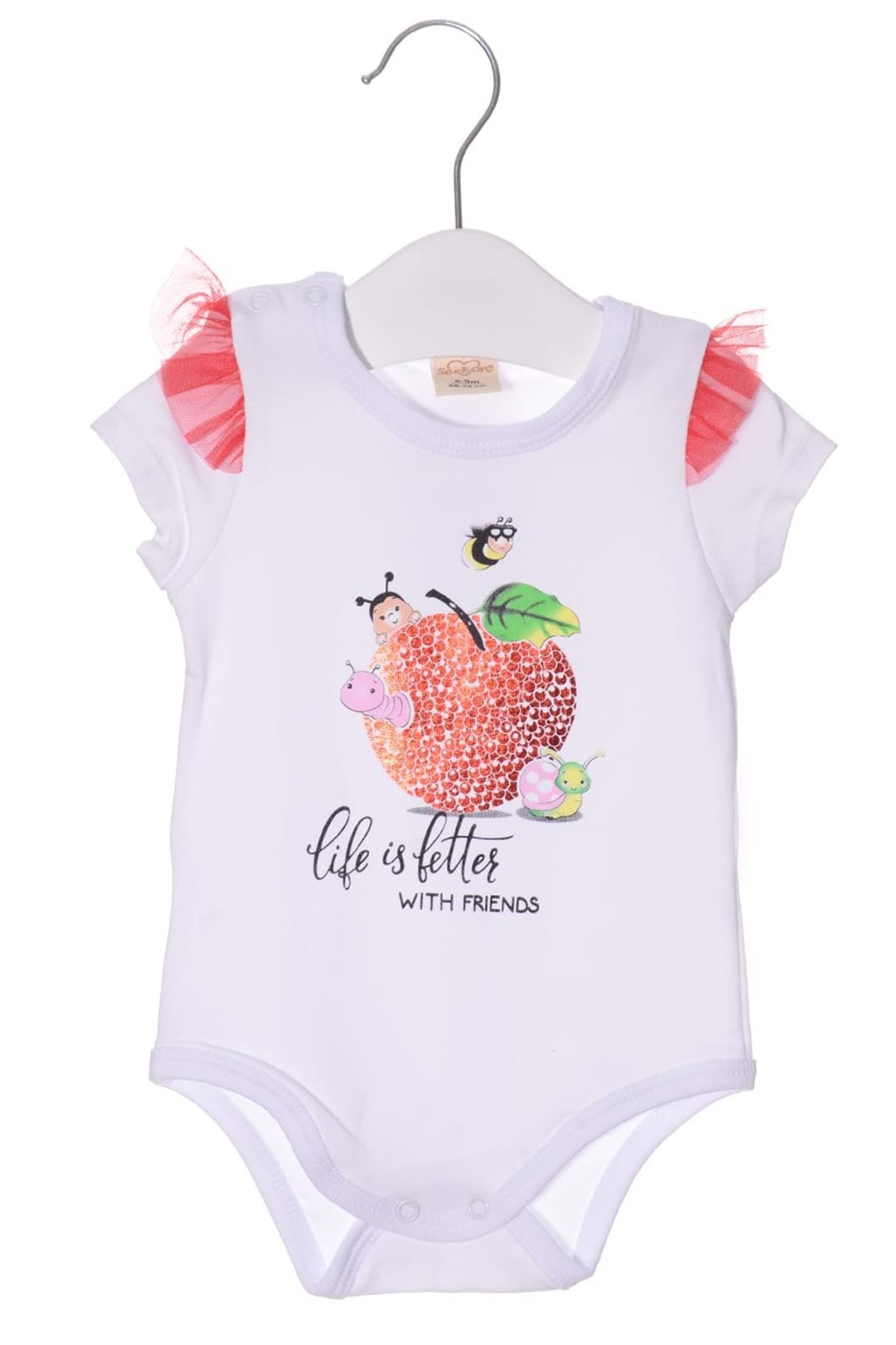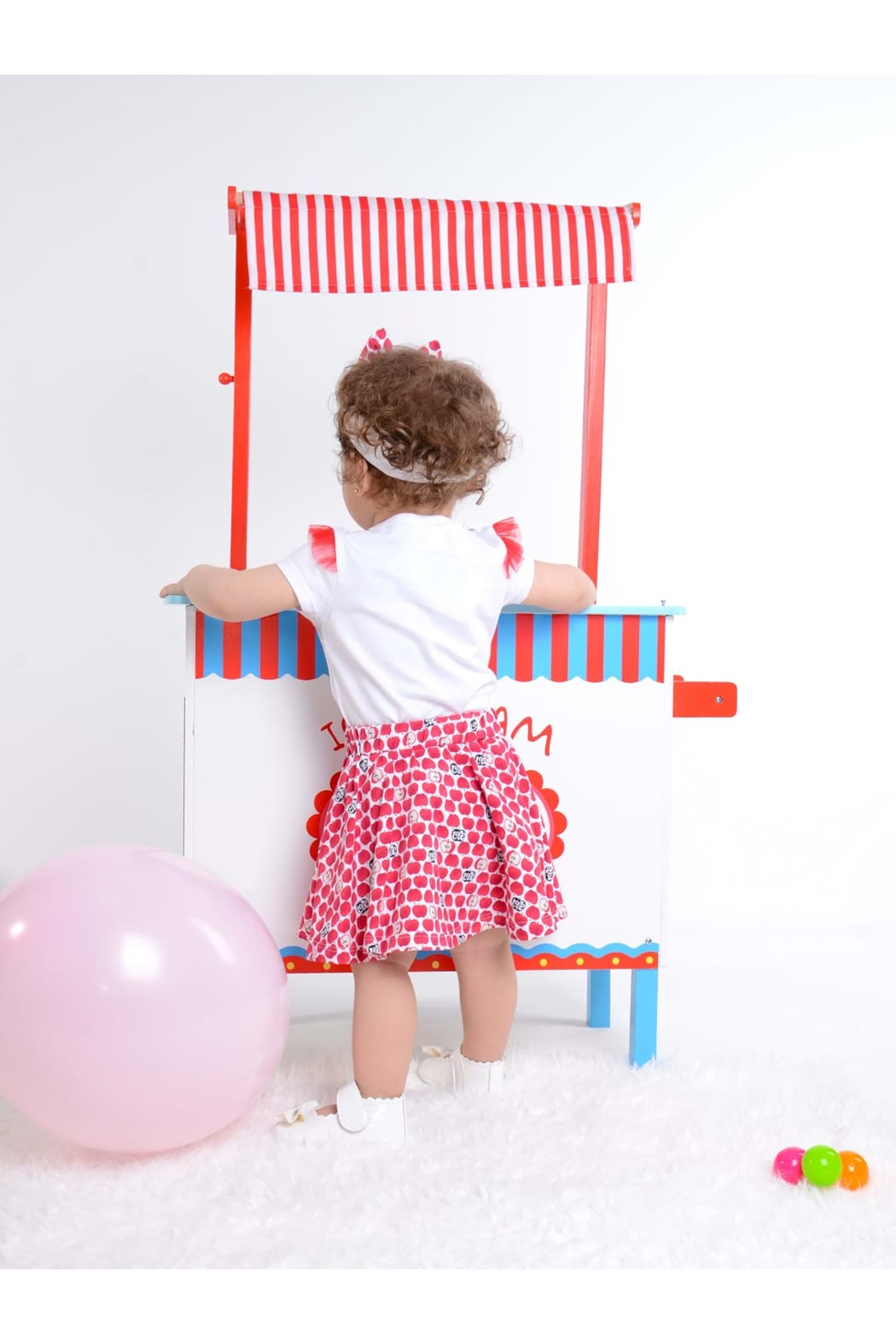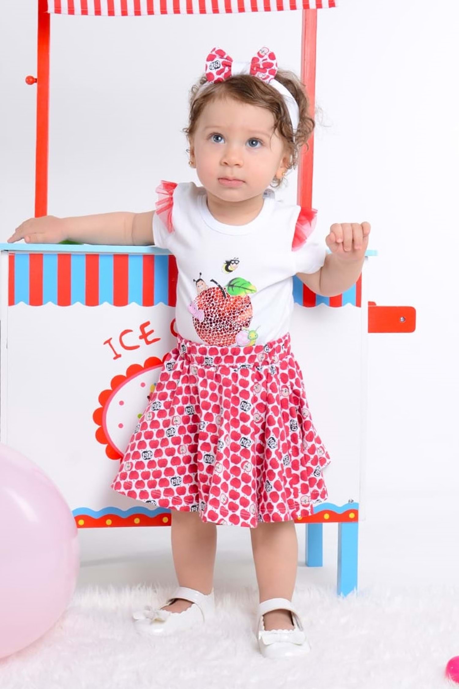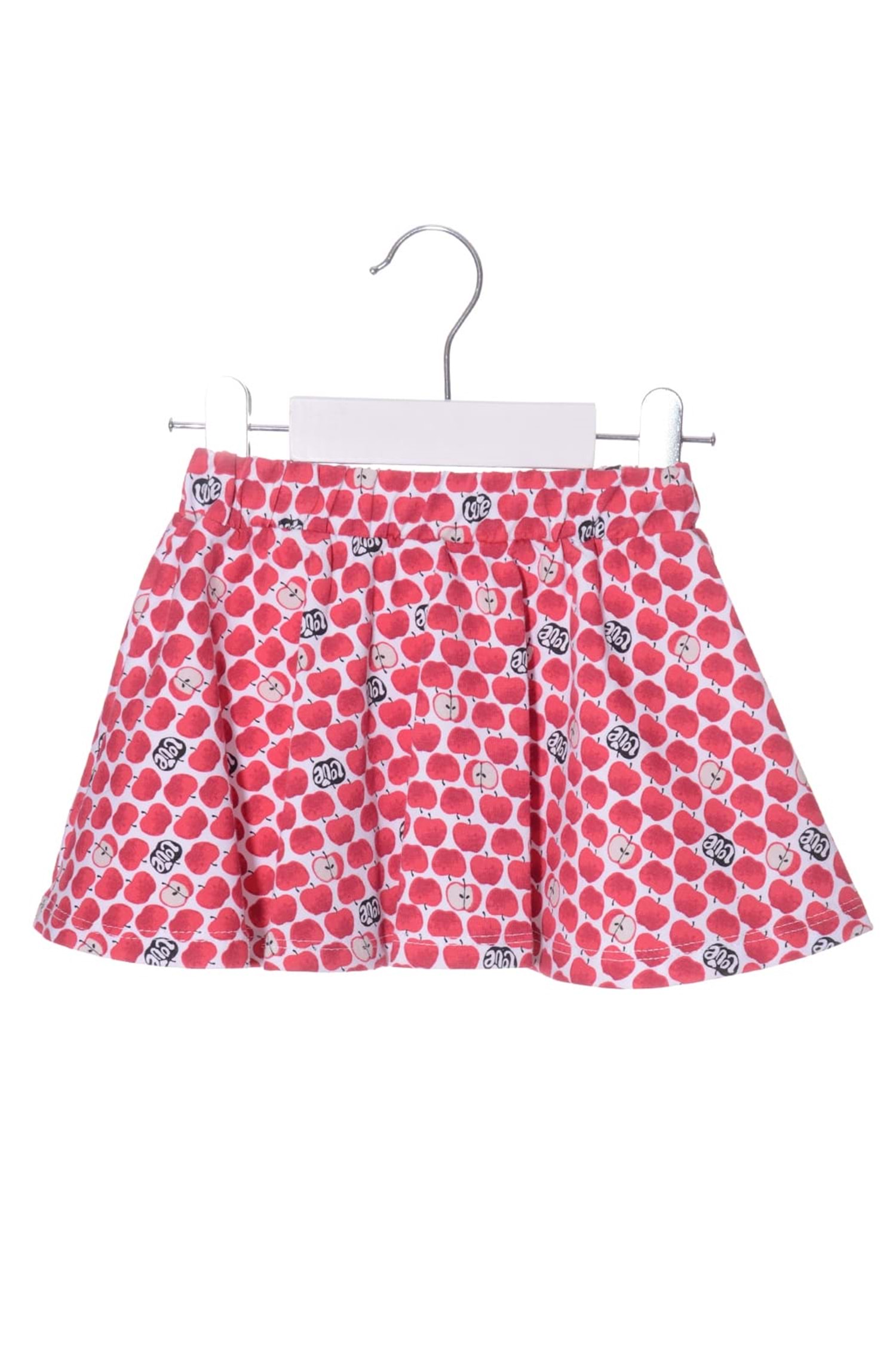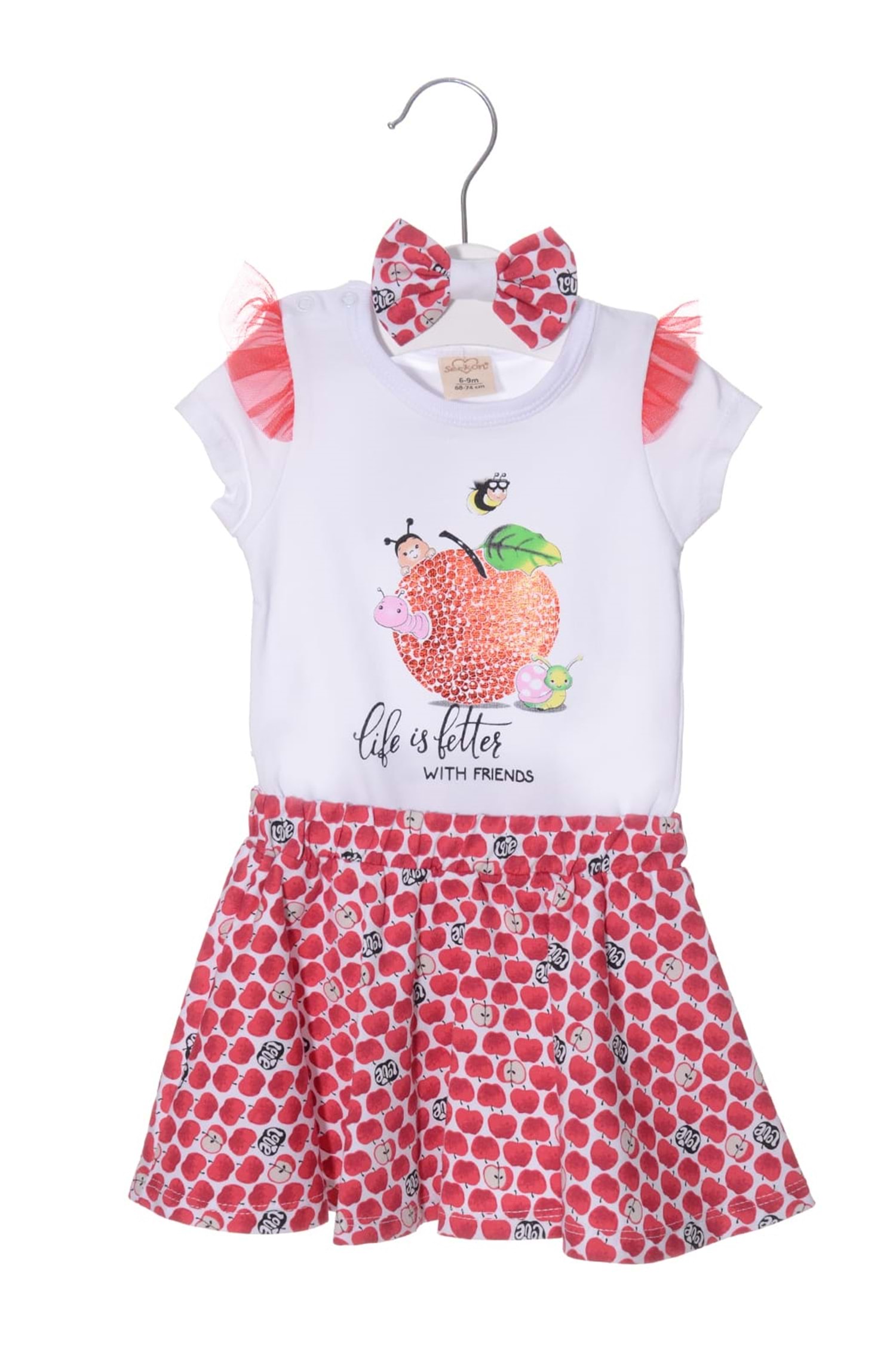 Çıtçıtlı badi , elma motifli etek ve bandanadan oluşan kombin.