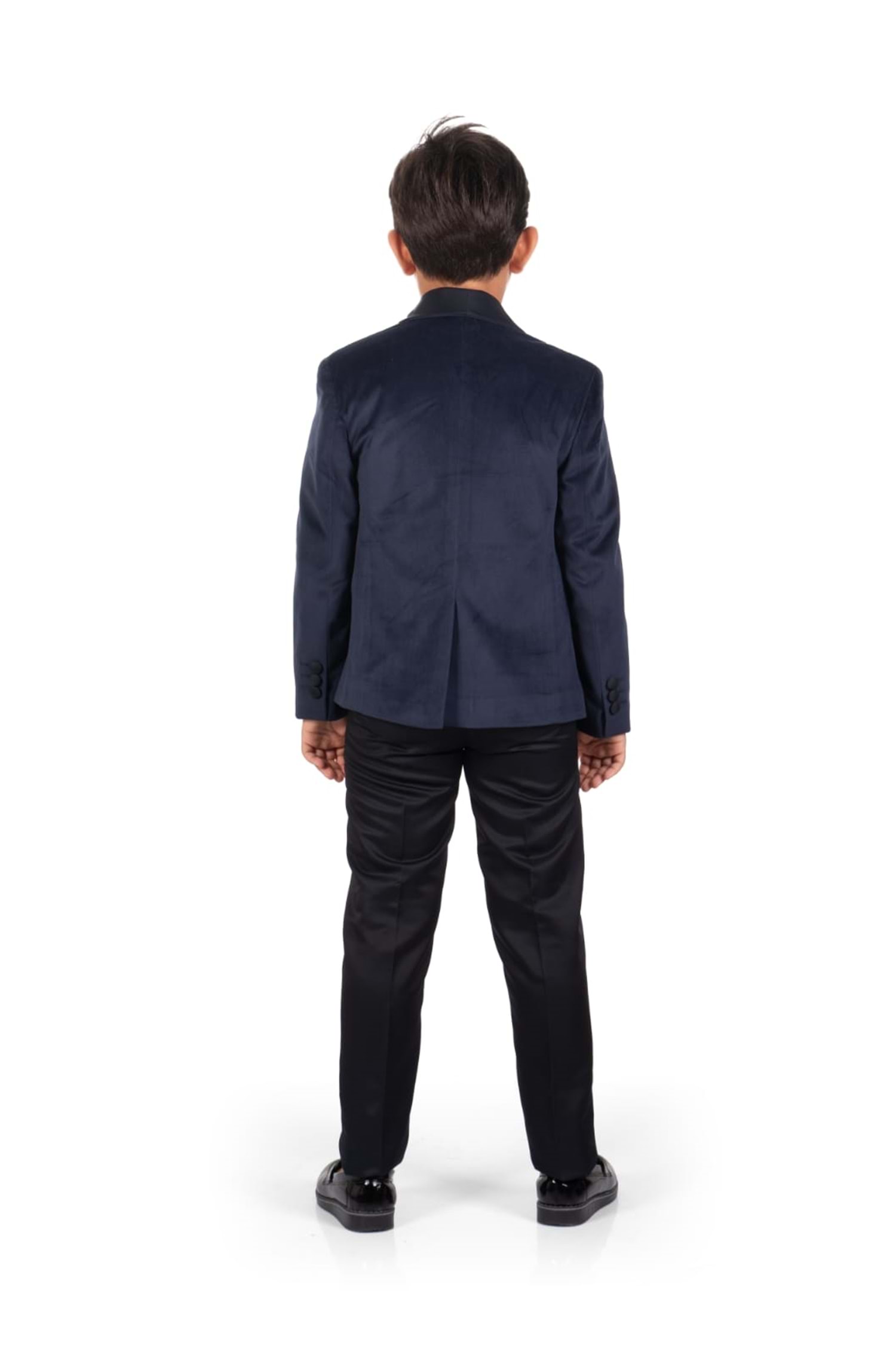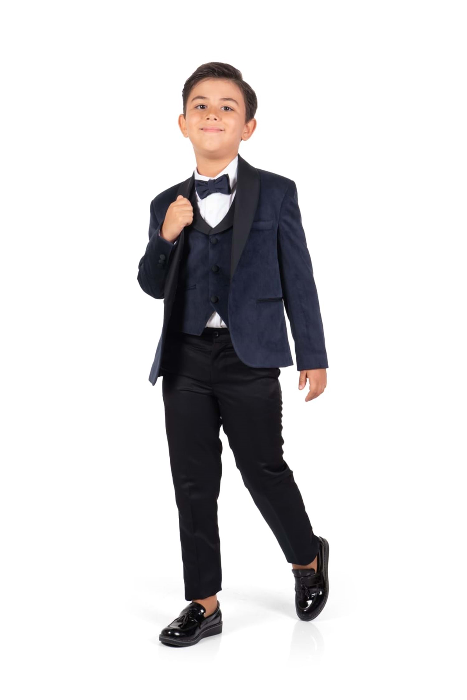 Gömlek, Yelek, Pantolon, Ceket ve Papyon olarak 5 parçadan oluşan Kadife Ceketli Yelekli Erkek Çocuk Damatlık Takım.
