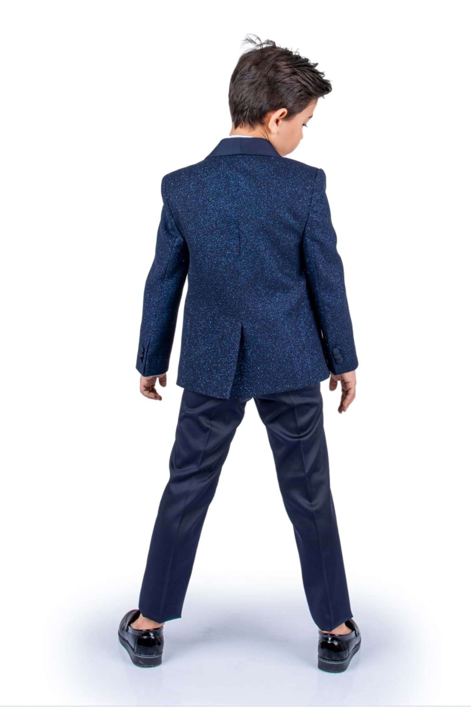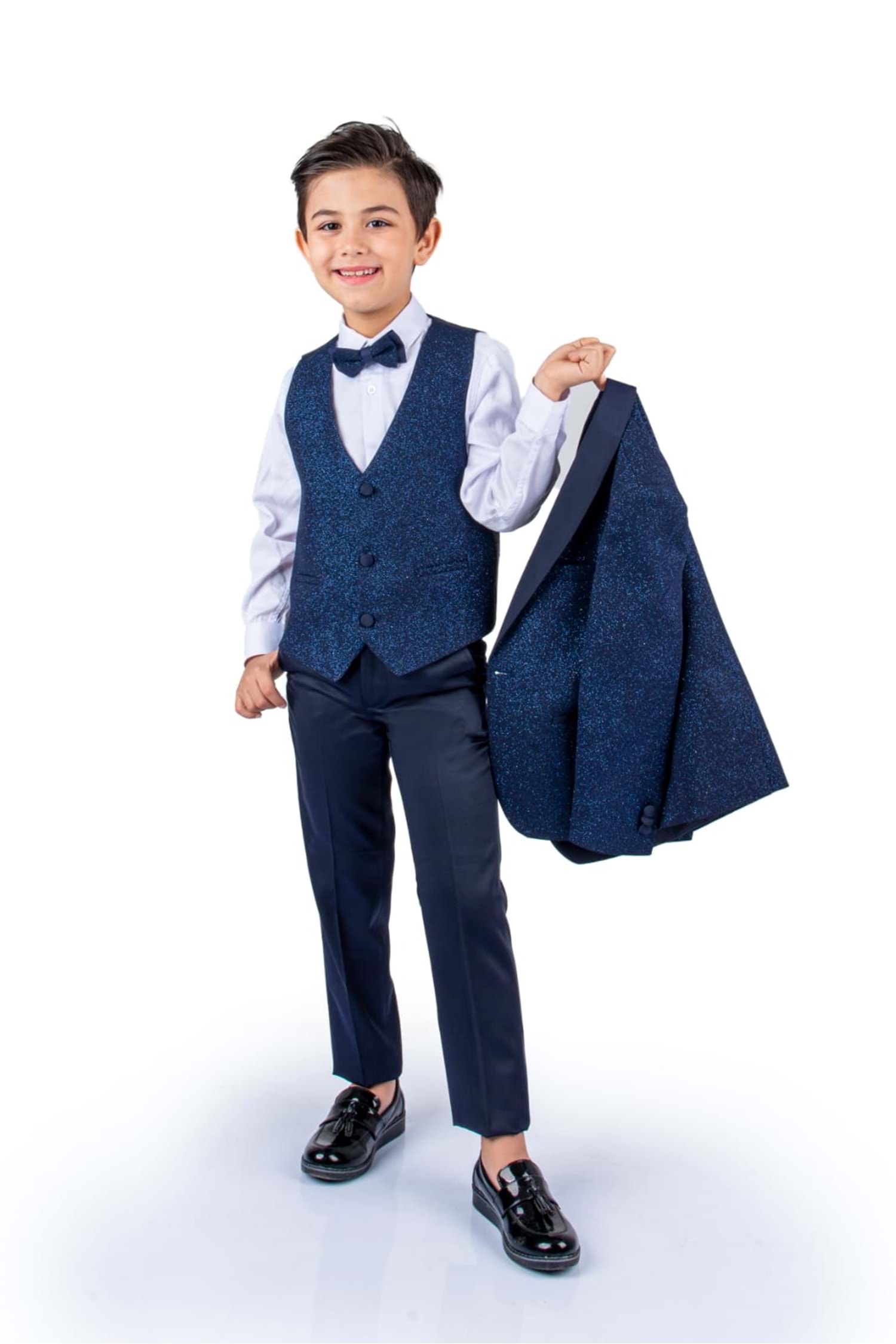 Gömlek, Yelek, Pantolon, Ceket ve Papyon olarak 5 parçadan oluşan Erkek Çocuk Yelek Ve Ceket Simli Çocuk Damatlık Takım.