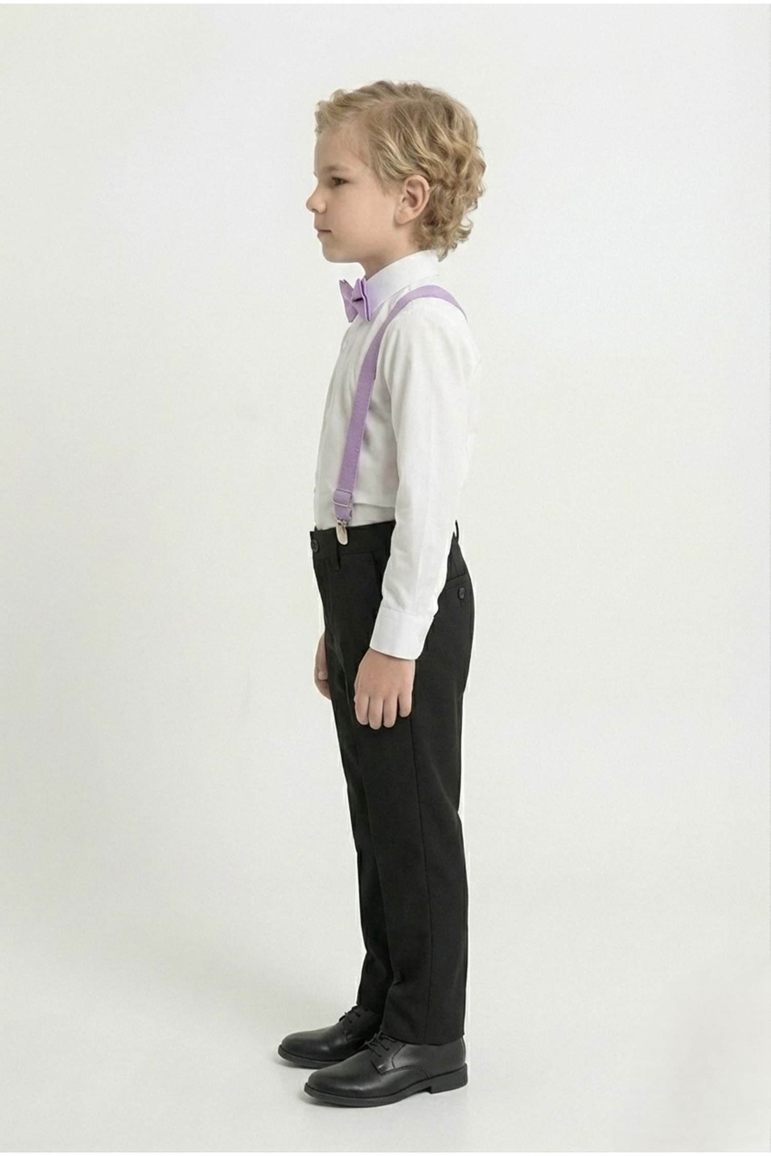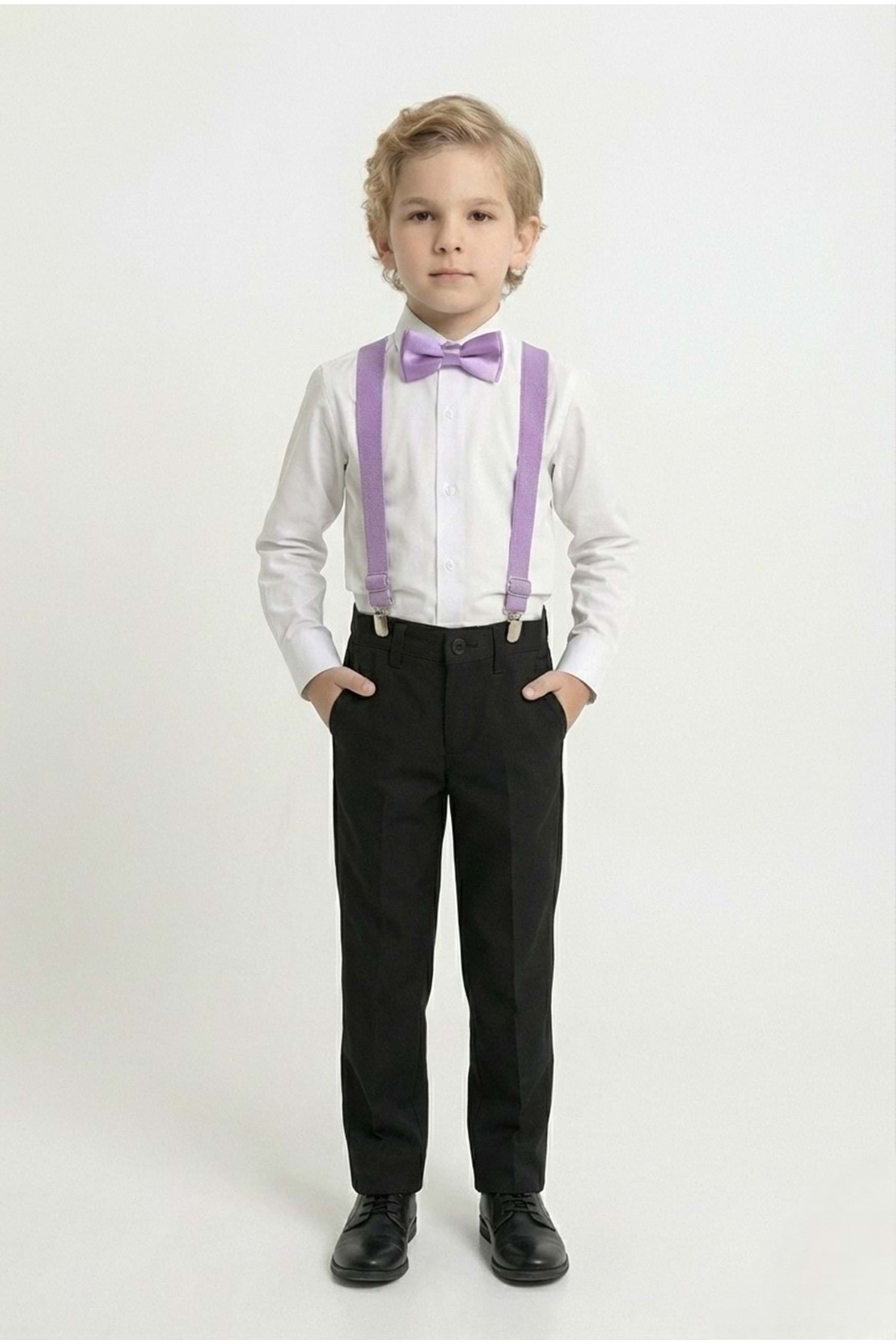 Şıklık ve konforu bir araya getiren bu dört parçalı çocuk takımı, düğün, nişan,23 nisan,çocuk bayramı, 19 mayıs, okuma bayramı, hatim merasimi, doğum günü, bayram, okul etkinlikleri ve fotoğraf çekimleri için ideal bir seçimdir. Set; siyah gabardin pantolon, beyaz gömlek, askı ve papyon ile birlikte gönderilir.