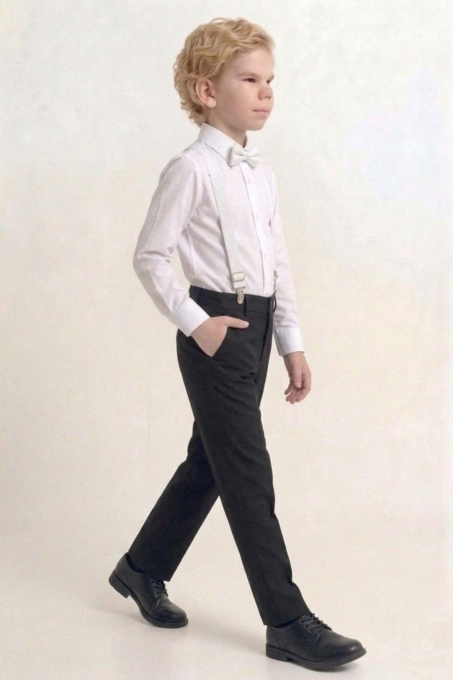 Şıklık ve konforu bir araya getiren bu dört parçalı çocuk takımı, düğün, nişan,23 nisan,çocuk bayramı, 19 mayıs, okuma bayramı, hatim merasimi, doğum günü, bayram, okul etkinlikleri ve fotoğraf çekimleri için ideal bir seçimdir. Set; siyah gabardin pantolon, beyaz gömlek, askı ve papyon ile birlikte gönderilir.