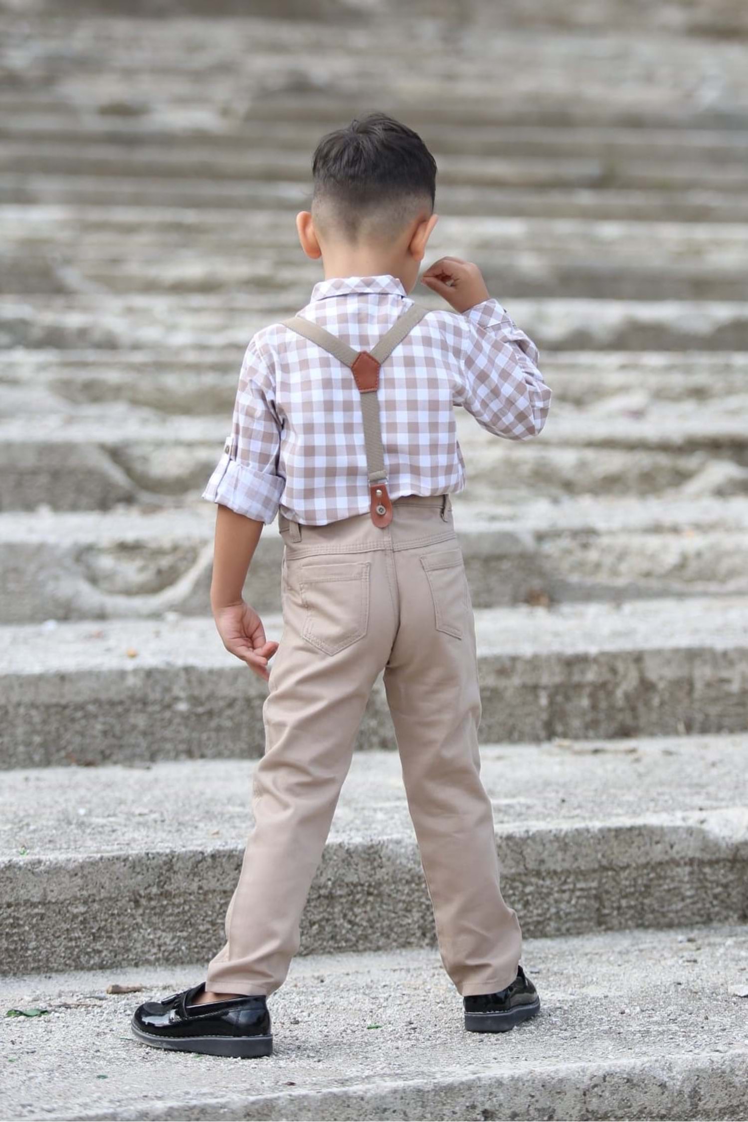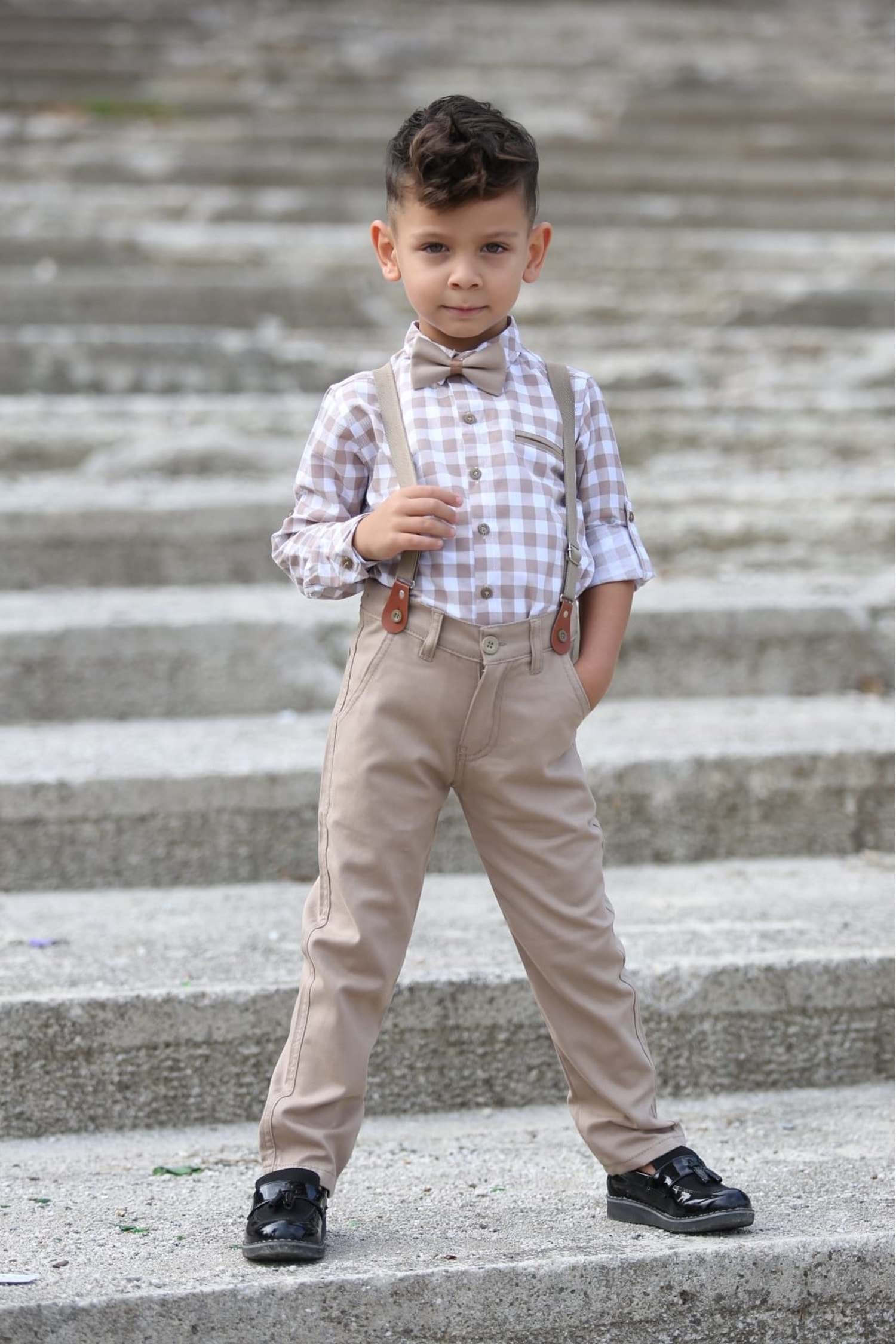 Ekose Desen Gabardin Pantolon Askılı Çocuk Takım MNK0436