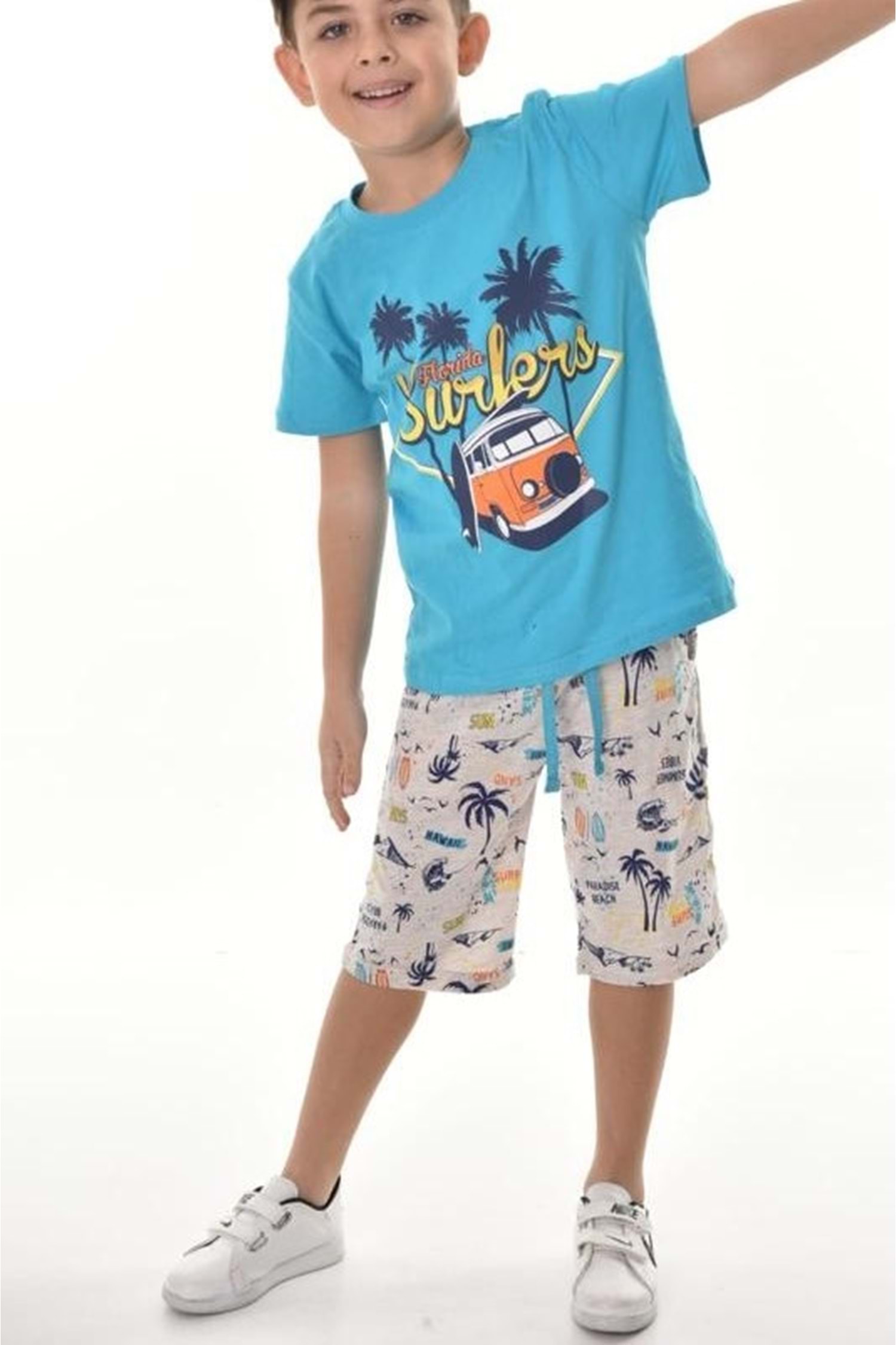 Yumuşacık penye kumaşa şortu cepli , üst baskılı süprem erkek çocuk takım