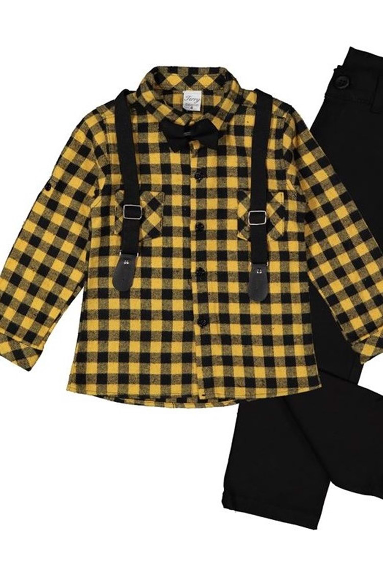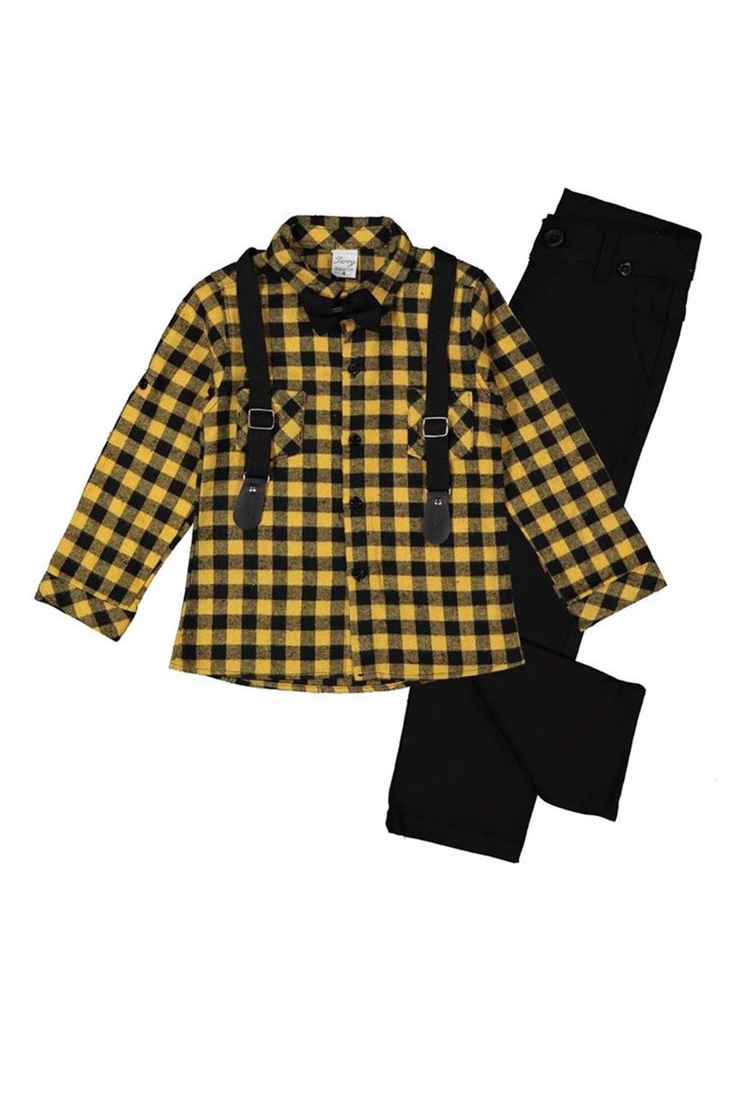 Askı , Papyon , Oduncu Gömlek Ve Pantolondan oluşan 4 parça kombin ürün.