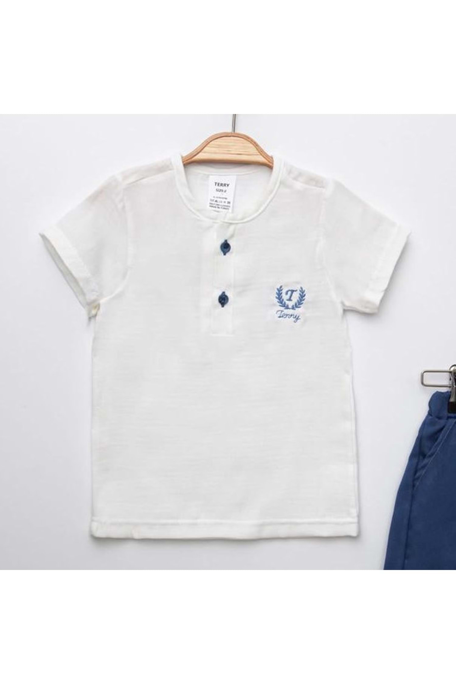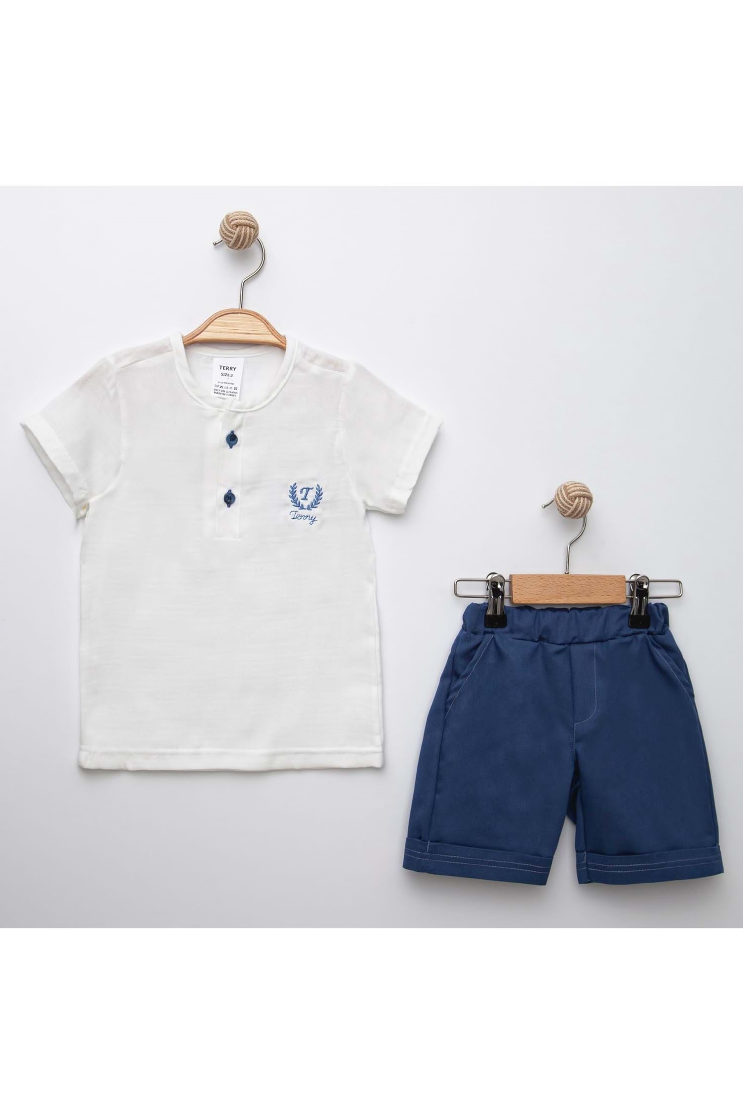 Gömlek ve Cepli Şort Olarak İki Parçadan Oluşan, Nakış ile Modellenmiş Sıfır Yaka Erkek Çocuk Takım.