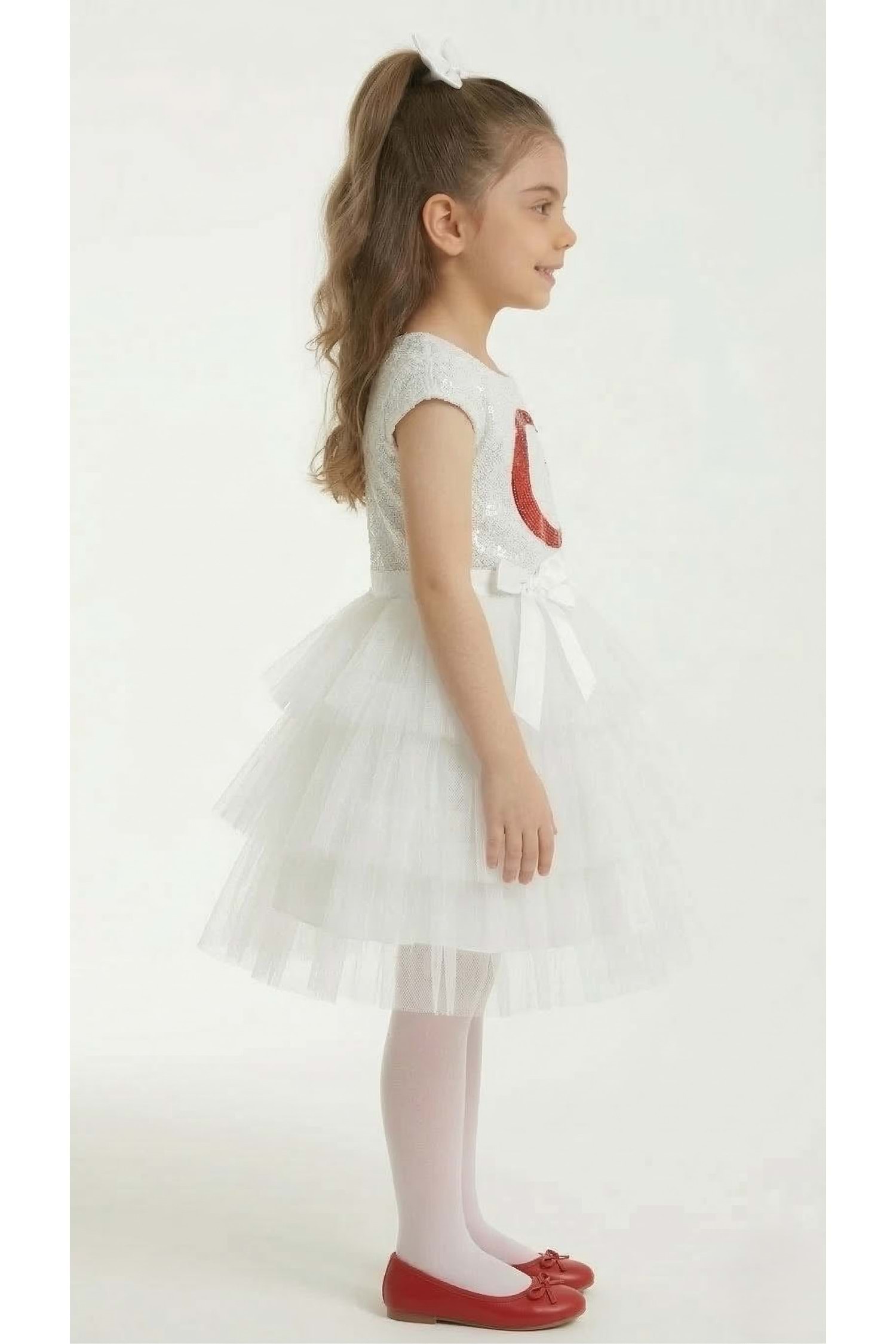 Çocuklarımızın en özel günlerinde, onların heyecanına ve coşkusuna ortak olacak muhteşem bir tasarımla karşınızdayız! Pul Payetli Ay Yıldızlı Kız Çocuk Elbisesi, hem şıklığı hem de taşıdığı anlamla göz kamaştırıyor. Kırmızı ve beyaz renk seçenekleriyle sunduğumuz bu özel tasarım, minik prenseslerin bayram sevincini ikiye katlayacak.