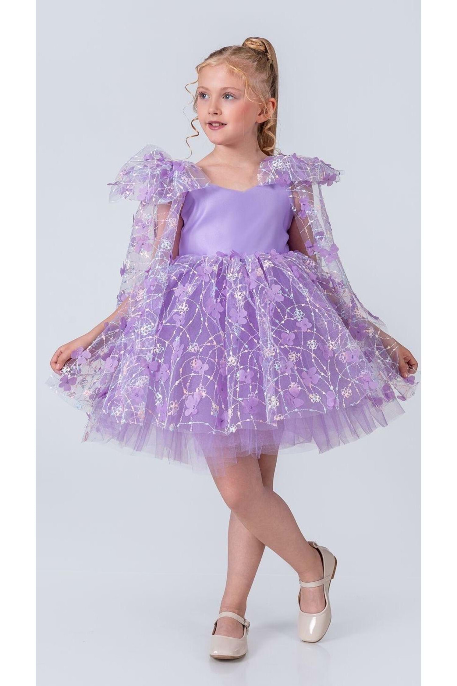 İmeros Model Brode Üzeri Çiçek Nakışlı 3-4 / 5-6 / 7-8 / 9-10 / 11-12 Yaş Alttan Tütü İle Kabartılmış Abiye Elbise