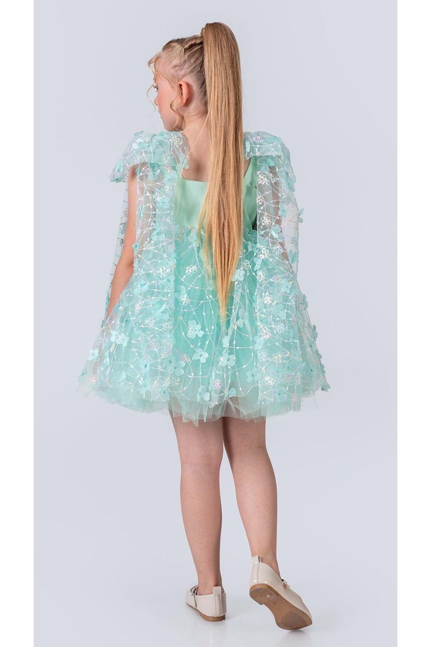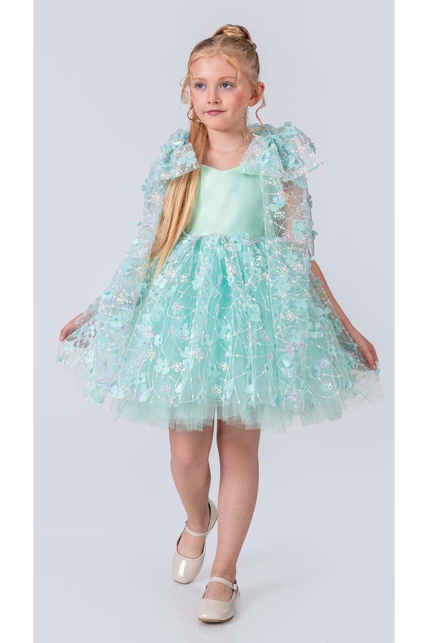 İmeros Model Brode Üzeri Çiçek Nakışlı 3-4 / 5-6 / 7-8 / 9-10 / 11-12 Yaş Alttan Tütü İle Kabartılmış Abiye Elbise