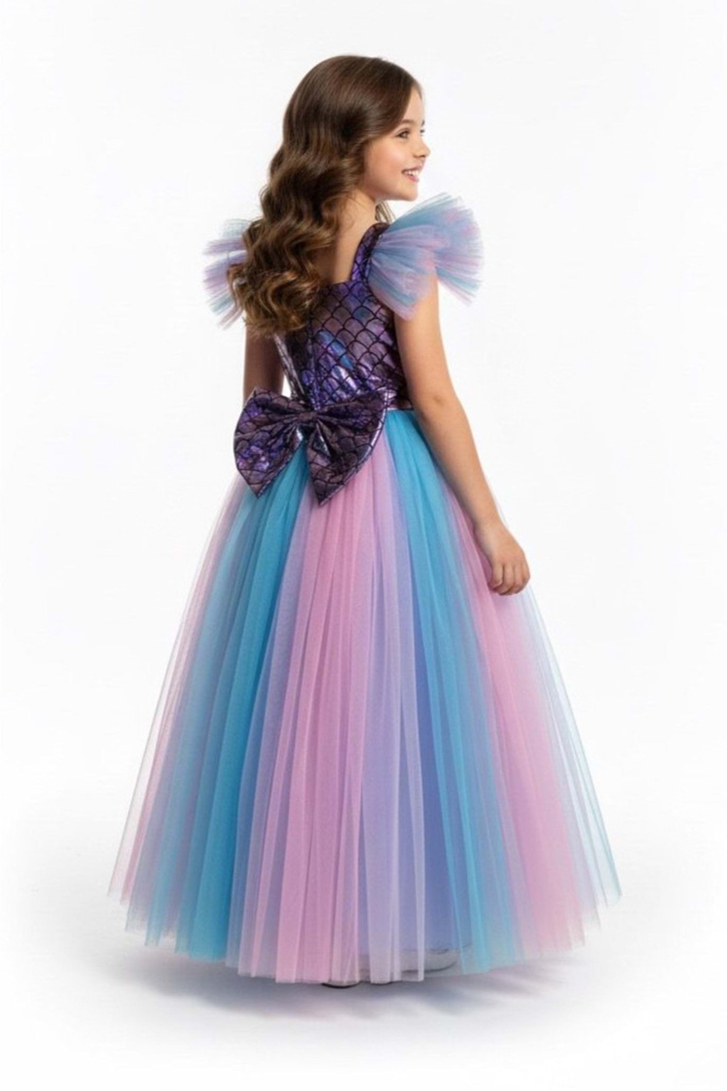 Göz Alıcı Tül Etek: Etek kısmı, deniz tonlarını yansıtan mavi, pembe ve mor/lila renklerinin ahenkli birleşimiyle kat kat tüllerden oluşur. Dolgun ve hacimli etek, minik prensesinizin her adımda uçuşmasını sağlayarak ona benzersiz bir hareket özgürlüğü tanır.