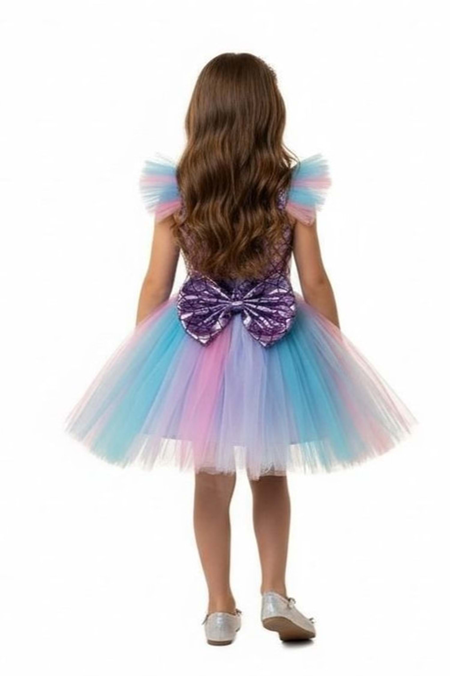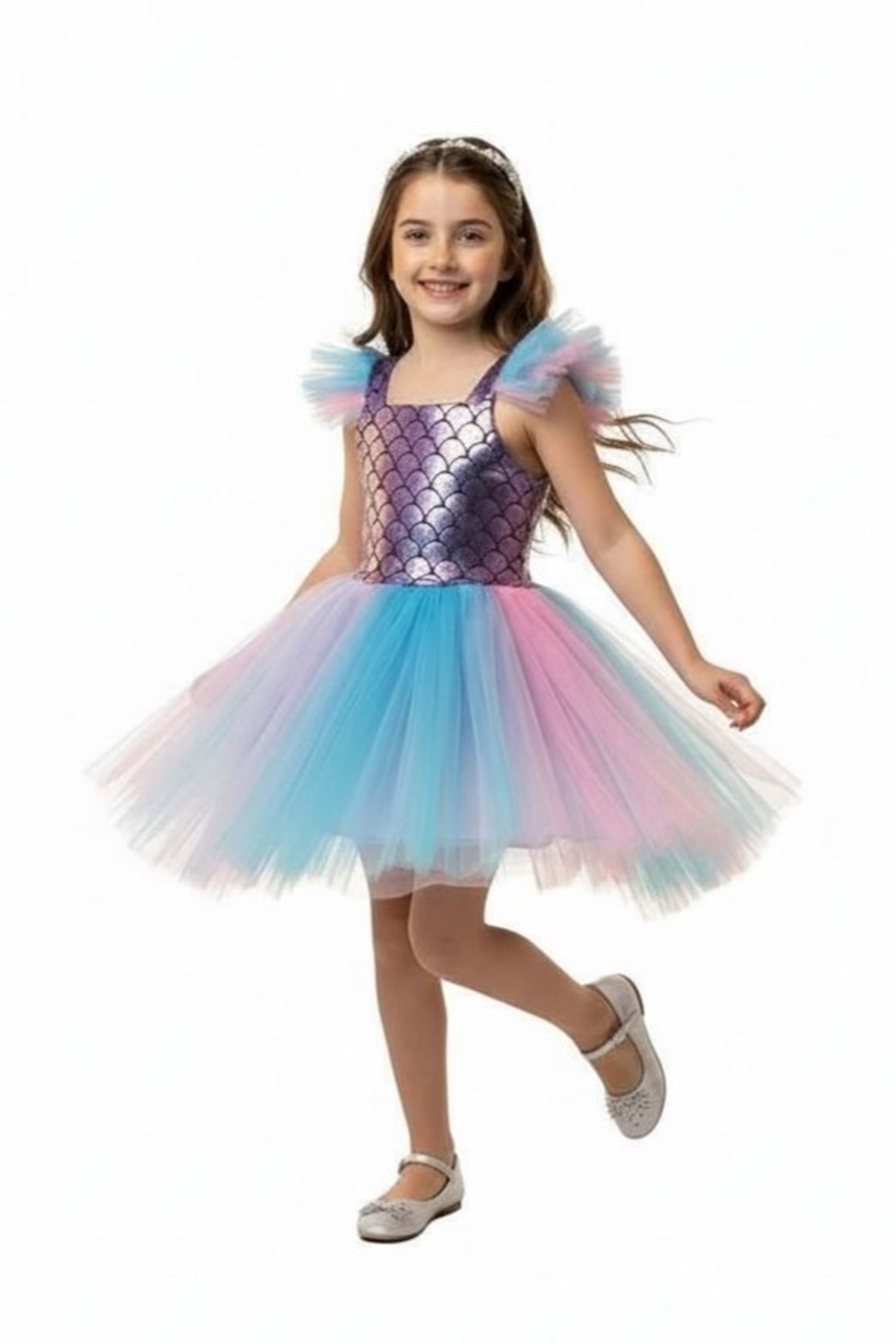 Göz Alıcı Tül Etek: Etek kısmı, deniz tonlarını yansıtan mavi, pembe ve mor/lila renklerinin ahenkli birleşimiyle kat kat tüllerden oluşur. Dolgun ve hacimli etek, minik prensesinizin her adımda uçuşmasını sağlayarak ona benzersiz bir hareket özgürlüğü tanır.