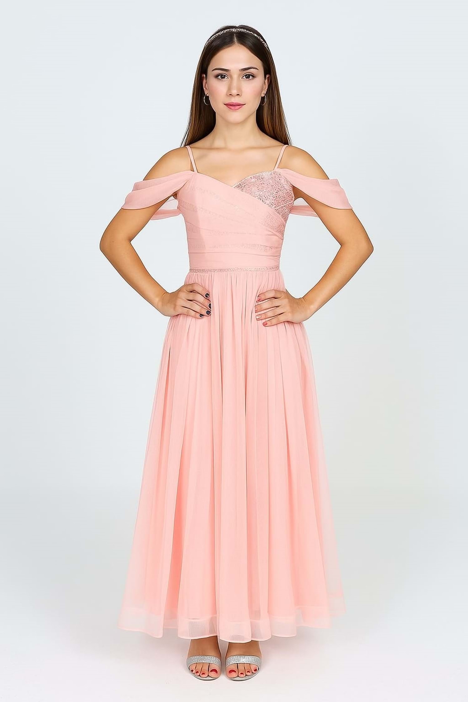Üst kısmında yer alan dantel robası ve modern omuz kesimi ile göz alıcı bir duruş sergileyen model, sırt kısmındaki gipe lastik detayı sayesinde esnek bir yapıya sahiptir. Fermuar içermeyen bu tasarım, hem kolay giyilip çıkarılabilir hem de rahat bir kullanım sunar. Mezuniyet, doğum günü, bayram ve nişan gibi özel günler için idealdir.