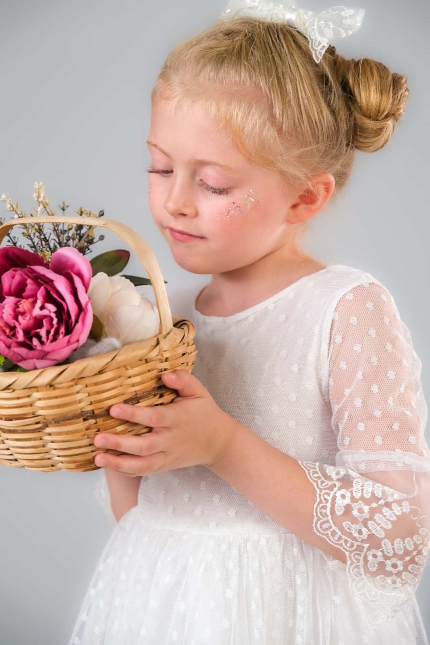 Lüx dantel saç tokalı saten kumaşlı kız çocuk elbise.