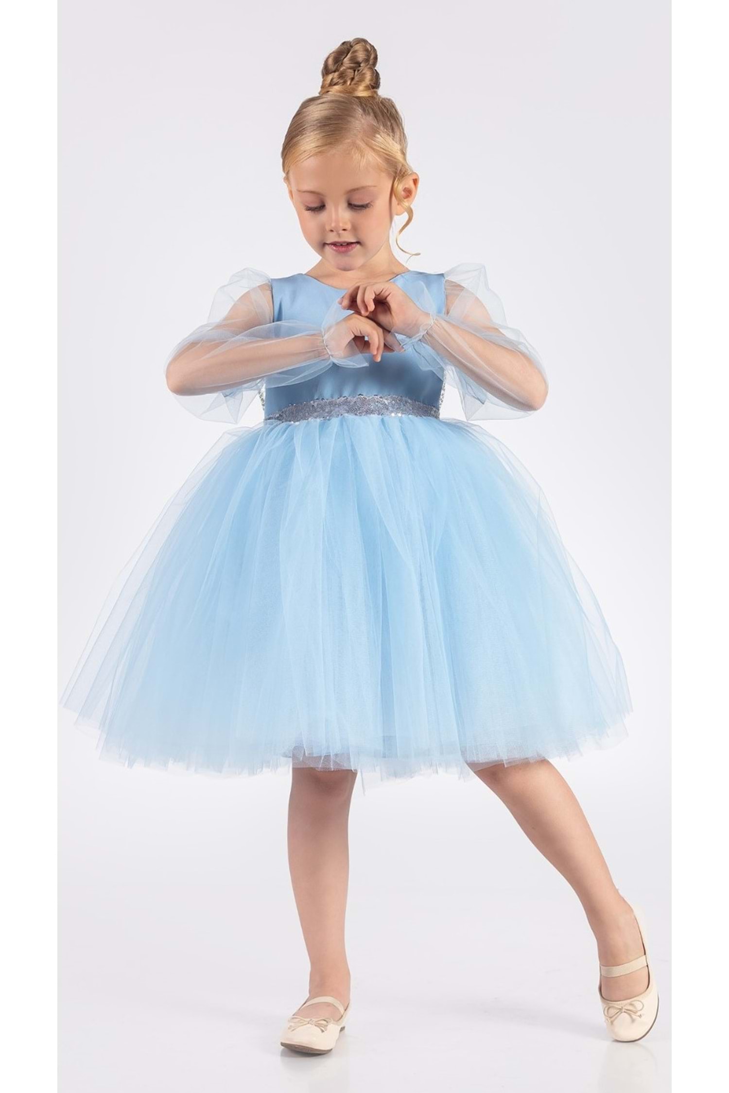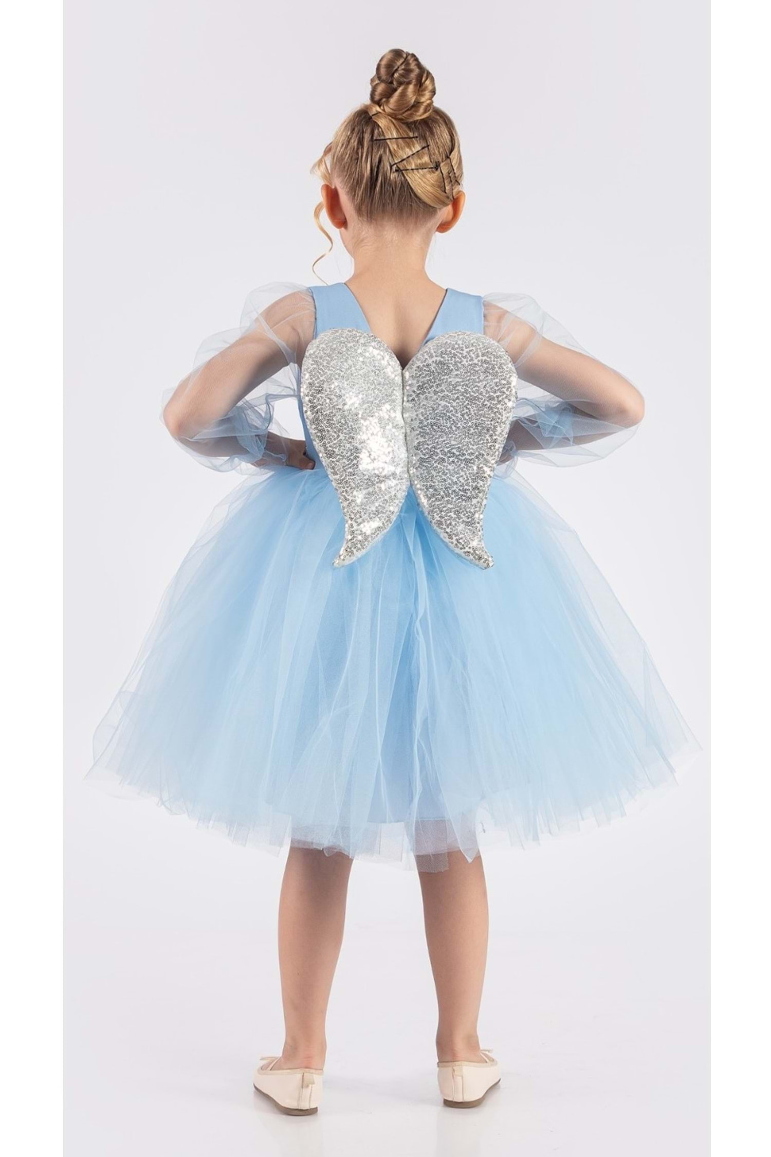 Özel günlerde miniklerin hayallerini süsleyen kanatlı pul payet detaylı tül kız çocuk abiye elbise, şık tasarımı ve konforlu yapısıyla dikkat çeker. Doğum günü, parti ve özel davetlerde zarif bir görünüm sunar.