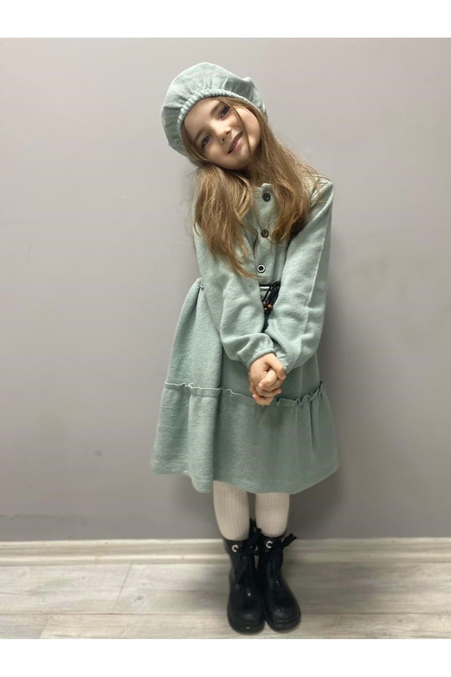 Kaşe kumaştan üretilmiş şapka ve elbise olarak iki parçadan oluşan beli ip aksesuarlı kışlık çocuk uzun kollu elbise.