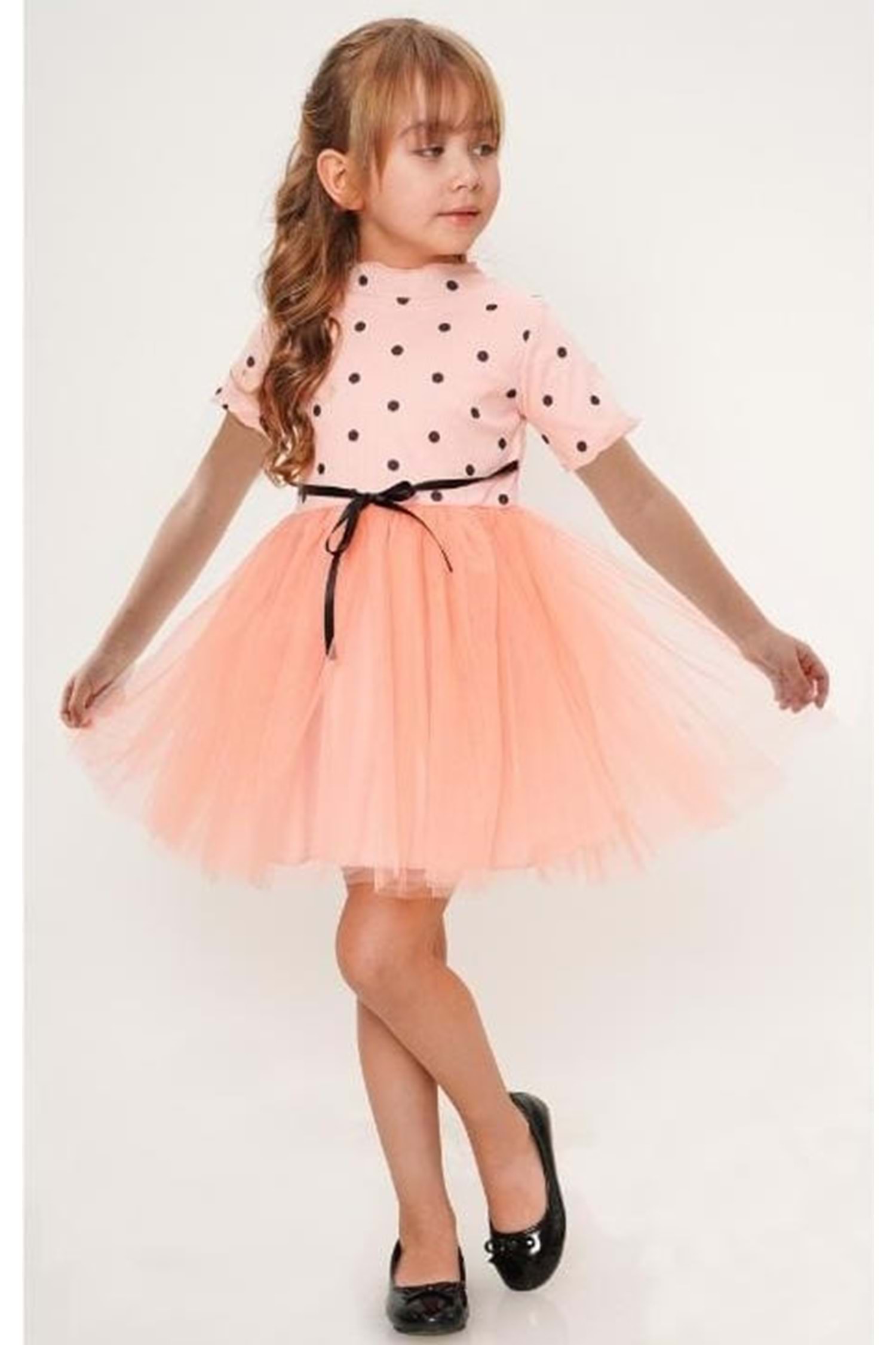 Kısa Kol Kız Puantiyeli Tütülü Günlük Elbise MNK0504