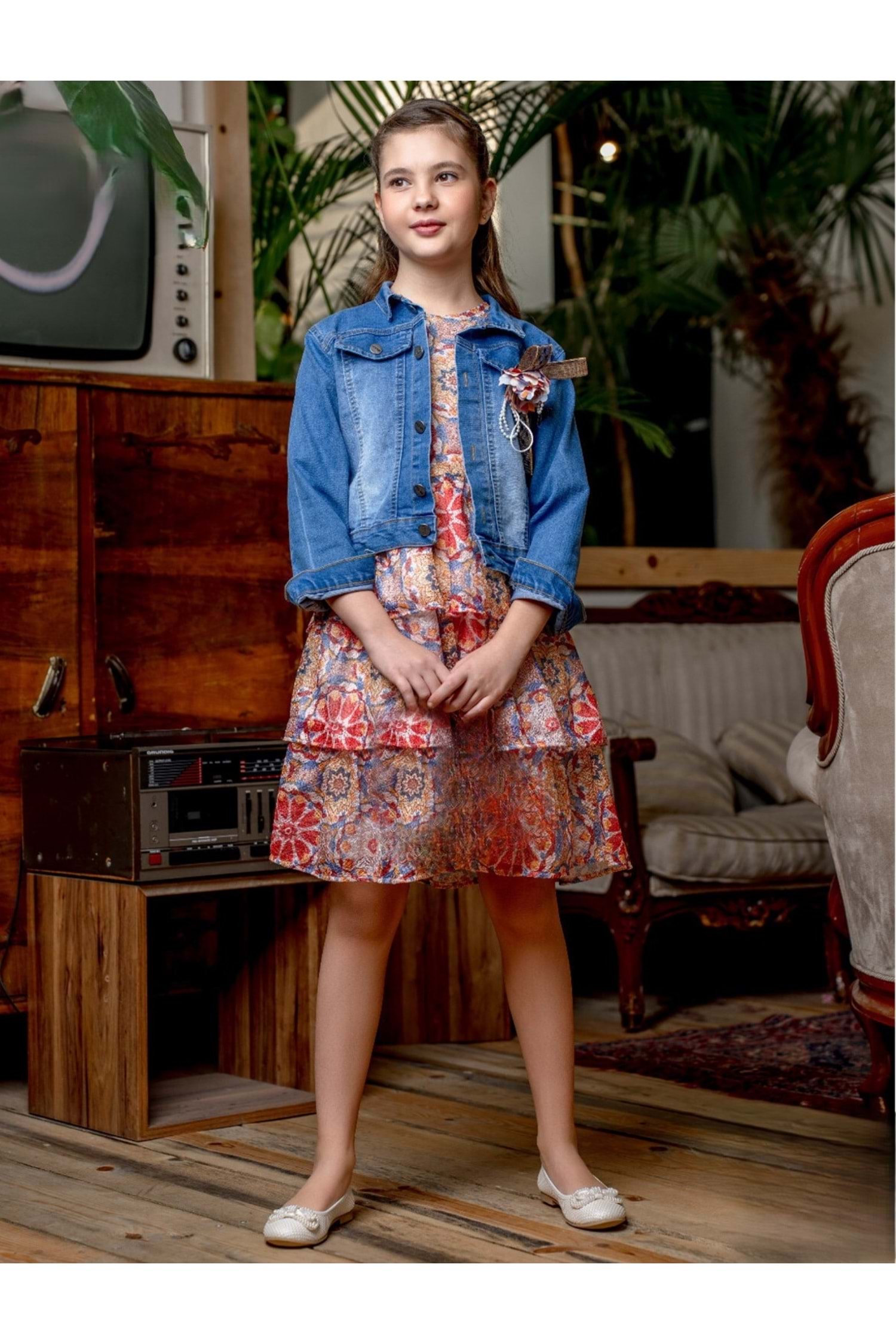 Kot ceket dantel koludur ve beyaz dantelli kolsuz elbiseyle birlikte gönderilir.