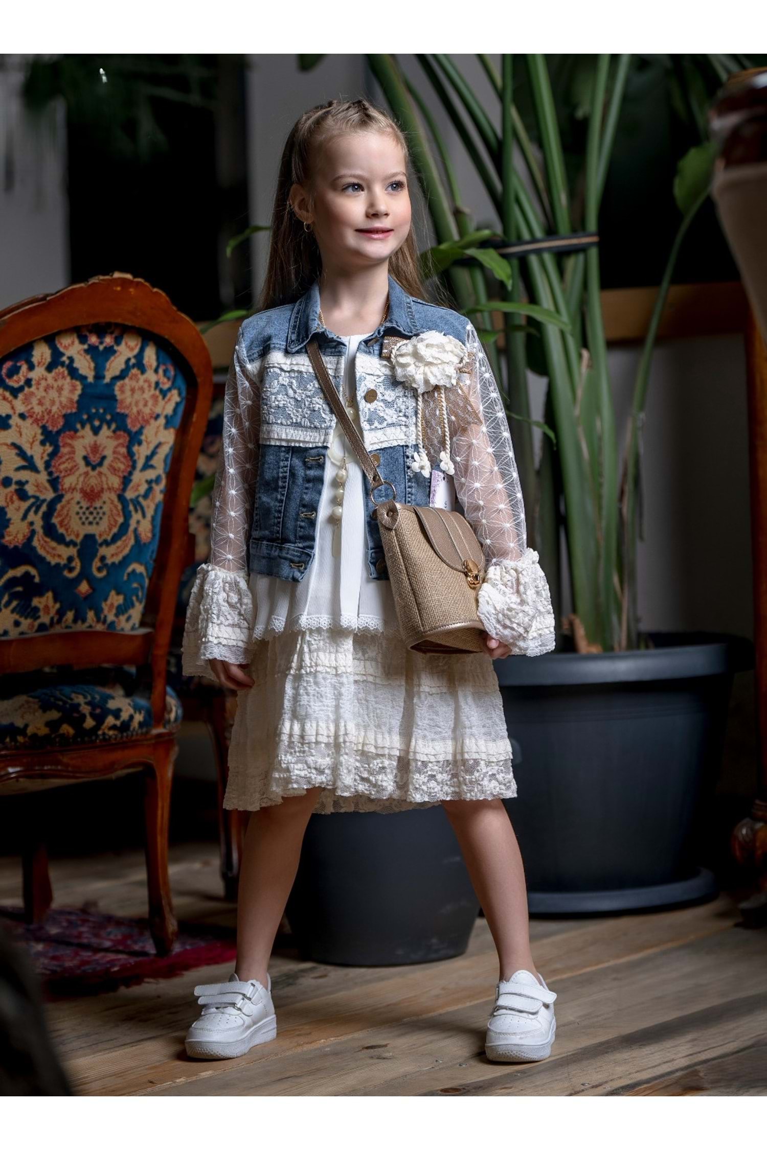 Kot ceket dantel koludur ve beyaz dantelli kolsuz elbiseyle birlikte gönderilir.