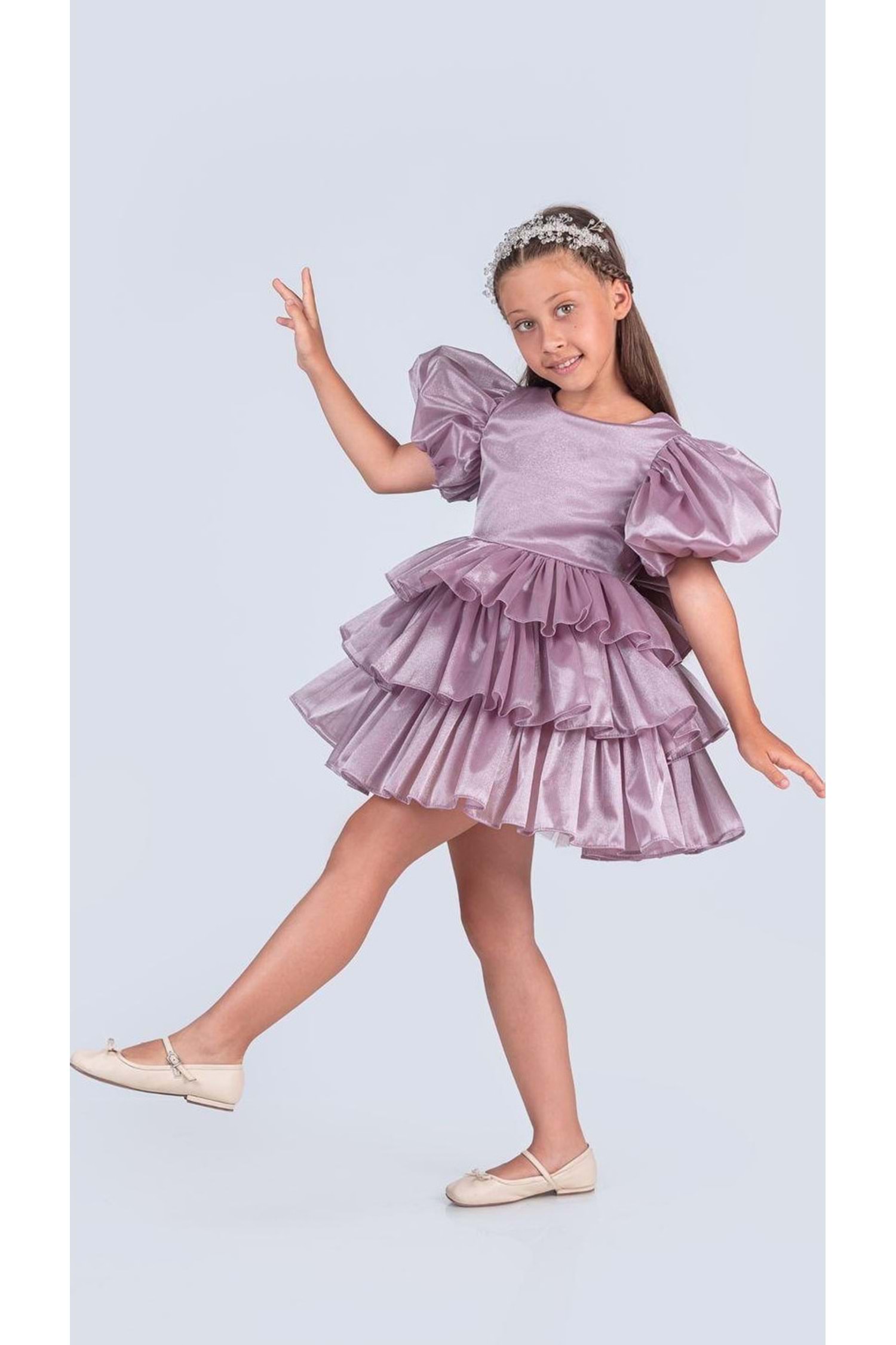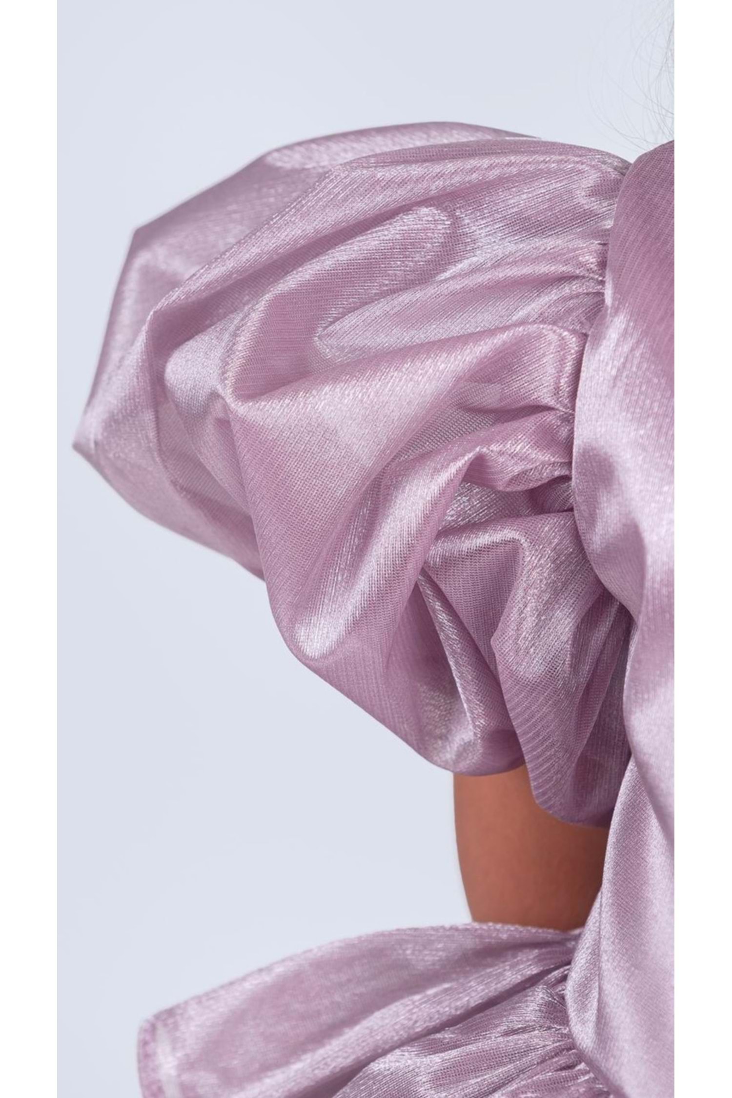 Kumaş: Parlak, hafif ve kabarık organze – kat kat volanlı görünüm için ideal