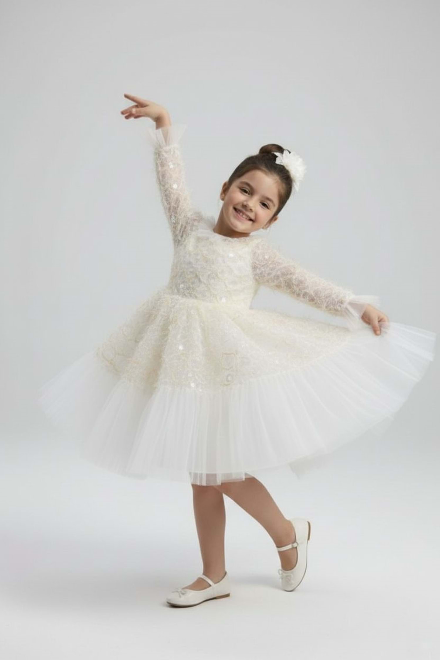 Modern İspanyol Kol: Bilek kısımlarındaki zarif tül fırfırlar ve dökümlü İspanyol kol kesimi, klasik çocuk elbiselerinden ayrılarak sofistike ve modern bir stil yaratır.