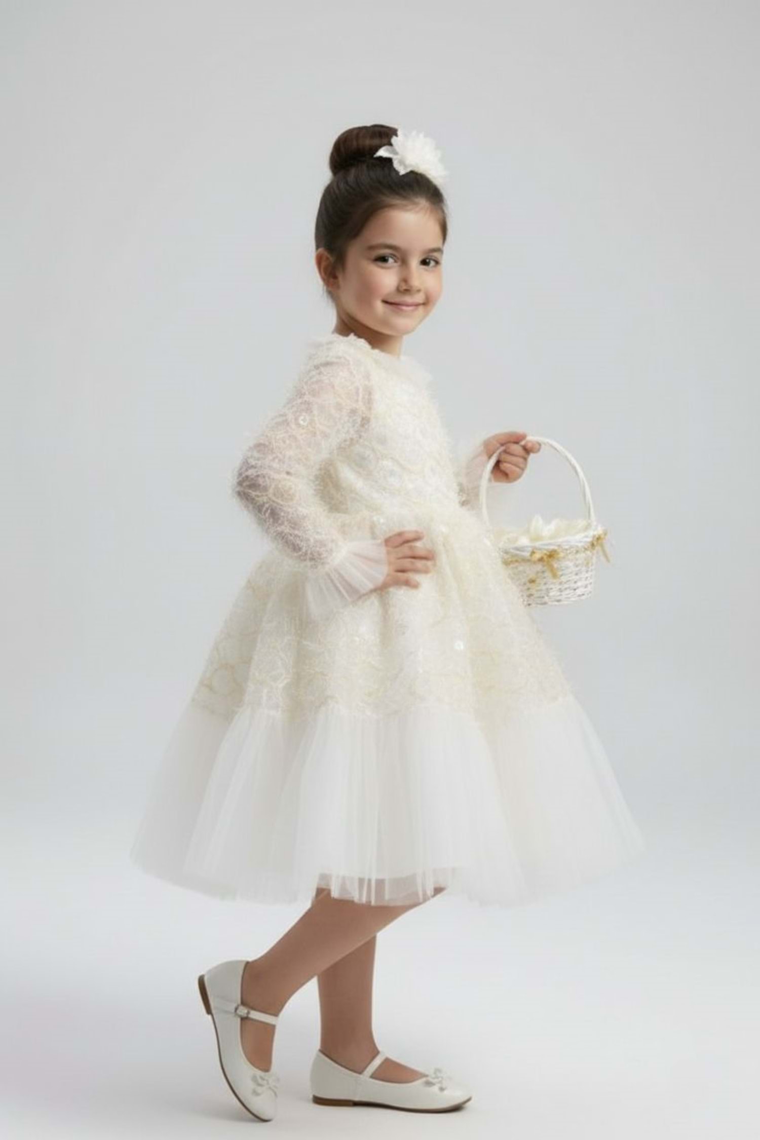 Kız Çocuk İspanyol Kol Tül Detaylı Kabarık Etekli Özel Gün Düğün Elbisesi M00793
