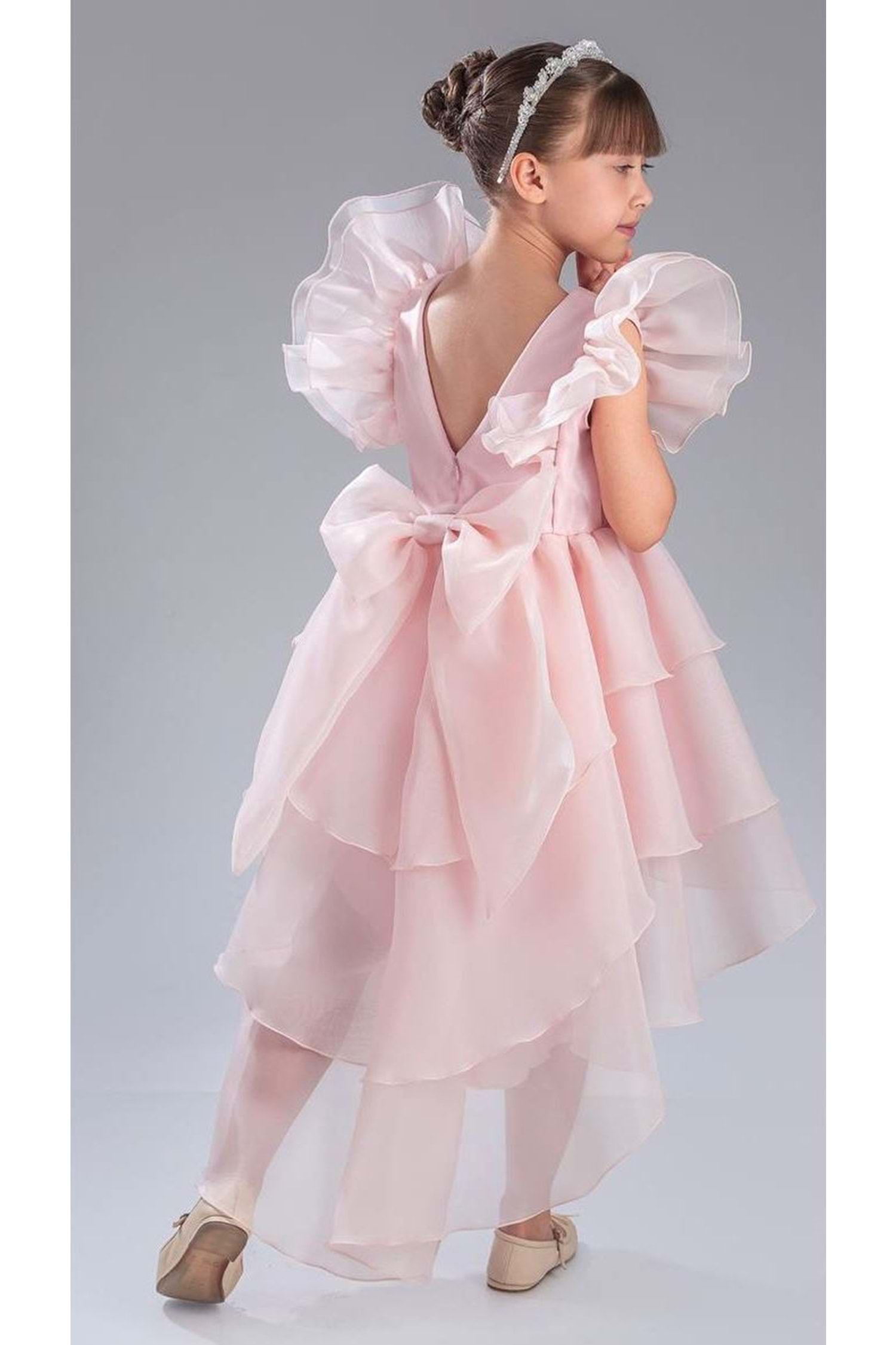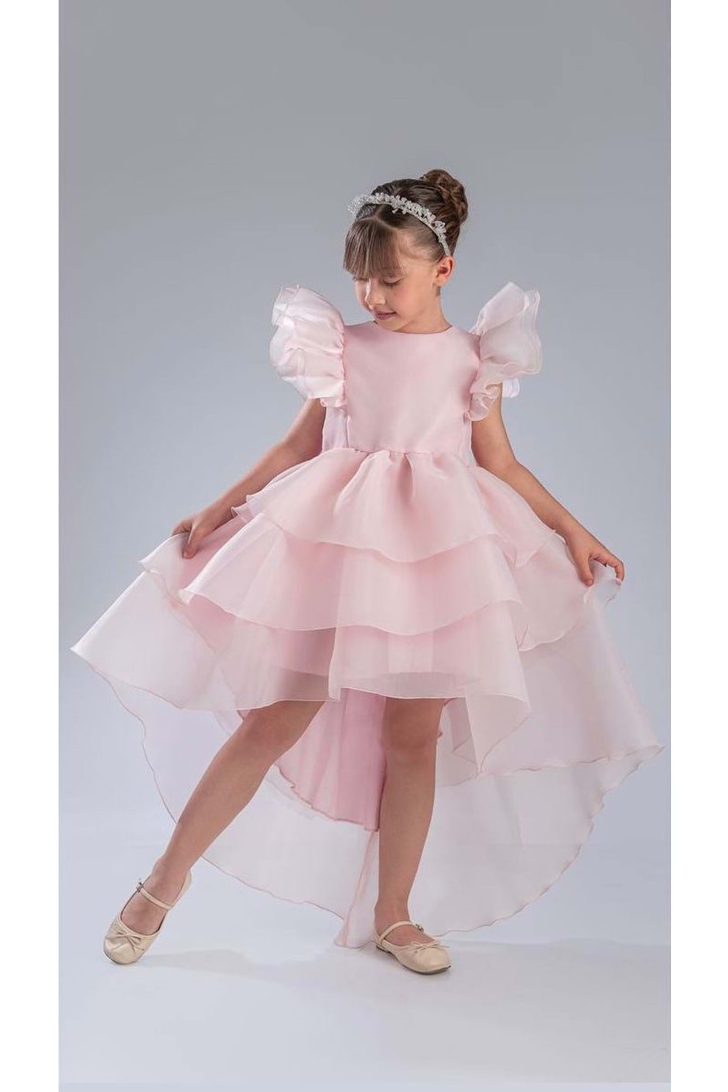Elbisenin bel kısmından başlayan kat kat tül detayları, eteğe hacimli bir görünüm kazandırırken, arkaya doğru uzayan kuyruk detayı şıklığı zirveye taşır. Kol kısmındaki kabarık fırfır detayları ise prenses temalı davetler için mükemmel bir tamamlayıcıdır. Sırt kısmında kullanılan gipeli elastik yapı hem rahatlık sağlar hem de çocuğunuzun vücuduna tam oturur.
