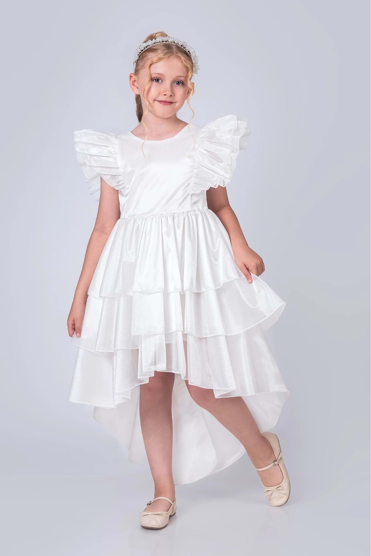 Özel günlerin vazgeçilmezi olan bu kız çocuk abiye elbise, %100 polyester kumaştan üretilmiş olup; pudra, pembe, mavi, beyaz ve krem olmak üzere beş farklı renk seçeneği ile sunulmaktadır. Işıltılı tasarımı, kat kat etek detayı ve kabarık fırfırlı kol yapısı ile her kız çocuğunun hayalini süsleyecek bu elbise, taç aksesuarı ile birlikte tamamlayıcı bir şıklık sunar.