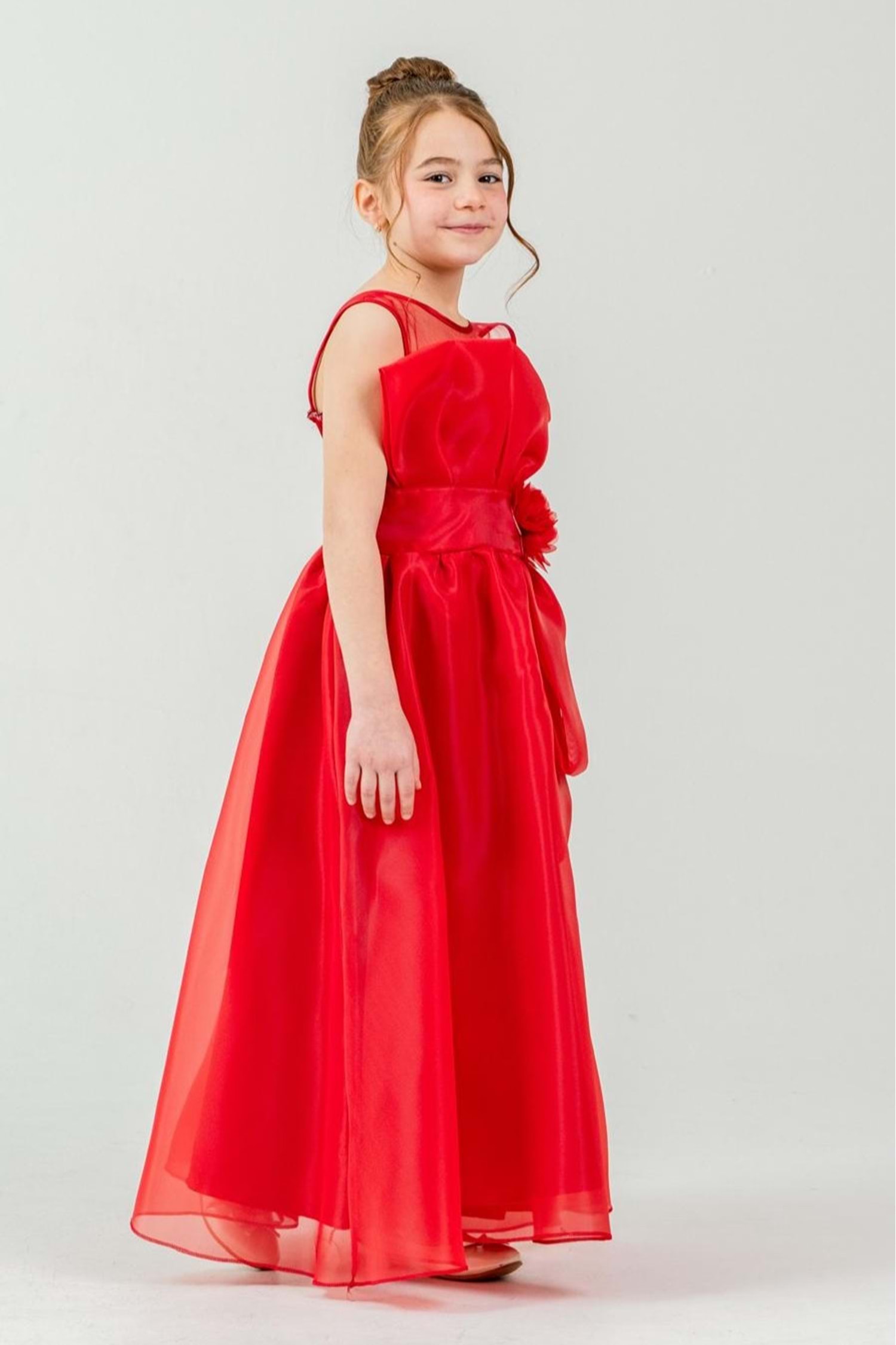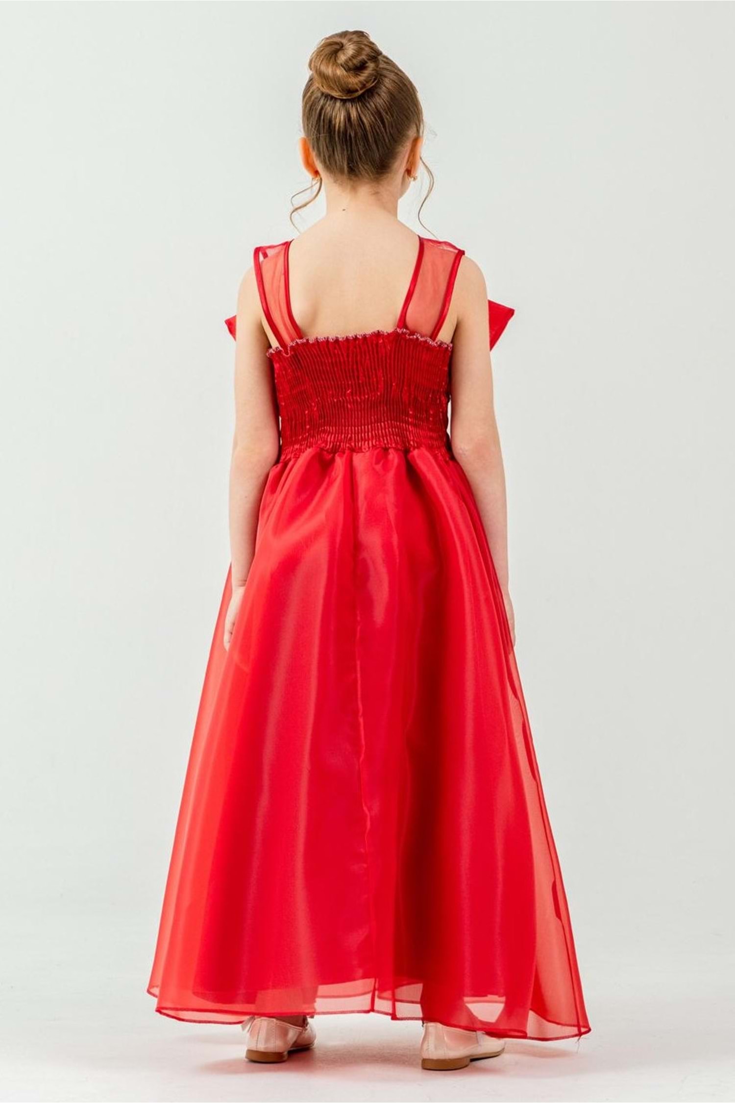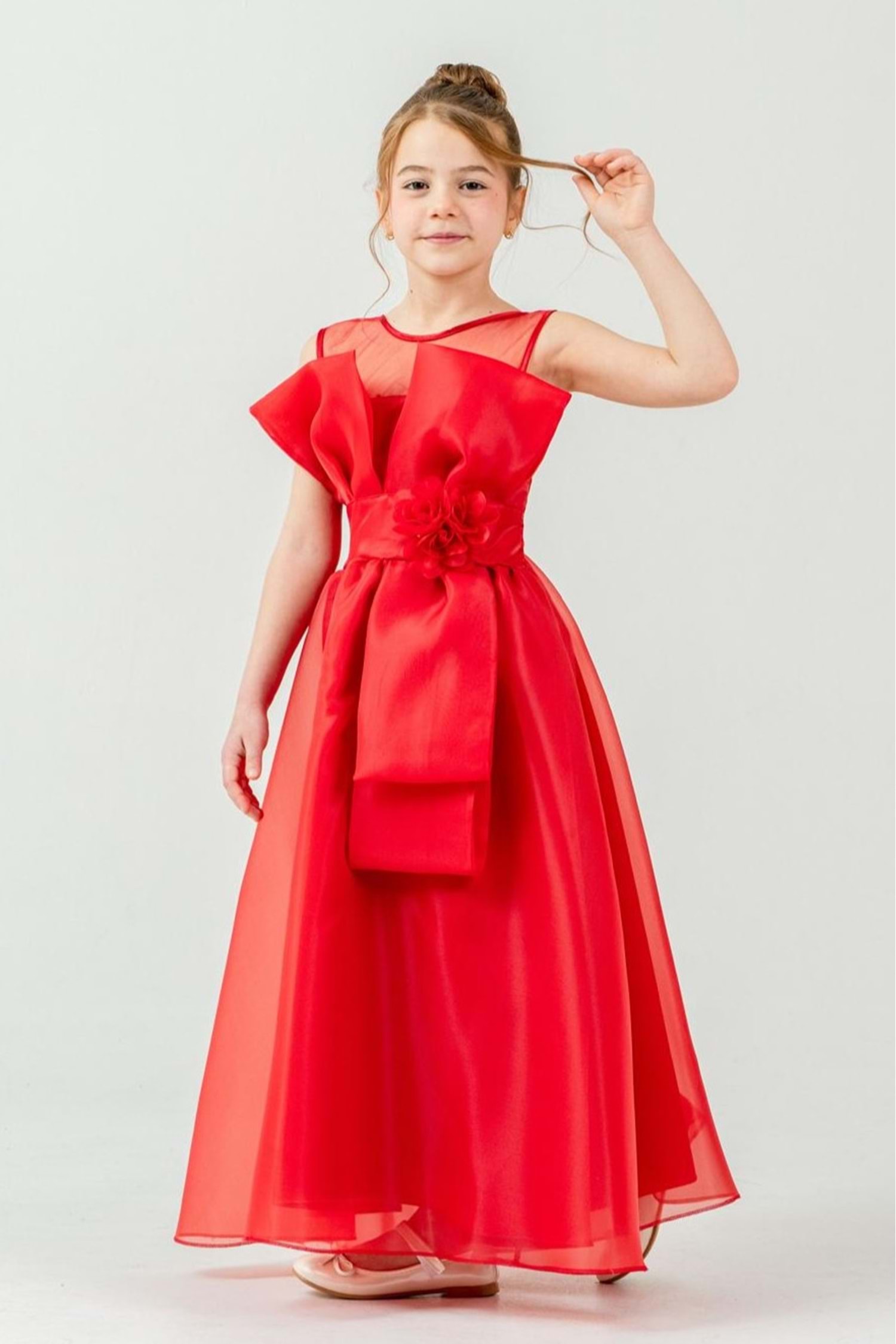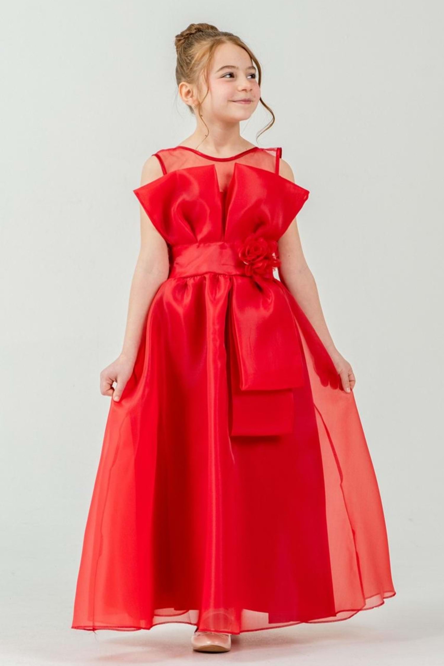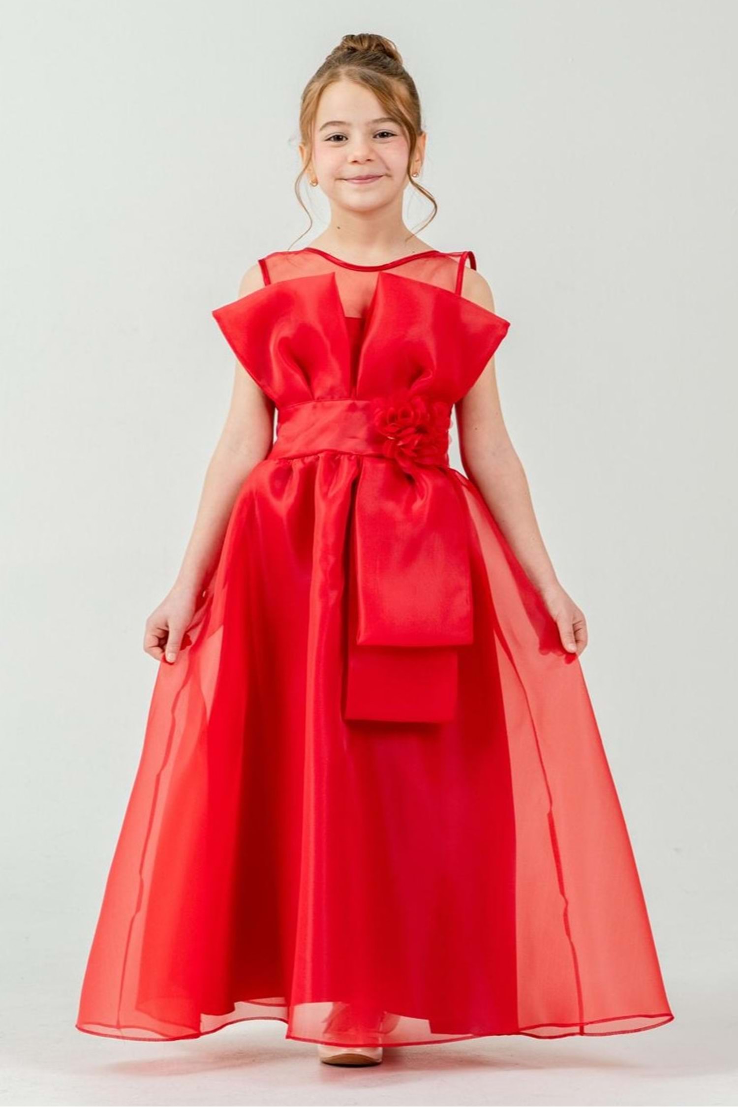 Kız Çocuk Organze Tül Çiçek ve Fiyonk Detaylı Gipe Sırtlı Prenses Abiye Elbise M00800