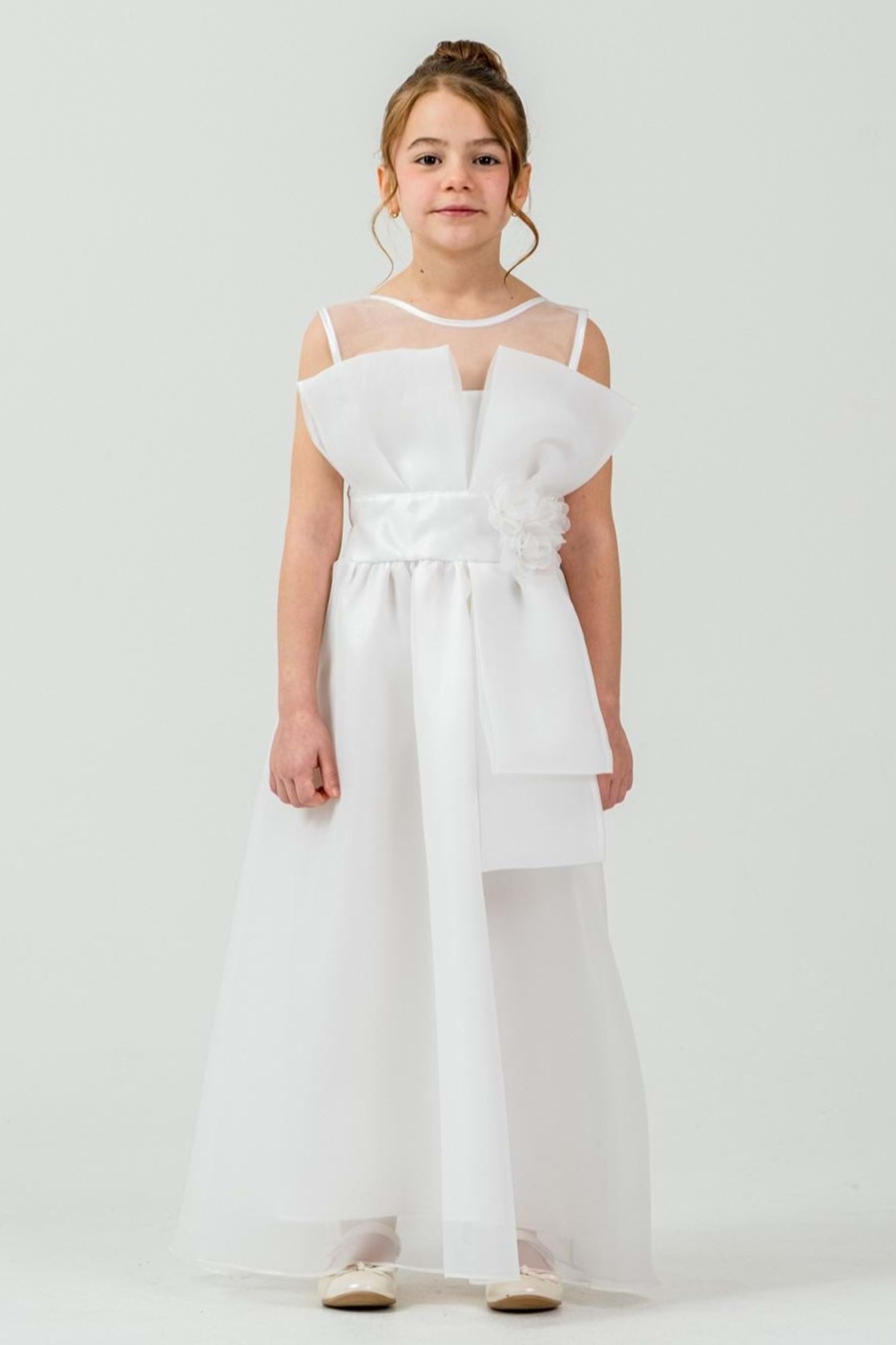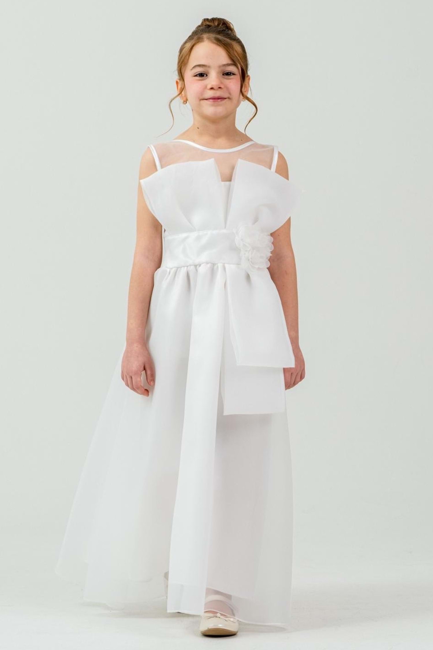 Kız Çocuk Organze Kumaş Fiyonk ve Çiçek Detaylı Gipe Sırtlı Lüks Abiye Elbise