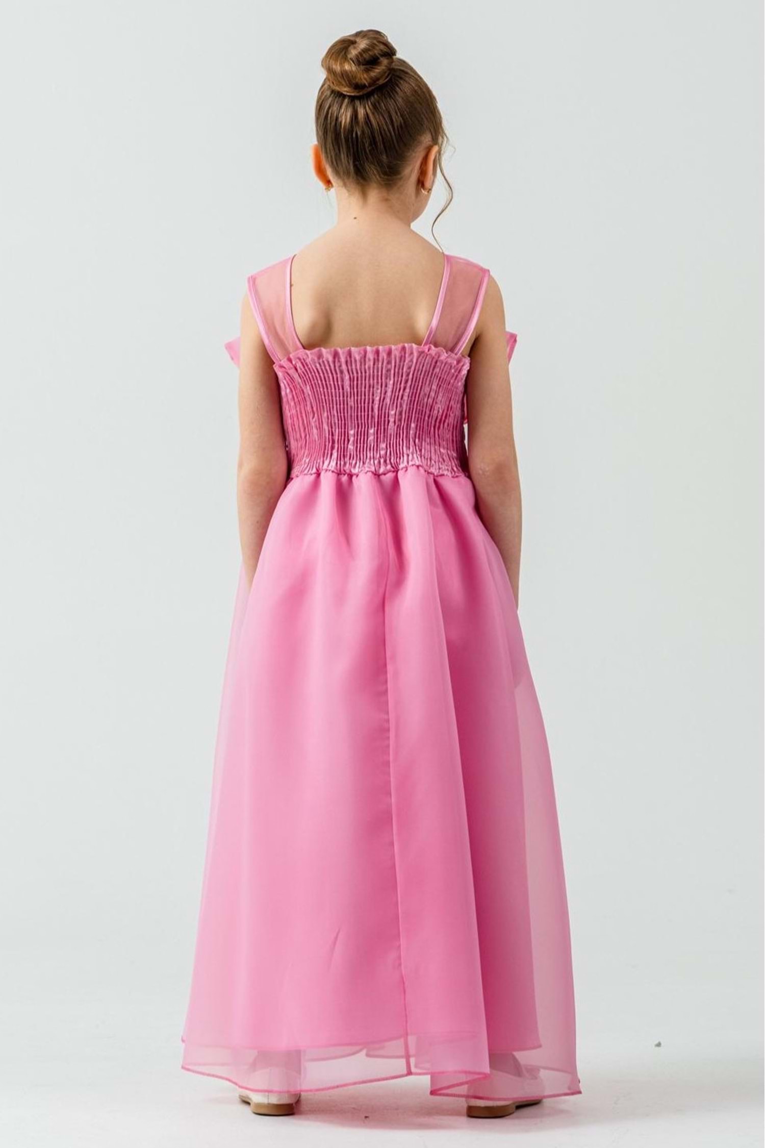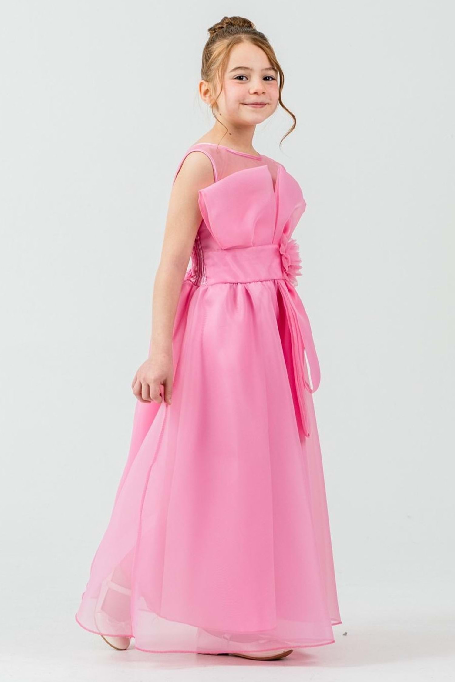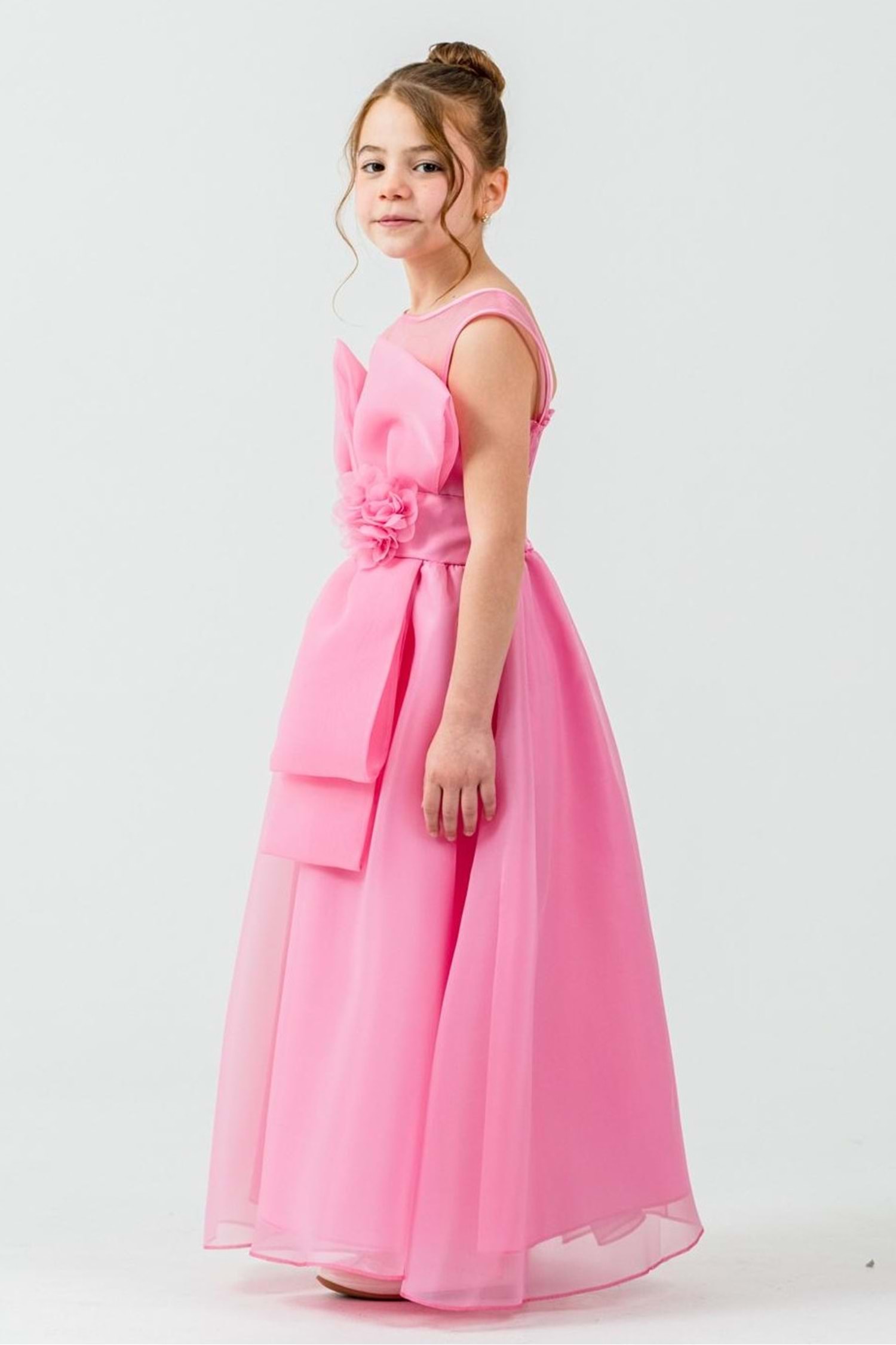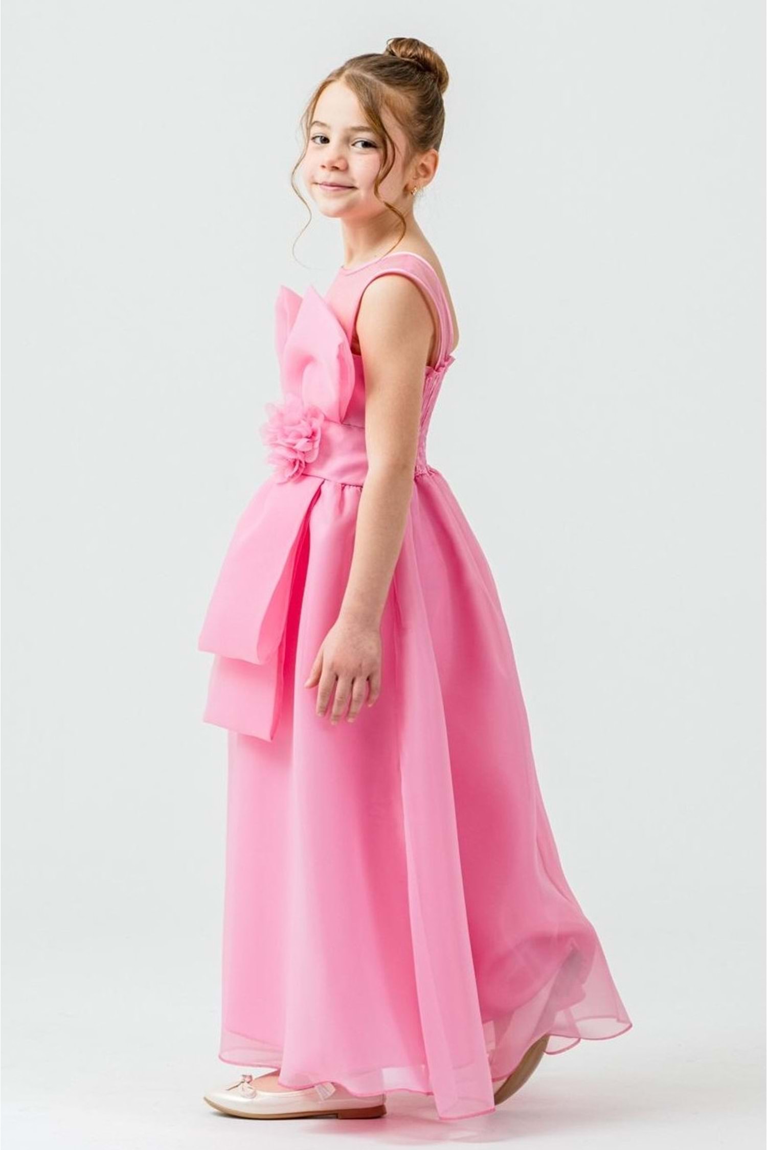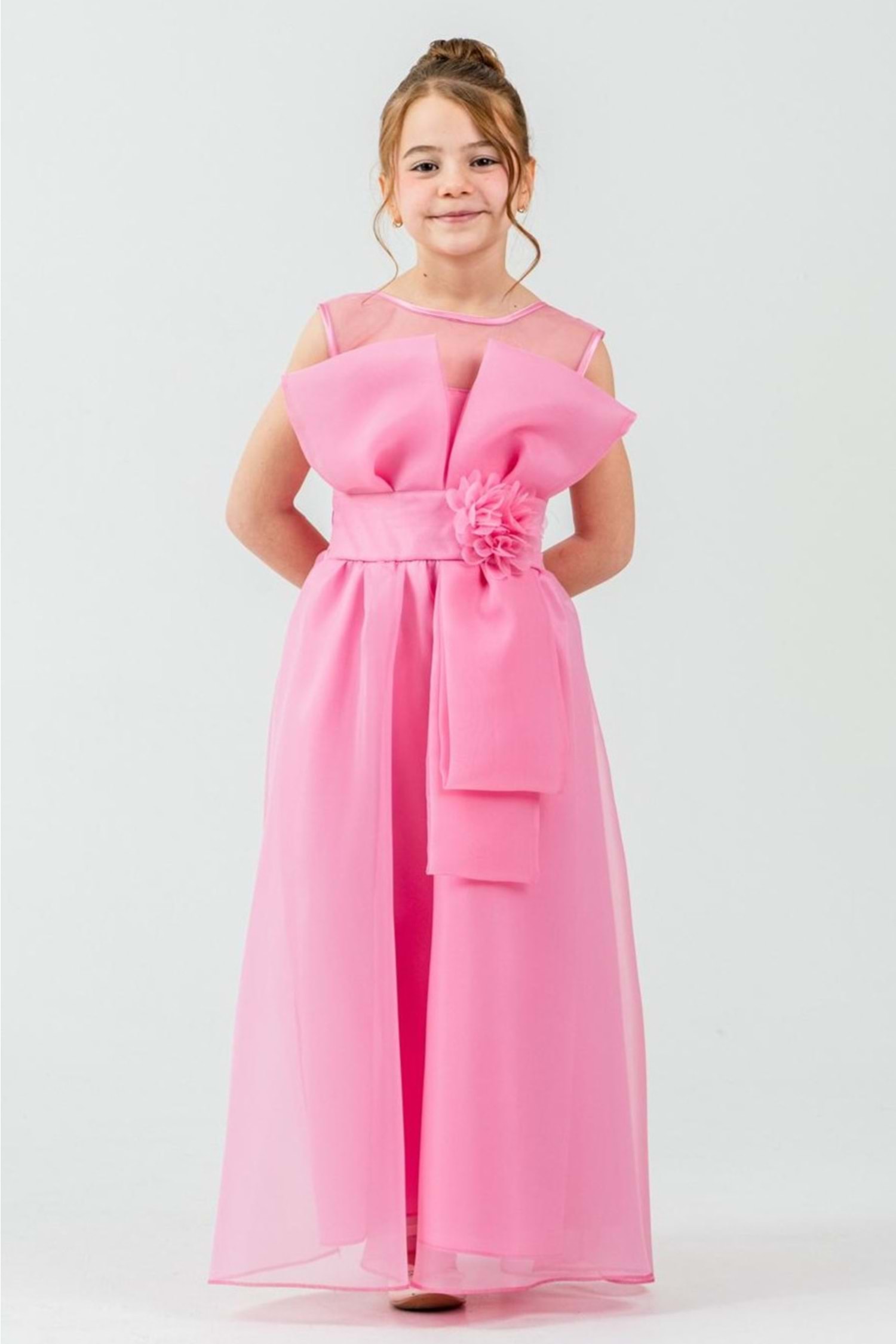 Kız Çocuk Organze Kumaş Fiyonk ve Çiçek Detaylı Gipe Sırtlı Lüks Abiye Elbise