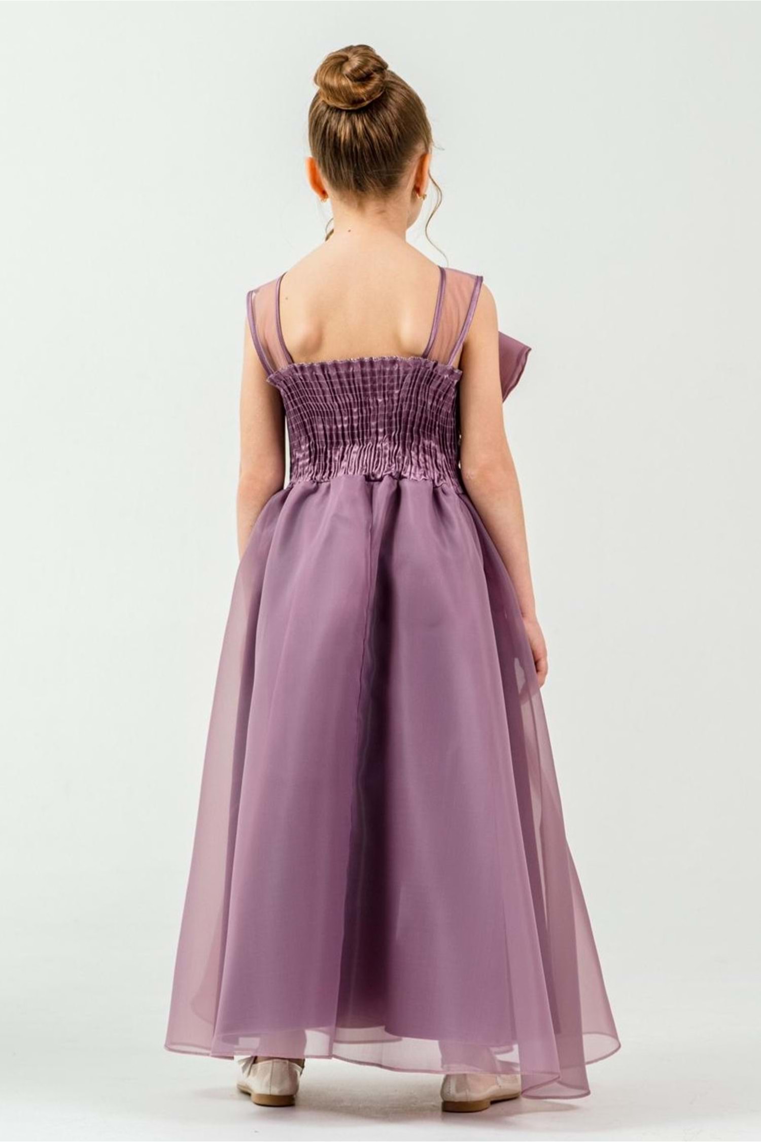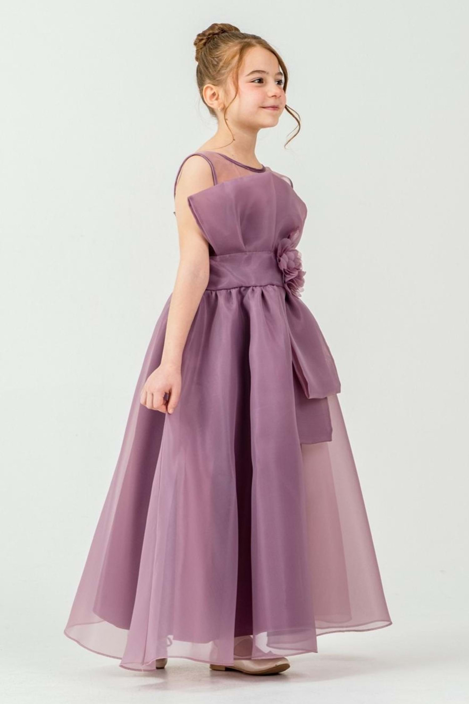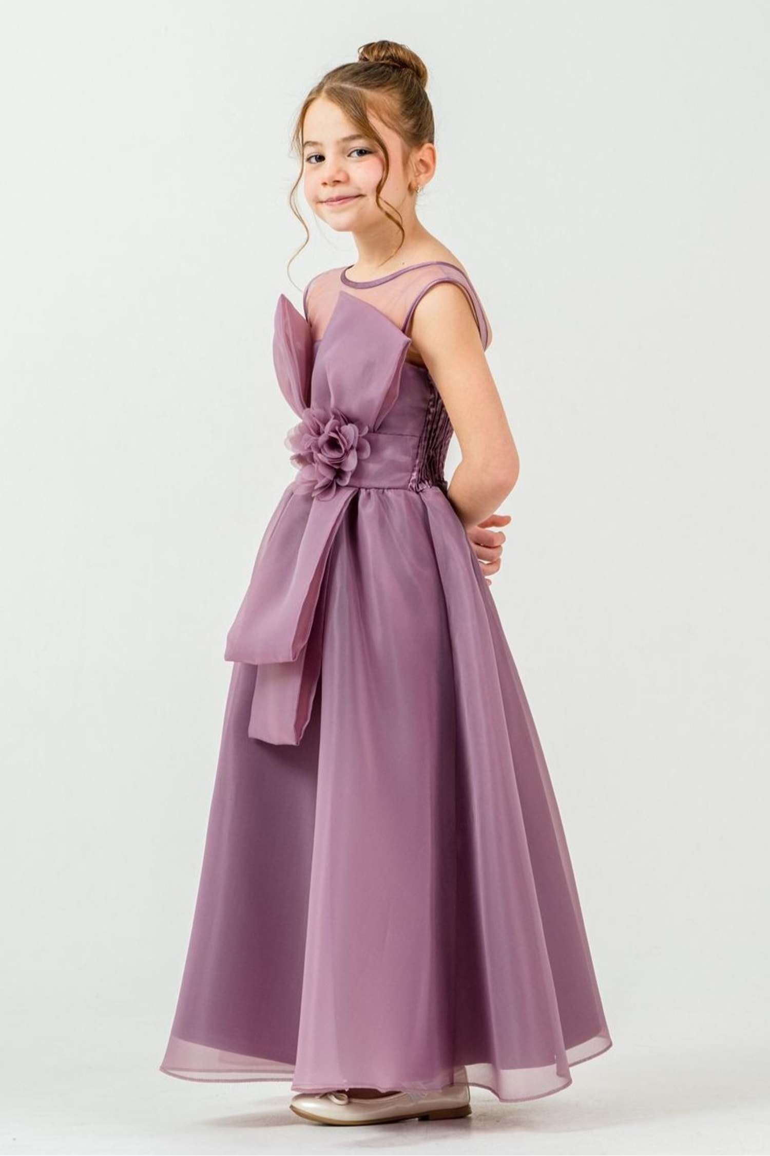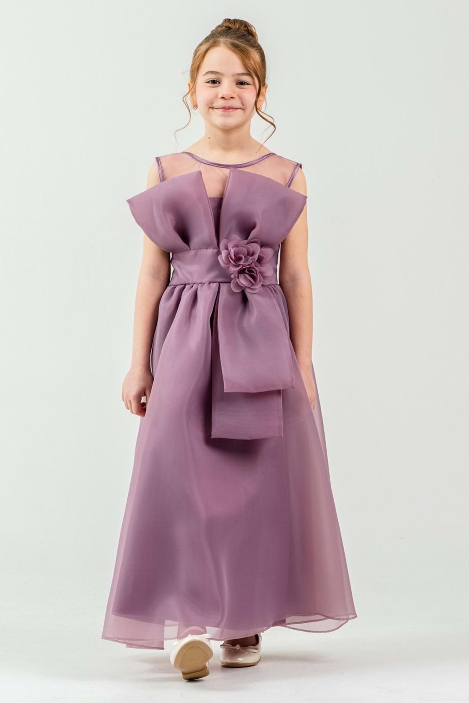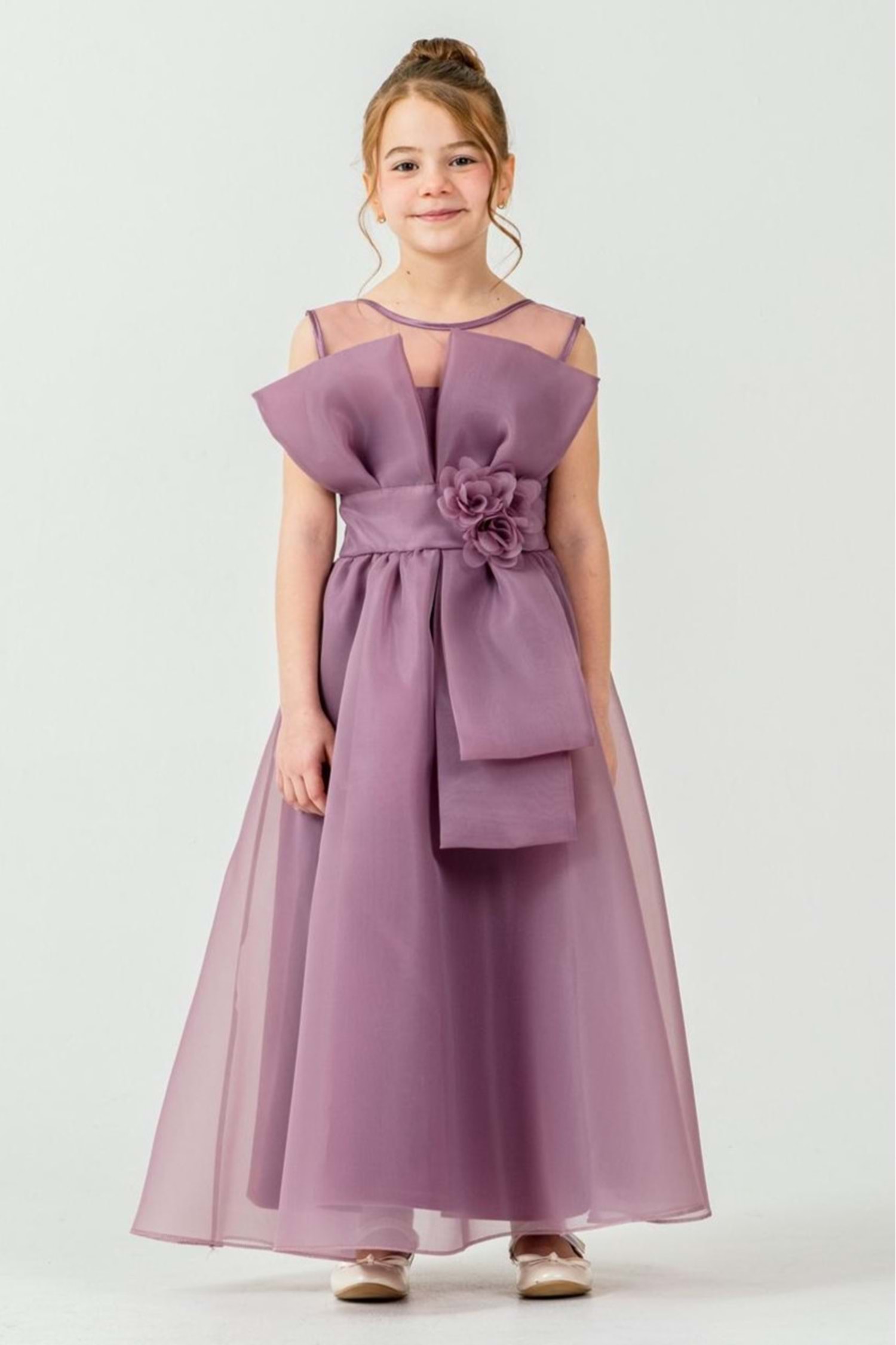 Kız Çocuk Organze Tül Çiçek ve Fiyonk Detaylı Gipe Sırtlı Prenses Abiye Elbise M00800