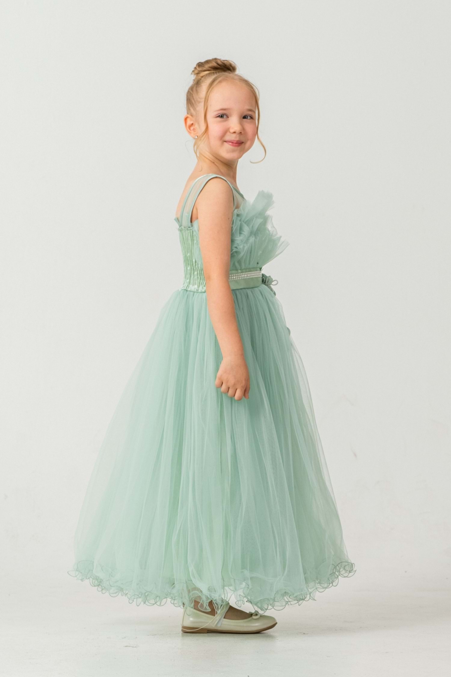 Minik prensesler için tasarlanmış robasi katlı özel gün abiye elbise, sırt kısmı gipe lastikli ve uzun etek alt kısmı astarlıdır. Düğün, mezuniyet, doğum günü veya özel günlerde rahat ve şık bir kullanım sağlar.
