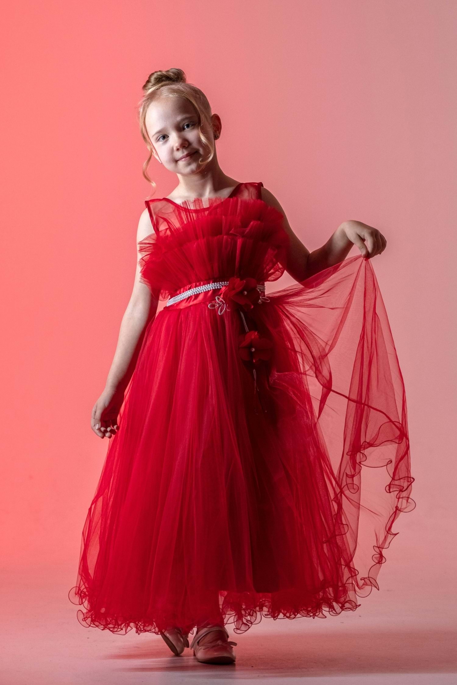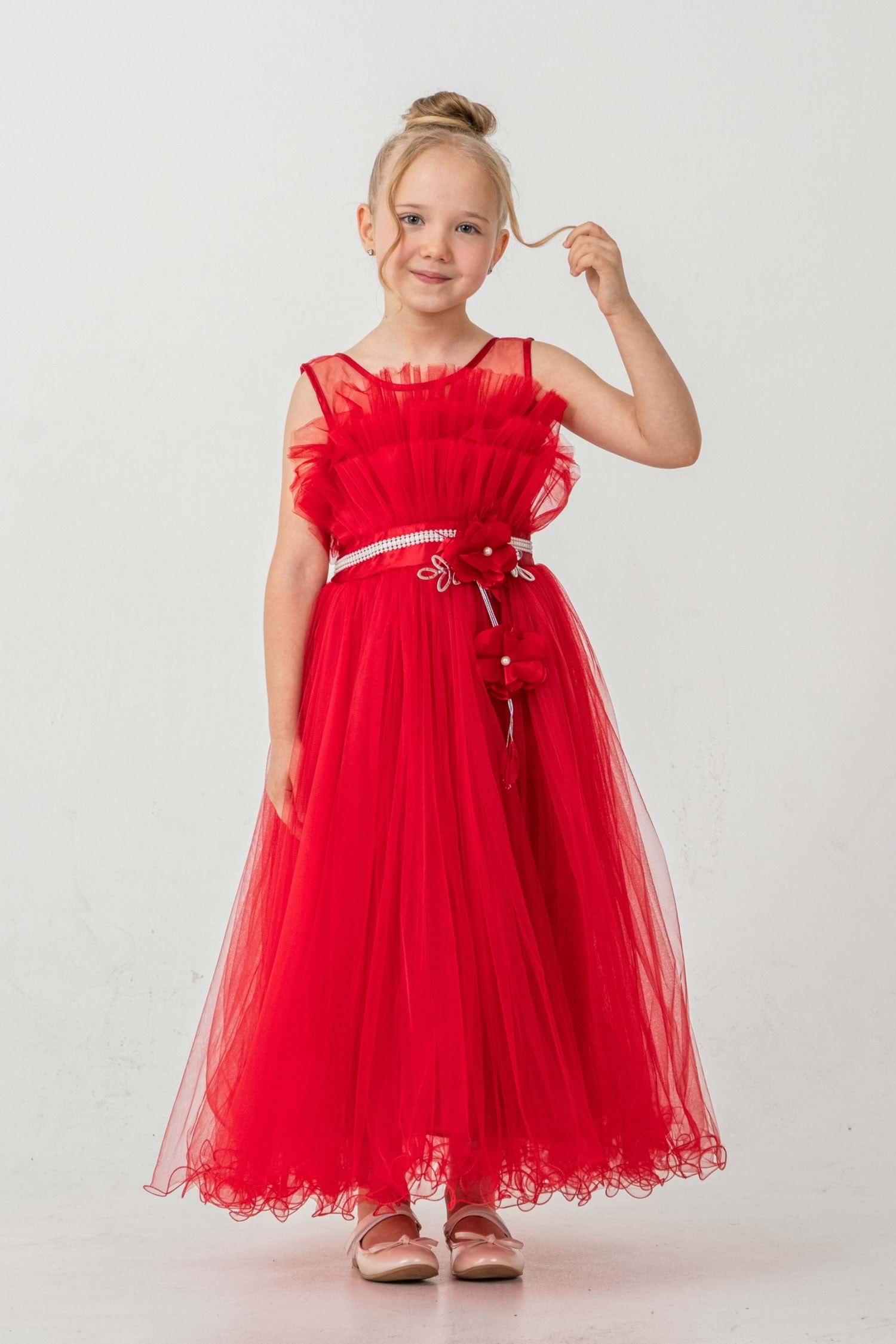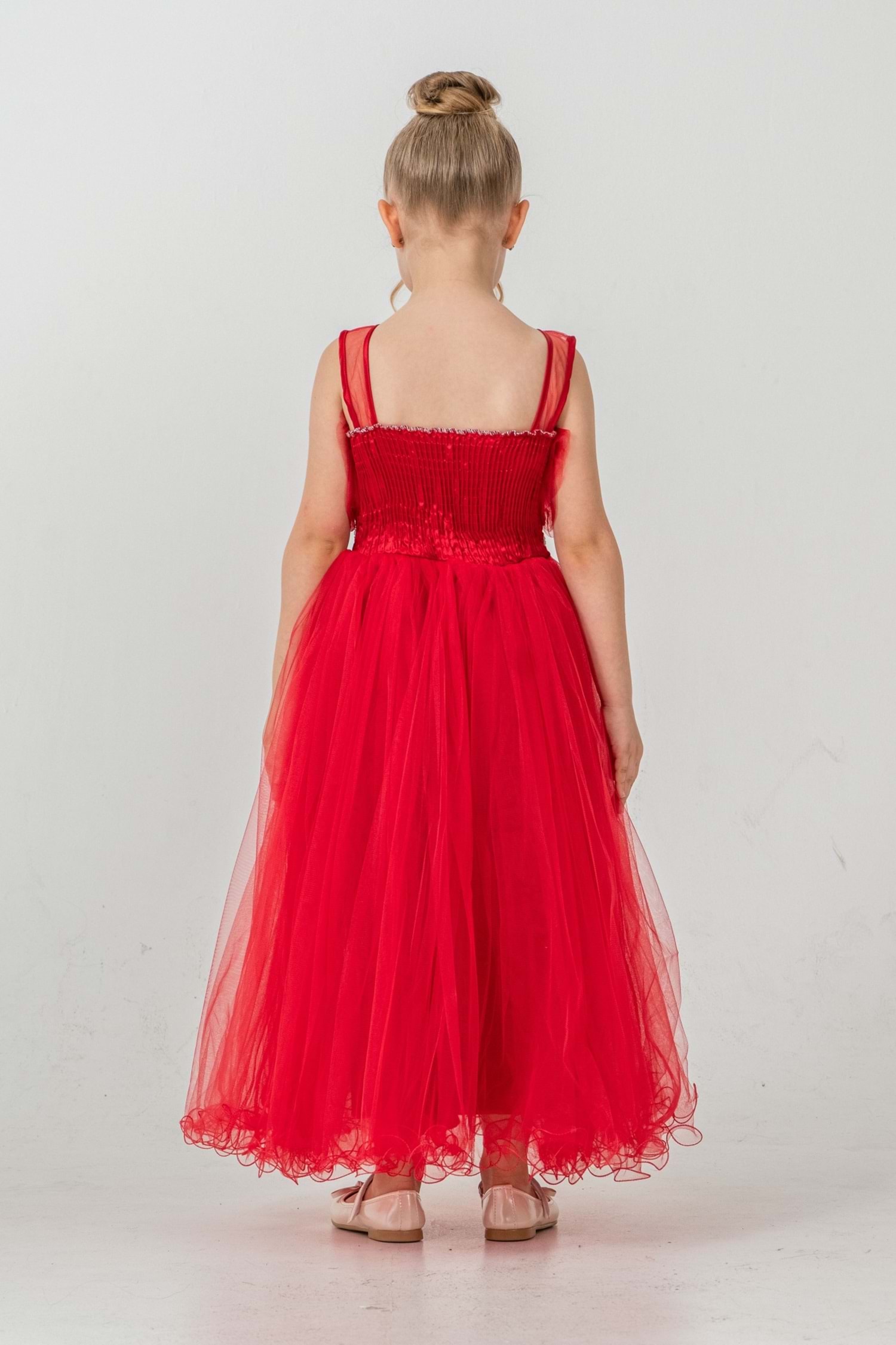 Minik prensesler için tasarlanmış robasi katlı özel gün abiye elbise, sırt kısmı gipe lastikli ve uzun etek alt kısmı astarlıdır. Düğün, mezuniyet, doğum günü veya özel günlerde rahat ve şık bir kullanım sağlar.