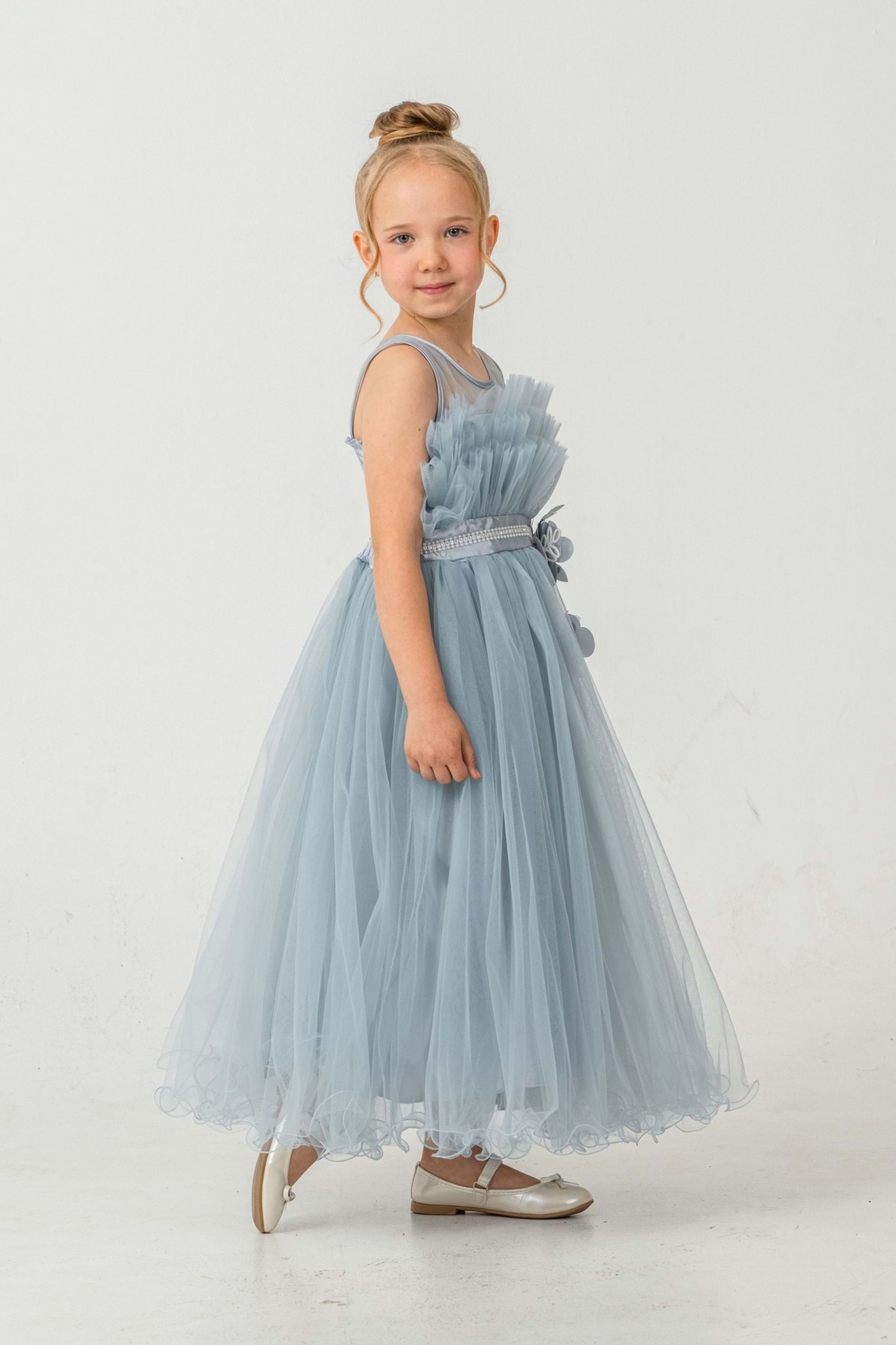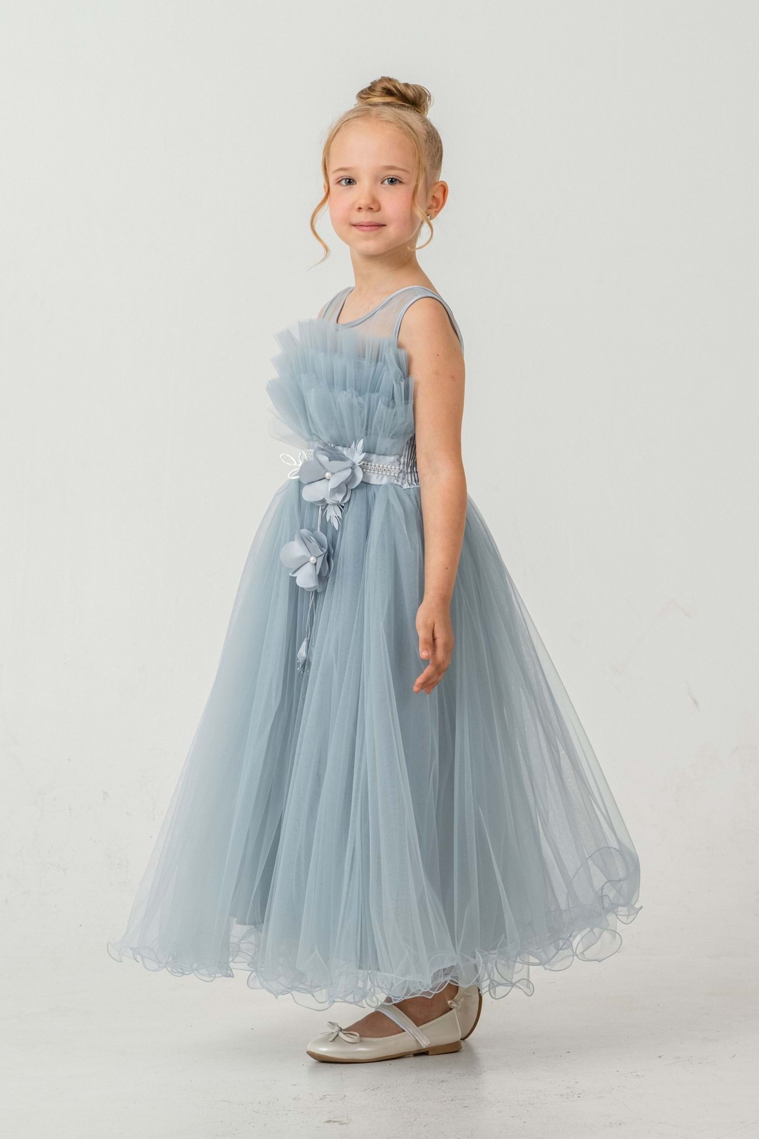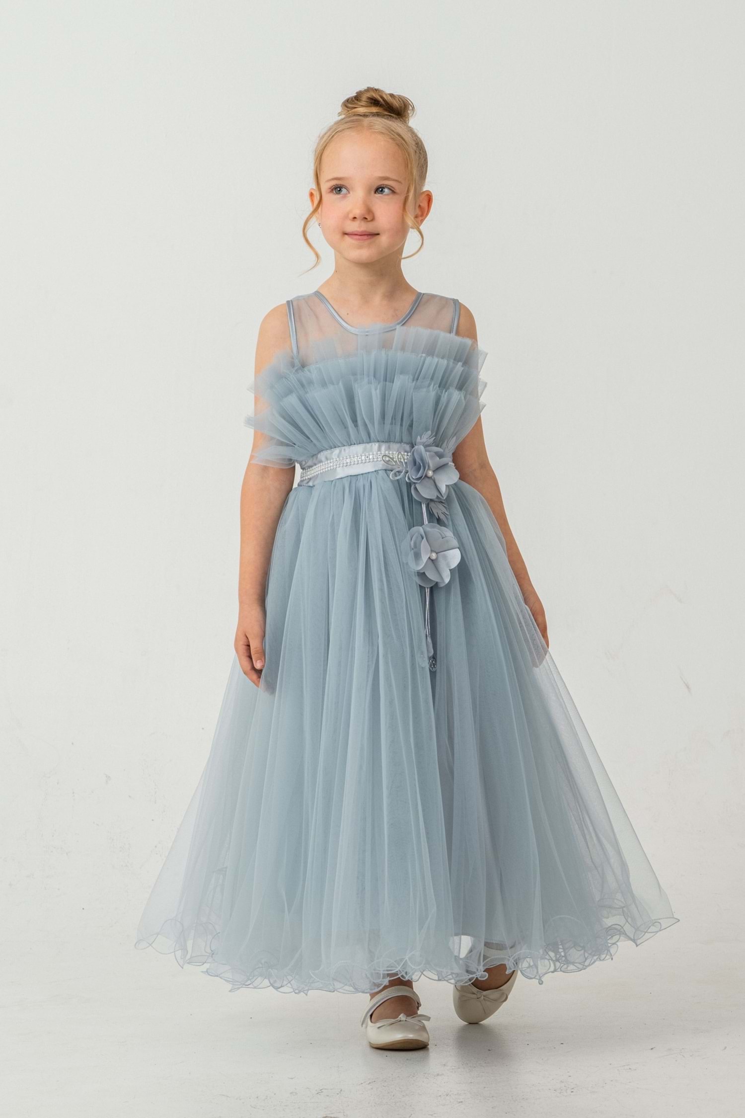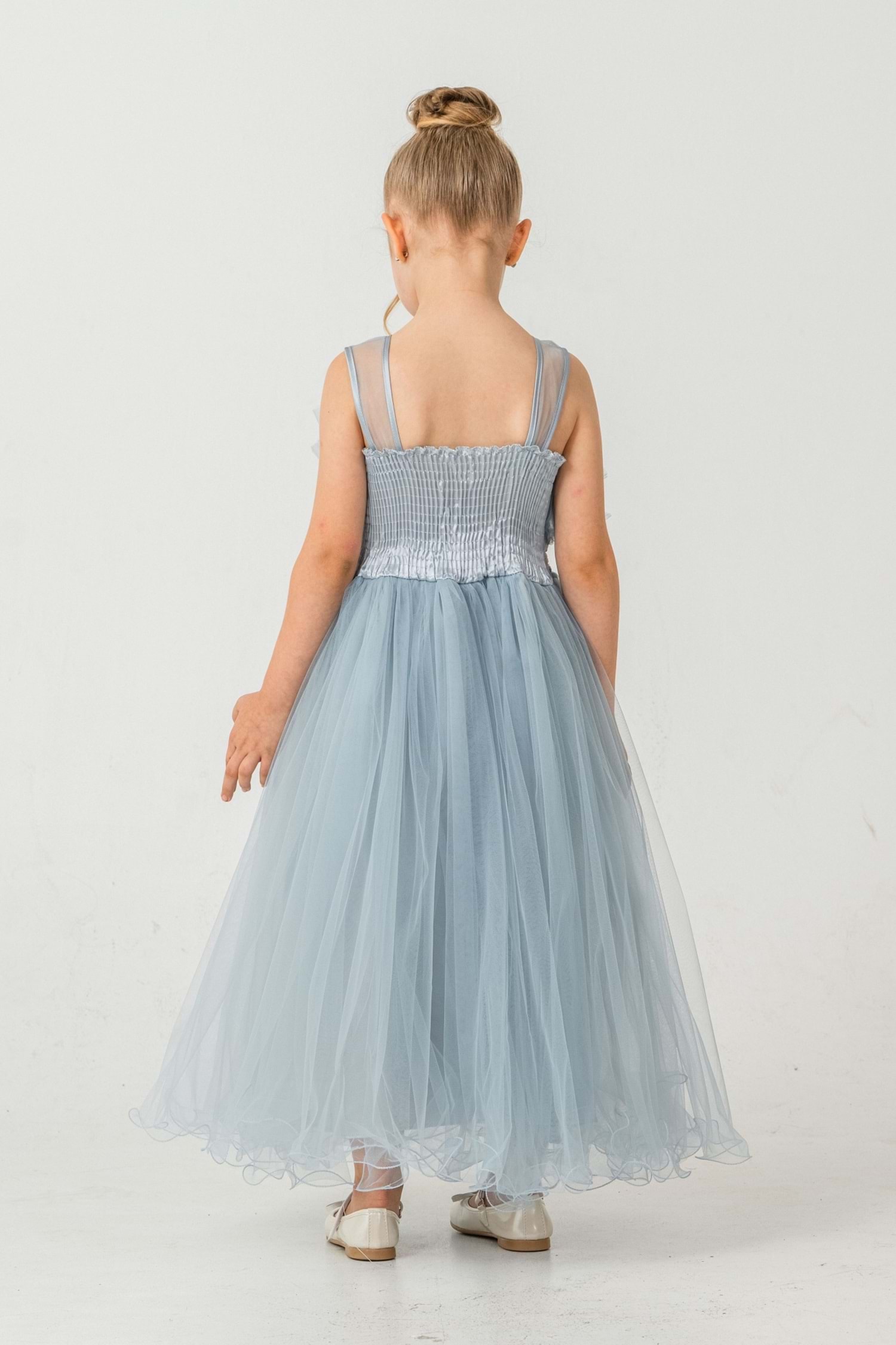 Minik prensesler için tasarlanmış robasi katlı özel gün abiye elbise, sırt kısmı gipe lastikli ve uzun etek alt kısmı astarlıdır. Düğün, mezuniyet, doğum günü veya özel günlerde rahat ve şık bir kullanım sağlar.