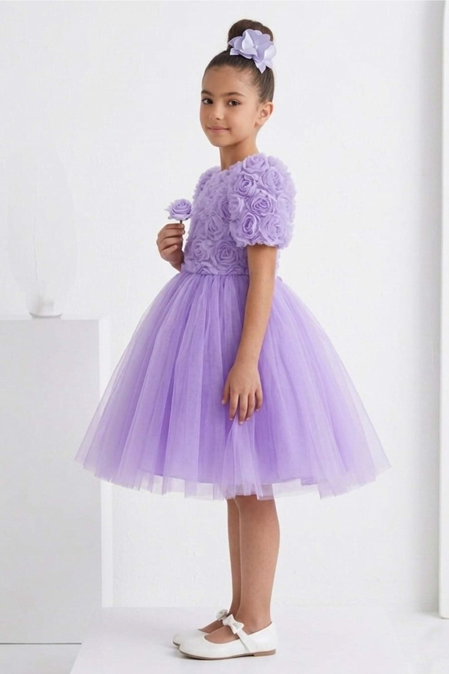 Kız Çocuk Lase Kumaş Kısa Kol Gül Detaylı Saç Tokalı Luvia Tütü Elbise