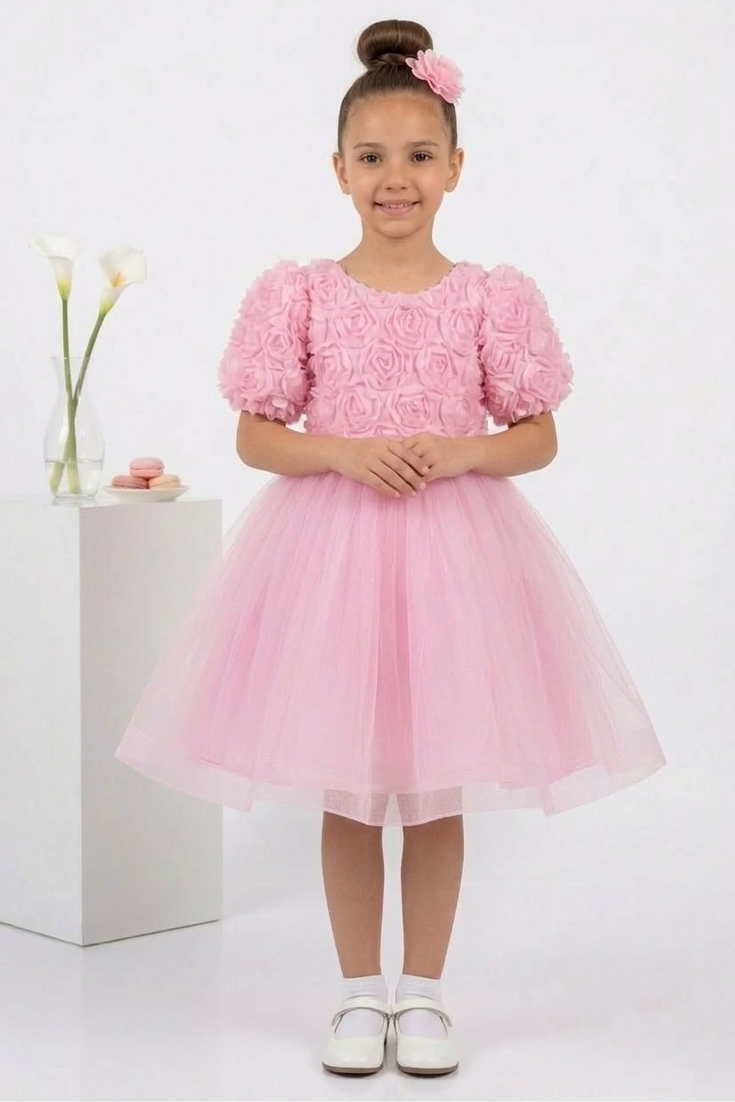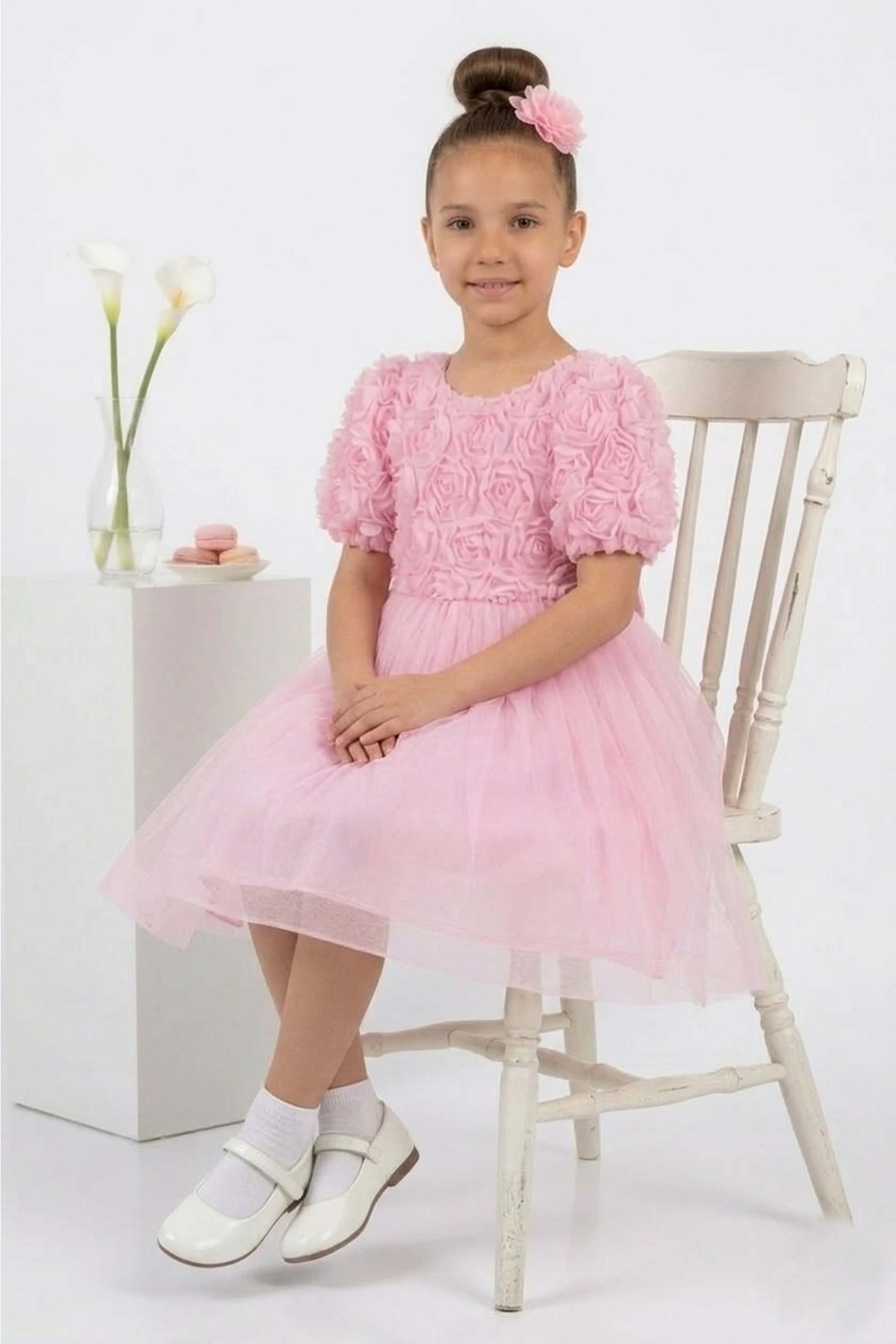Kız Çocuk Lase Kumaş Kısa Kol Gül Detaylı Saç Tokalı Luvia Tütü Elbise