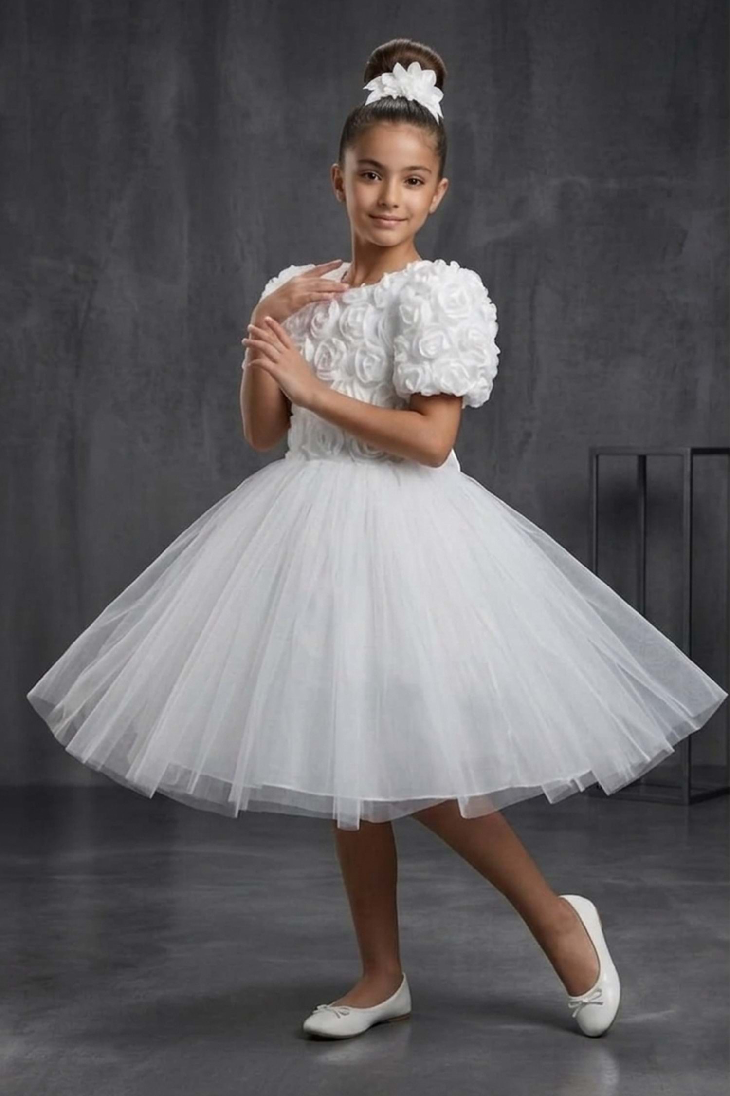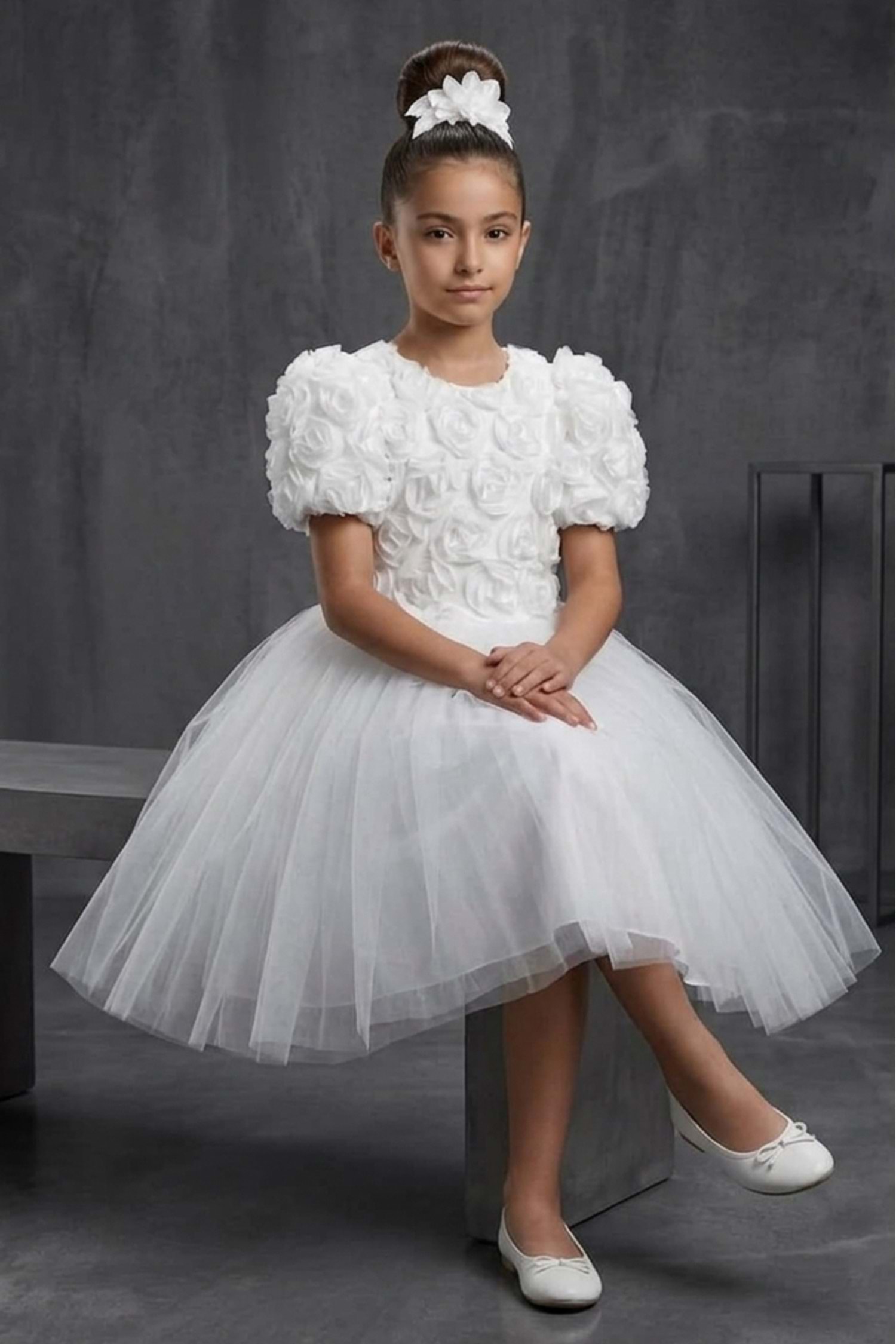 Kız Çocuk Lase Kumaş Kısa Kol Gül Detaylı Saç Tokalı Luvia Tütü Elbise